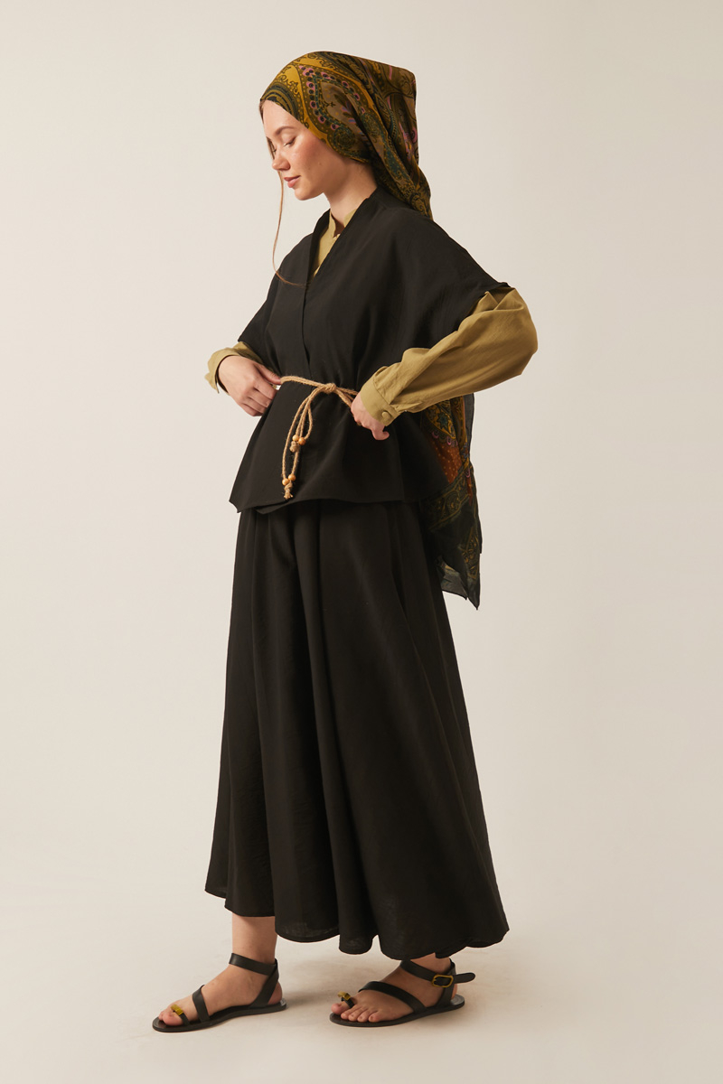 Hasır Biyeli Etek Takım Siyah. Yelek: düşük omuzludur, kısa kolludur, sivri uçlu şal yakadır, belden hasır biye kemerlidir, Etek: Kloş kesimdir, ön belden pile detaylıdır, yandan fermuarlıdır, arka belden lastiklidir, yandan gizli fermuarlıdır, ceplidir, astarsızdır, Günlük kullanım ve özel günlerinizde tercih edebilirsiniz.