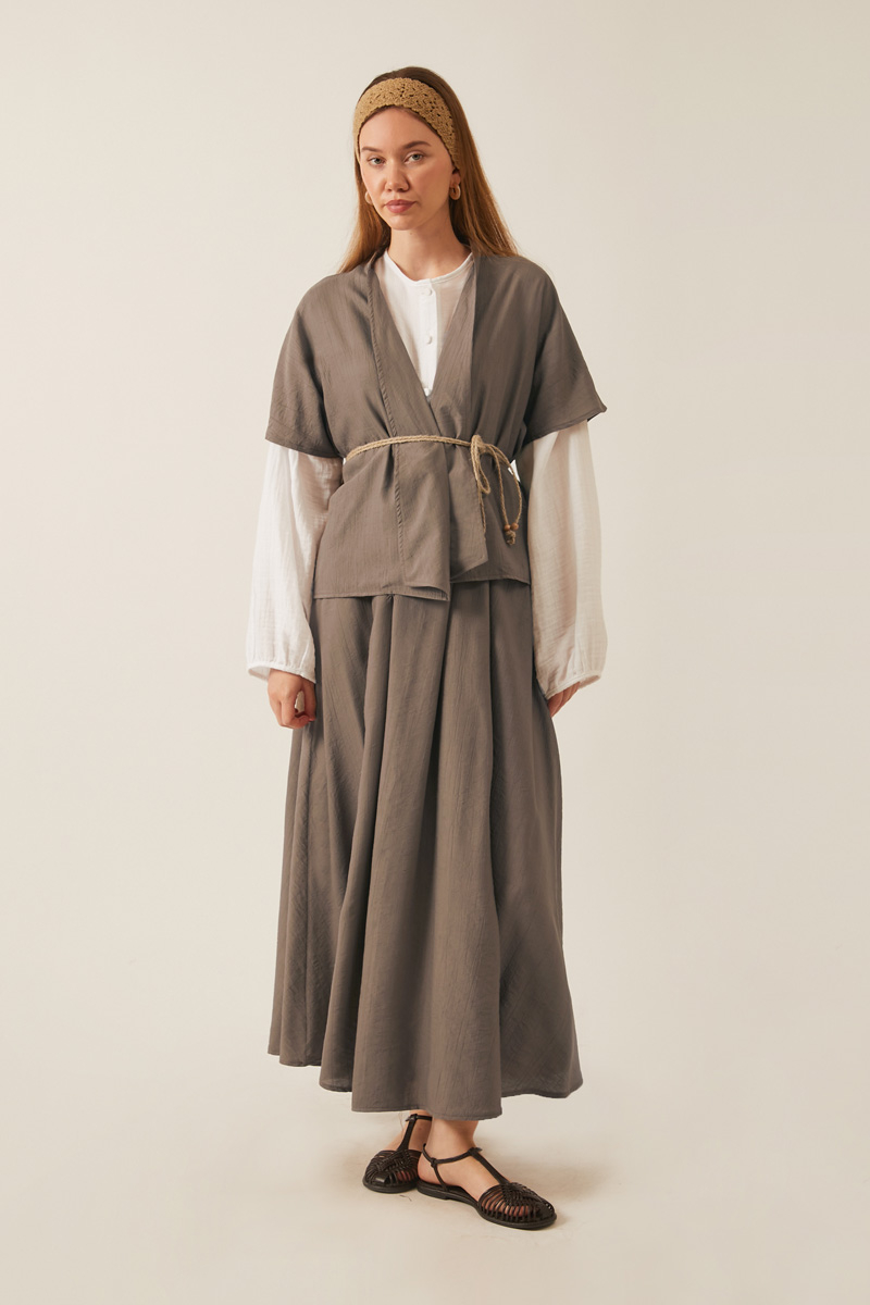 Hasır Biyeli Etek Takım Toprak. Yelek: düşük omuzludur, kısa kolludur, sivri uçlu şal yakadır, belden hasır biye kemerlidir, Etek: Kloş kesimdir, ön belden pile detaylıdır, yandan fermuarlıdır, arka belden lastiklidir, yandan gizli fermuarlıdır, ceplidir, astarsızdır, Günlük kullanım ve özel günlerinizde tercih edebilirsiniz.
