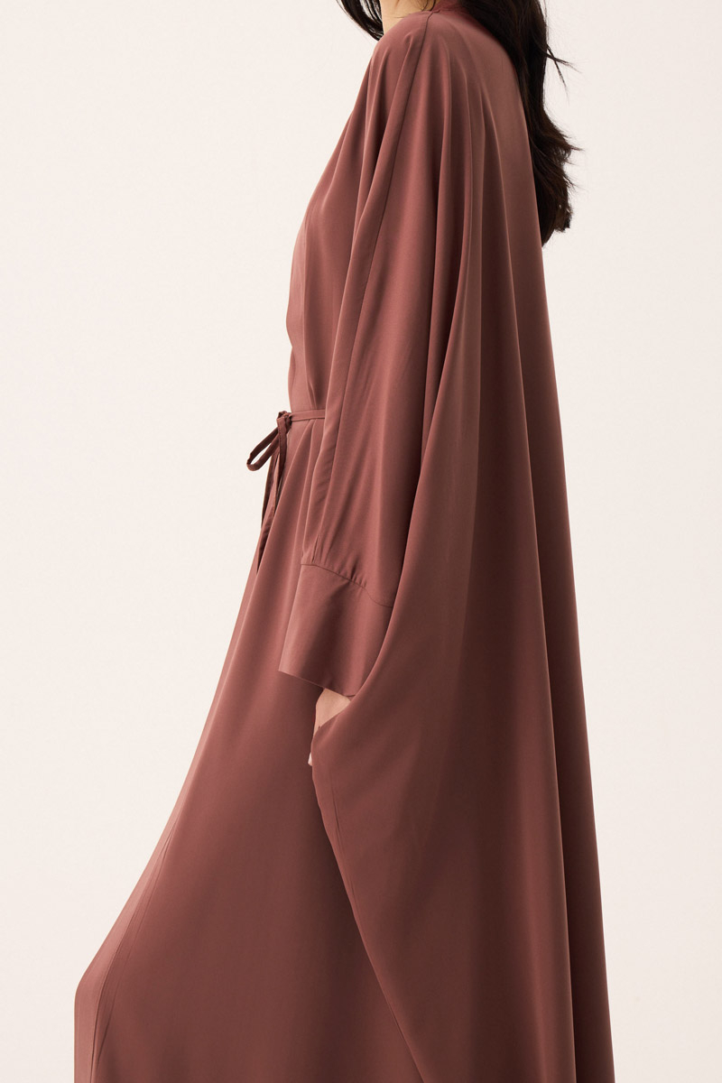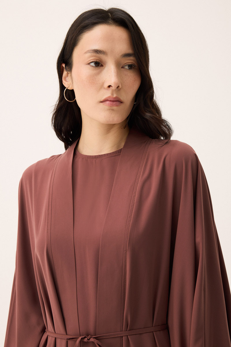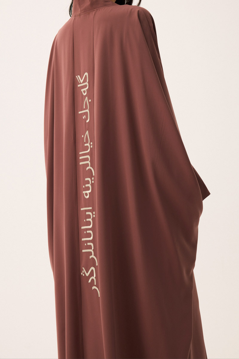 Hayal Abaya Takım Kiremit. Abaya önde fleto ilik ve ince ip biyesi bulunmaktadır yarasa kolludur, yandan ceplidir, Geniş manşetlidir, Arkası Osmanlıca Nakış detaylıdır. Nakışın Anlamı: “Gelecek hayallerine inananlarındır.'' astarsız. İçliği bisiklet yakadır, arkadan gizli fermuarlıdır. Günlük kullanım ve özel günlerinizde tercih edebilirsiniz.