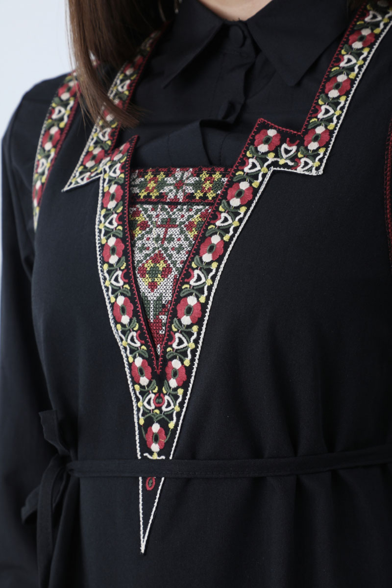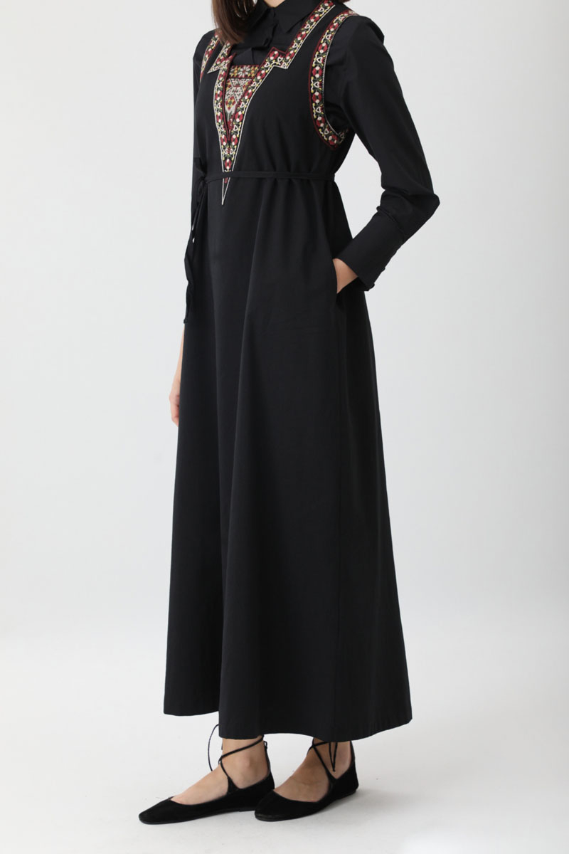 This sleeveless dress features wide straps and a flattering V-neckline. Ethnic embroidery details adorn the neckline and arm openings, adding a touch of artisanal charm. Designed with a matching tie belt at the waist and practical side pockets, it is unlined and ideal for both everyday wear and special occasions.