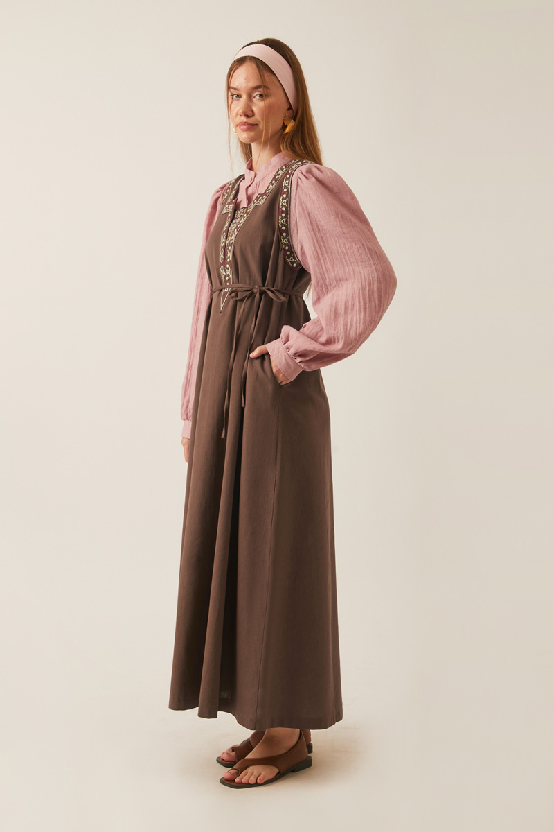 This sleeveless dress features wide straps and a flattering V-neckline. Ethnic embroidery details adorn the neckline and arm openings, adding a touch of artisanal charm. Designed with a matching tie belt at the waist and practical side pockets, it is unlined and ideal for both everyday wear and special occasions.