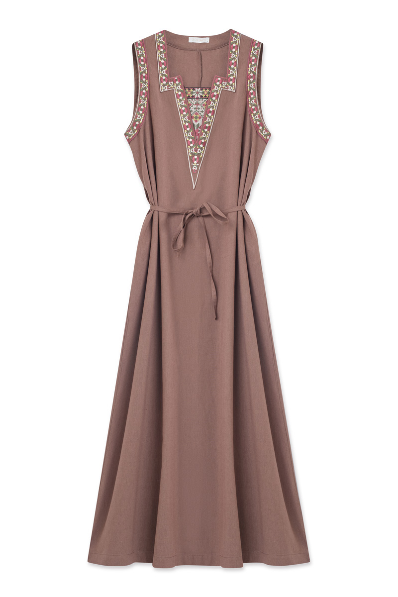 This sleeveless dress features wide straps and a flattering V-neckline. Ethnic embroidery details adorn the neckline and arm openings, adding a touch of artisanal charm. Designed with a matching tie belt at the waist and practical side pockets, it is unlined and ideal for both everyday wear and special occasions.