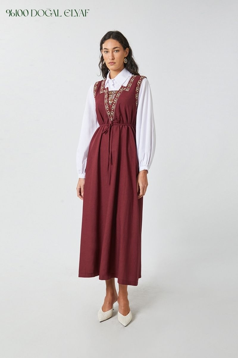 Hazal Etnik Nakışlı Jile Bordo. Kalın askılıdır, V yakadır, yakası ve kollu etnik nakış detaylıdır, belden biye kuşaklıdır, yandan ceplidir, astarsızdır. Günlük kullanım ve özel günlerinizde tercih edebilirsiniz.