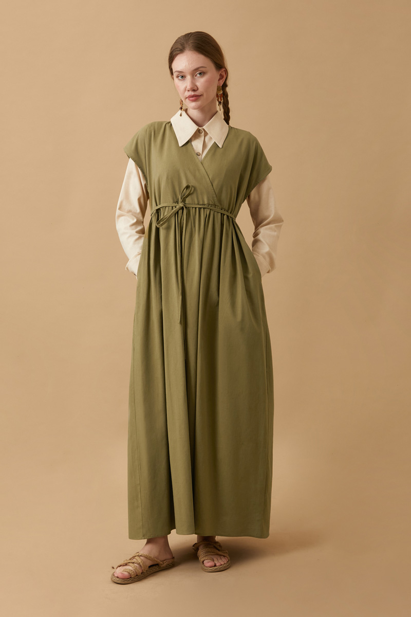 Helen Keten Jile Haki. Kruvaze yakadır, düşük omuzludur, belden büzgü detaylıdır, yandan ceplidir, astarsızdır. biye kuşaklıdır, Günlük kullanım ve özel günlerinizde tercih edebilirsiniz.