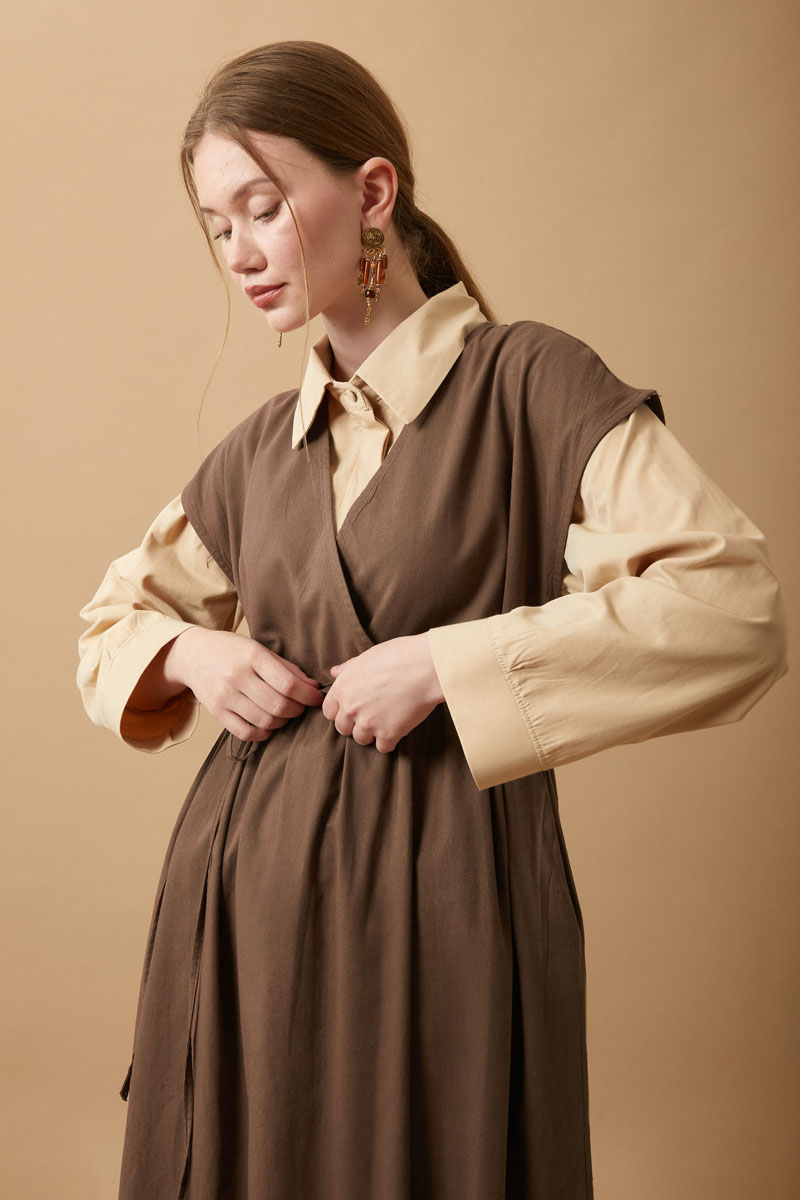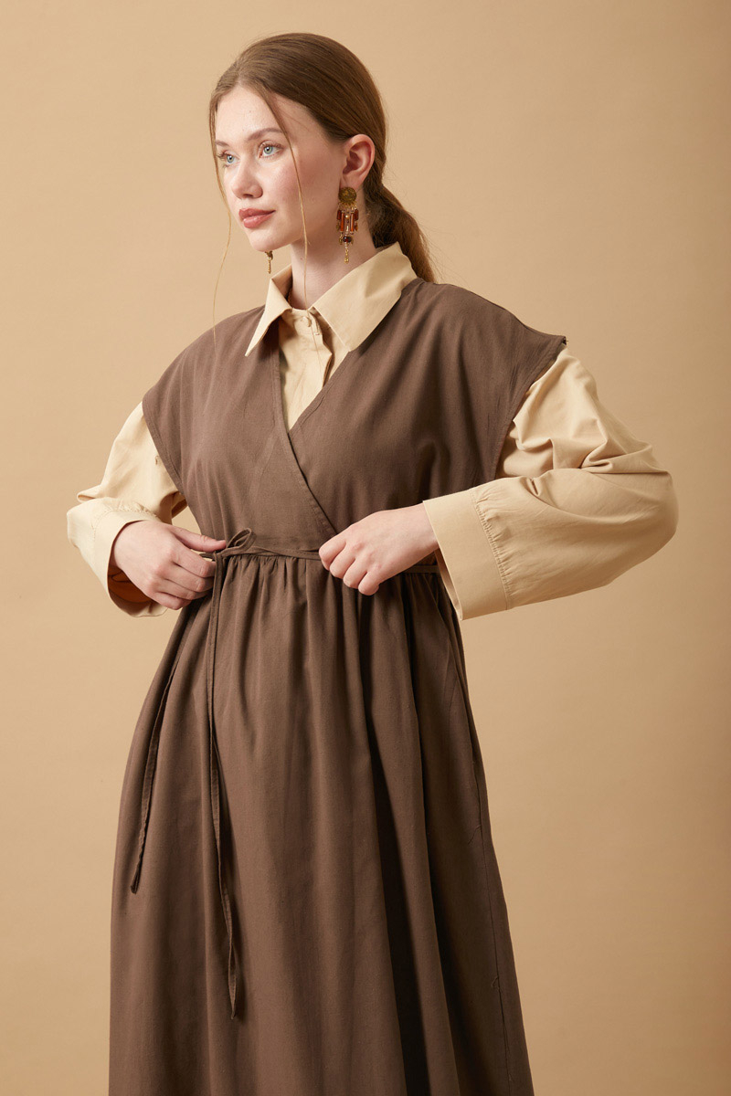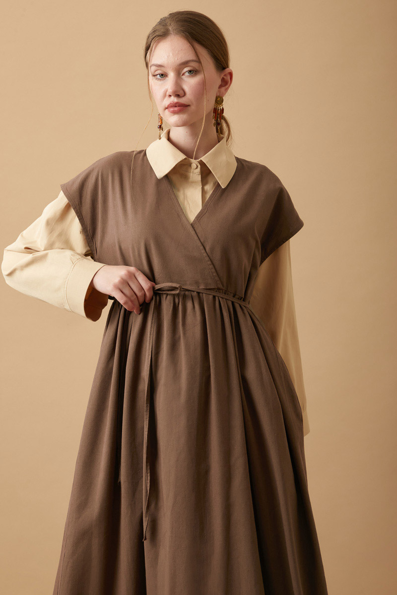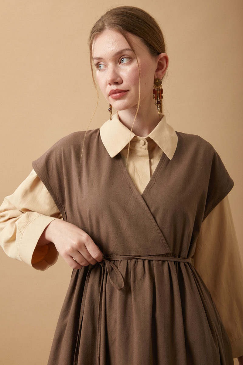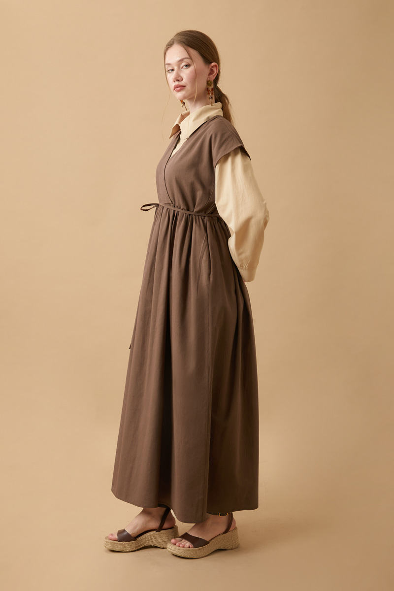 Helen Keten Jile Kahverengi. Kruvaze yakadır, düşük omuzludur, belden büzgü detaylıdır, yandan ceplidir, astarsızdır. biye kuşaklıdır, Günlük kullanım ve özel günlerinizde tercih edebilirsiniz.