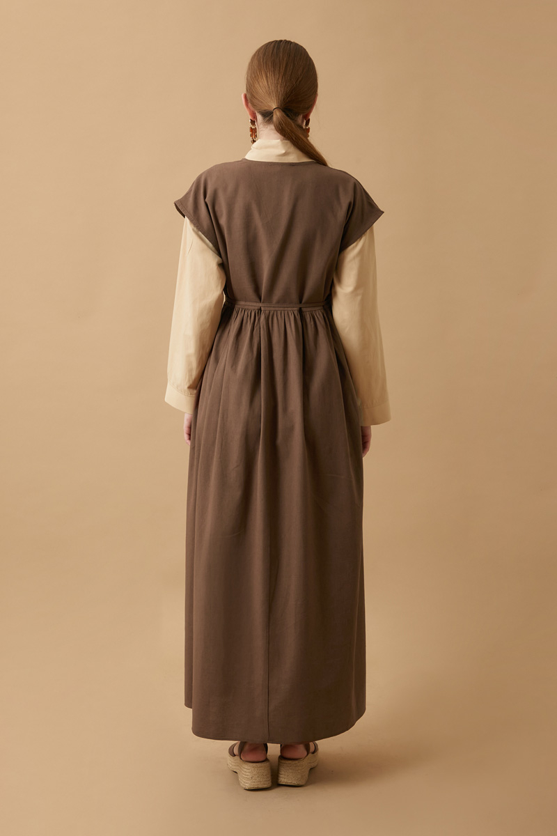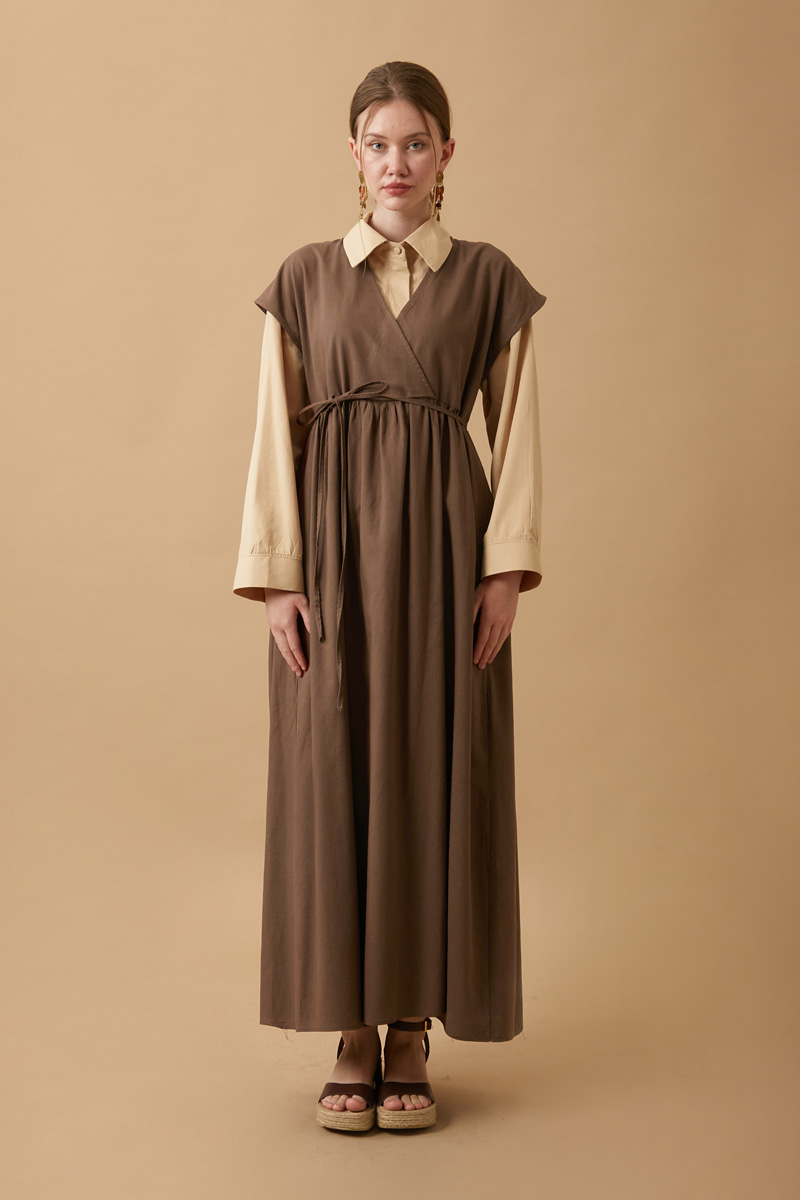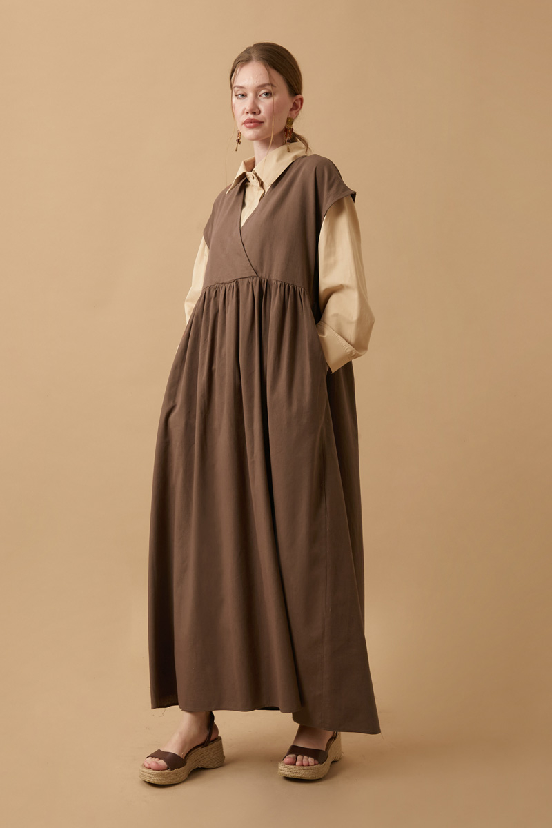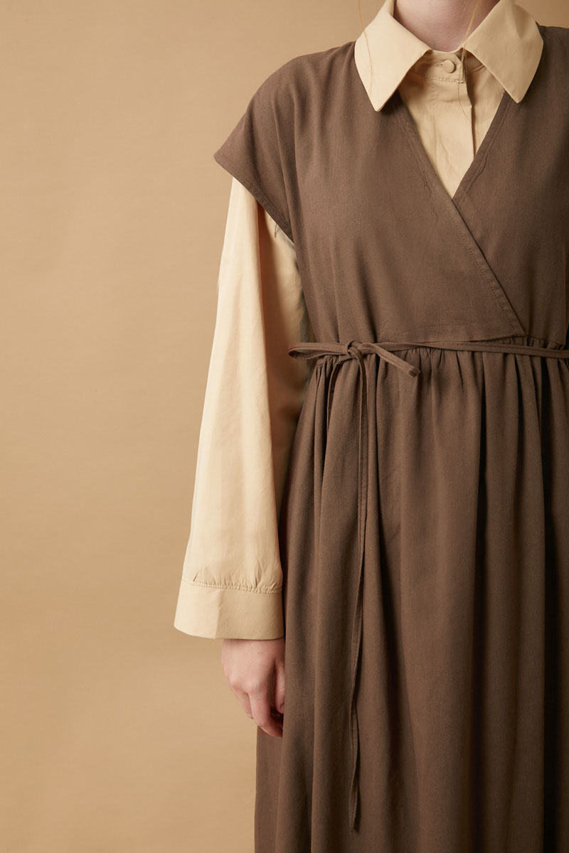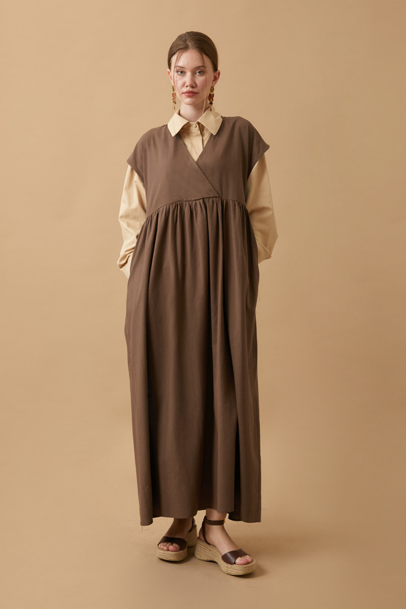 Helen Keten Jile Kahverengi. Kruvaze yakadır, düşük omuzludur, belden büzgü detaylıdır, yandan ceplidir, astarsızdır. biye kuşaklıdır, Günlük kullanım ve özel günlerinizde tercih edebilirsiniz.