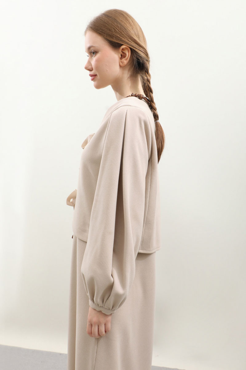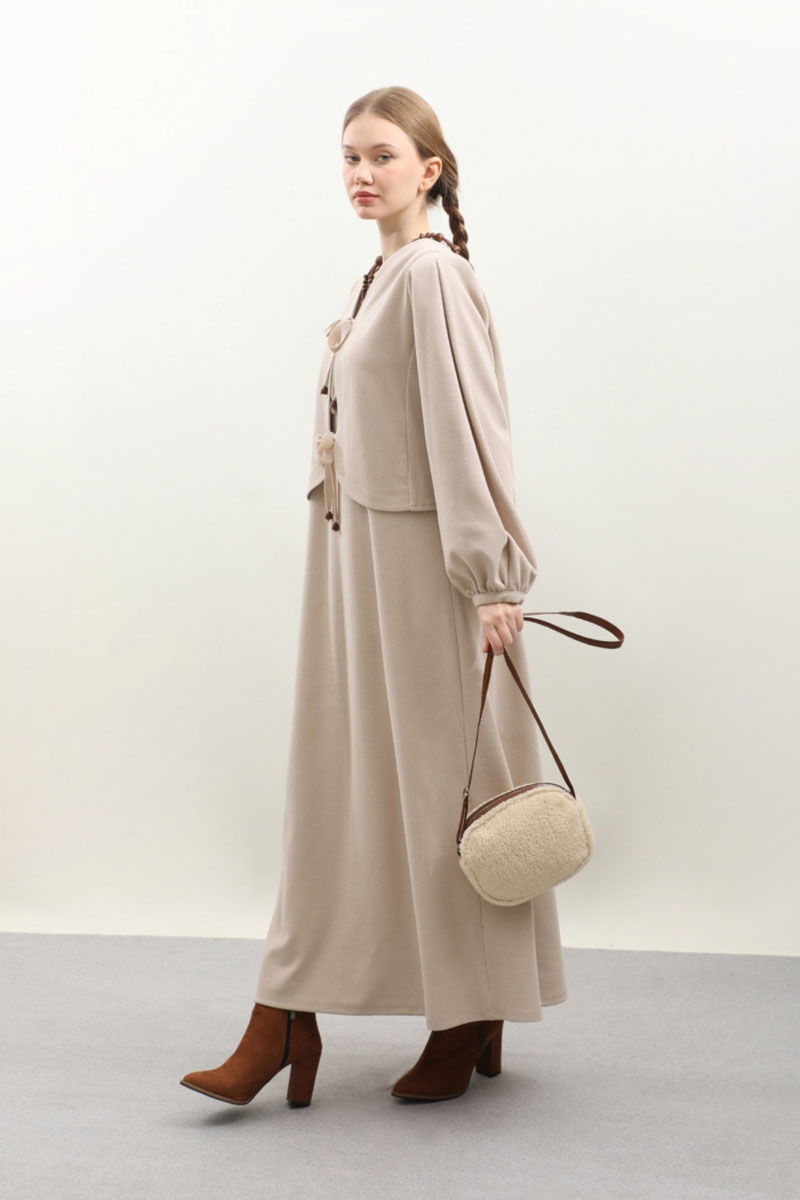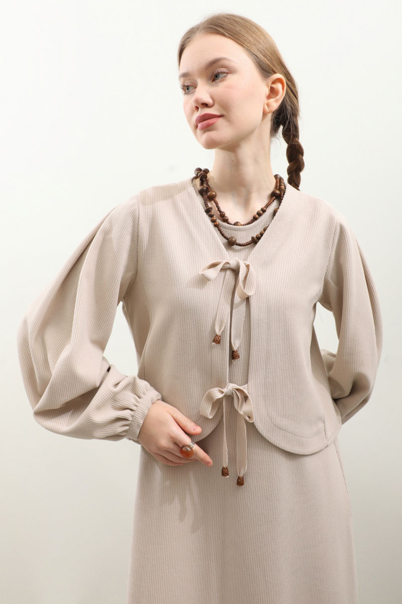 Hırkalı Triko Elbise Takım Krem. Hırka kolları geniş ve pile detaylıdır, ince manşetlidir, önden bağcık bağlamalıdır, iç elbise, bisiklet yakadır, sıfır kolludur, arkan fermuarlıdır, cepsizdir, astarsızdır, triko kumaş olduğundan iç göstermez. Günlük kullanım ve özel günlerinizde tercih edebilirsiniz.