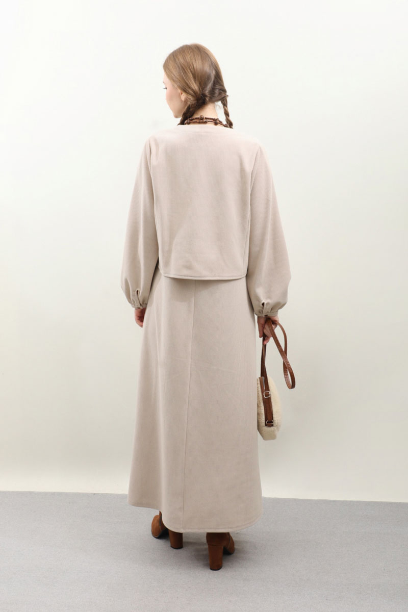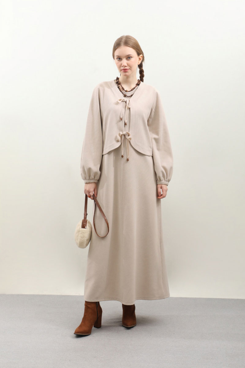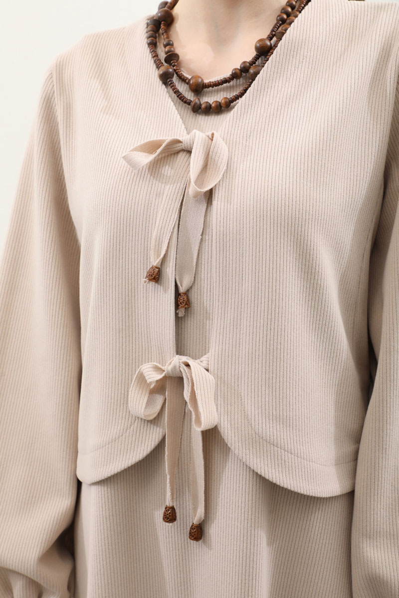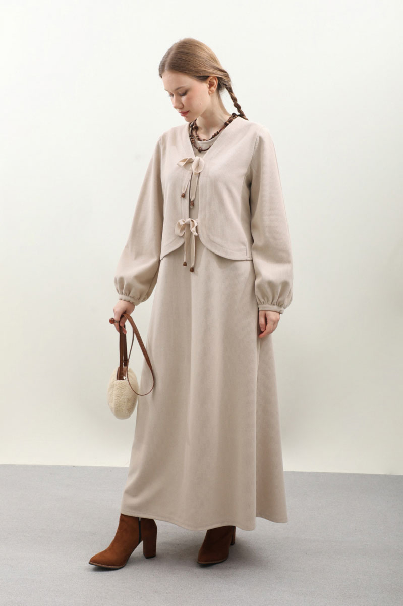 Hırkalı Triko Elbise Takım Krem. Hırka kolları geniş ve pile detaylıdır, ince manşetlidir, önden bağcık bağlamalıdır, iç elbise, bisiklet yakadır, sıfır kolludur, arkan fermuarlıdır, cepsizdir, astarsızdır, triko kumaş olduğundan iç göstermez. Günlük kullanım ve özel günlerinizde tercih edebilirsiniz.