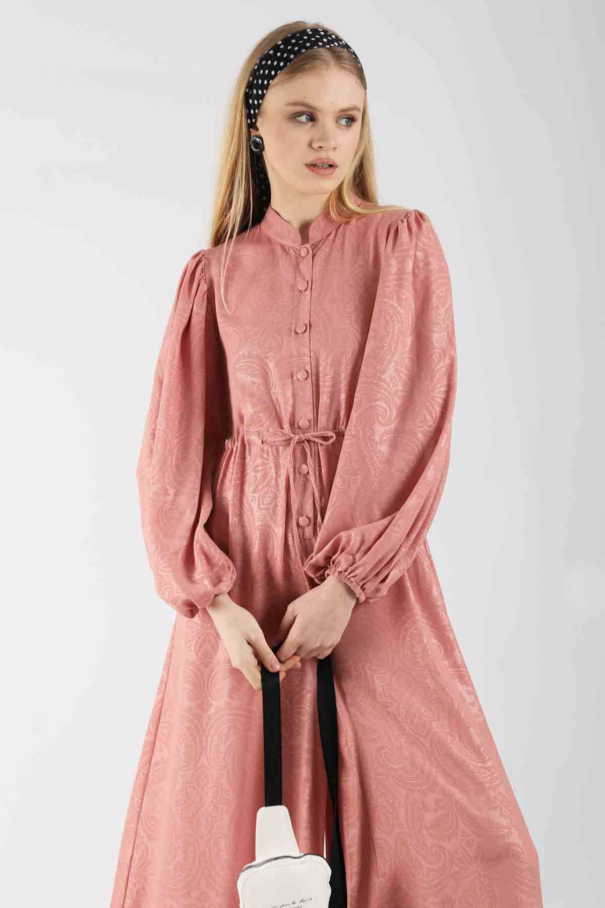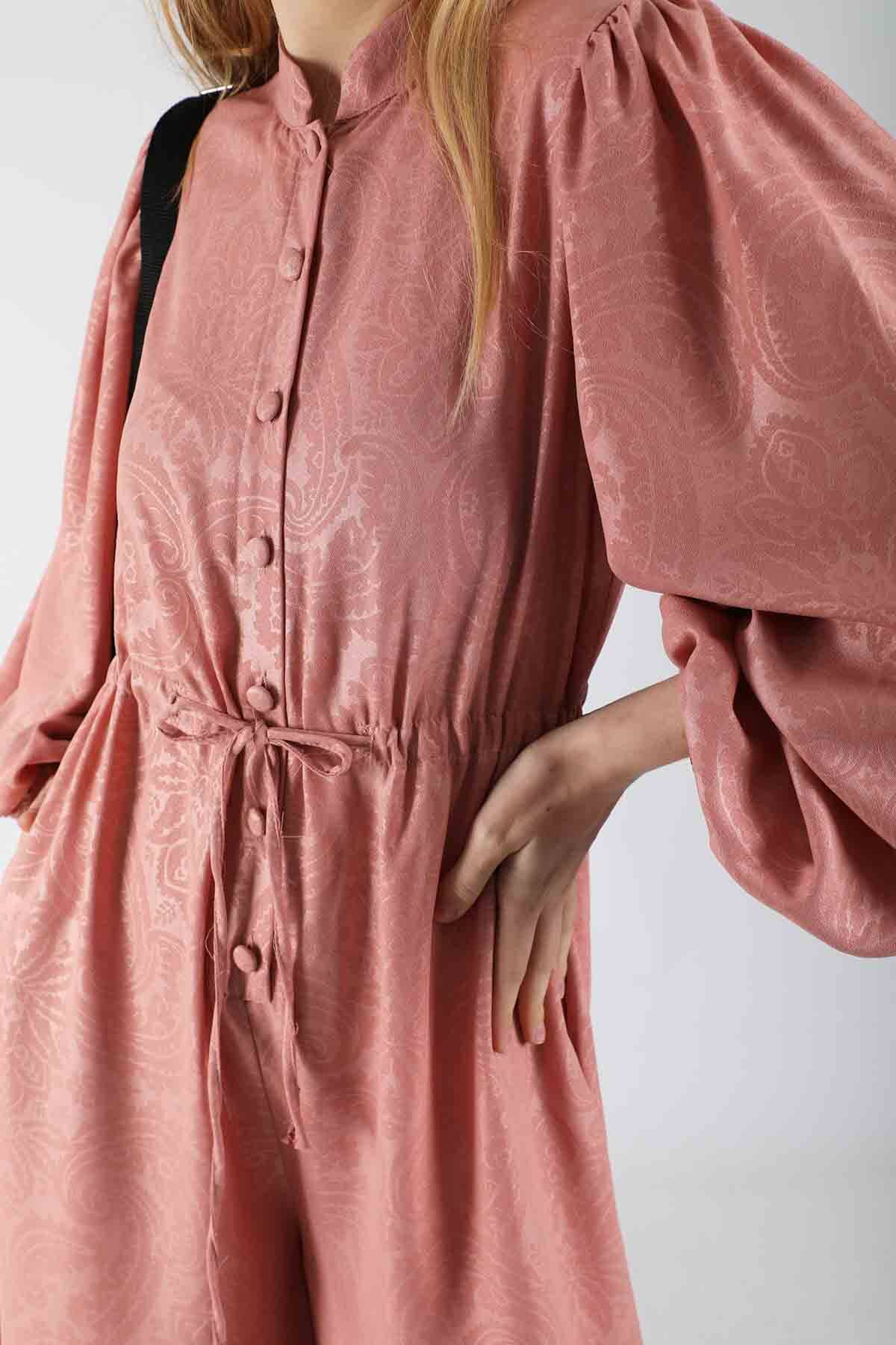 Hakim yaka. Önden düğmeli. Belden bağcıklı. Bol paça tulum. Astarsızdır. İç göstermez.