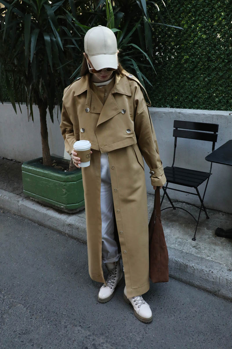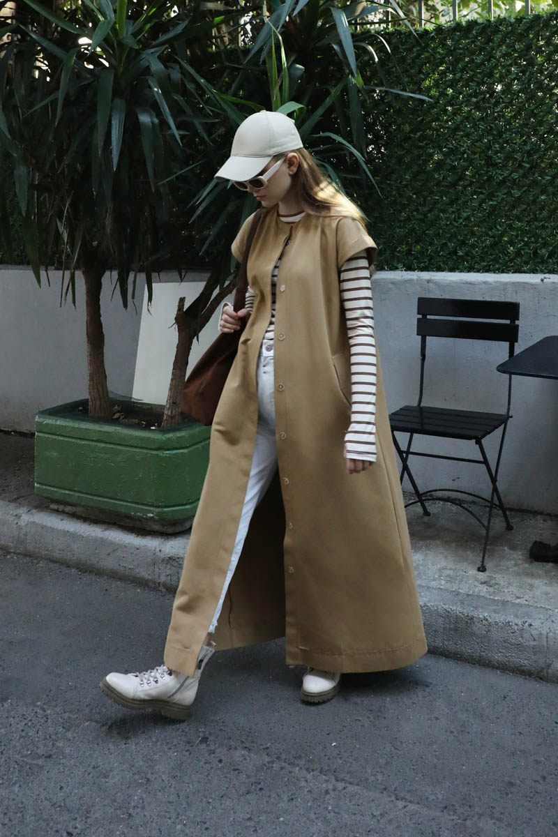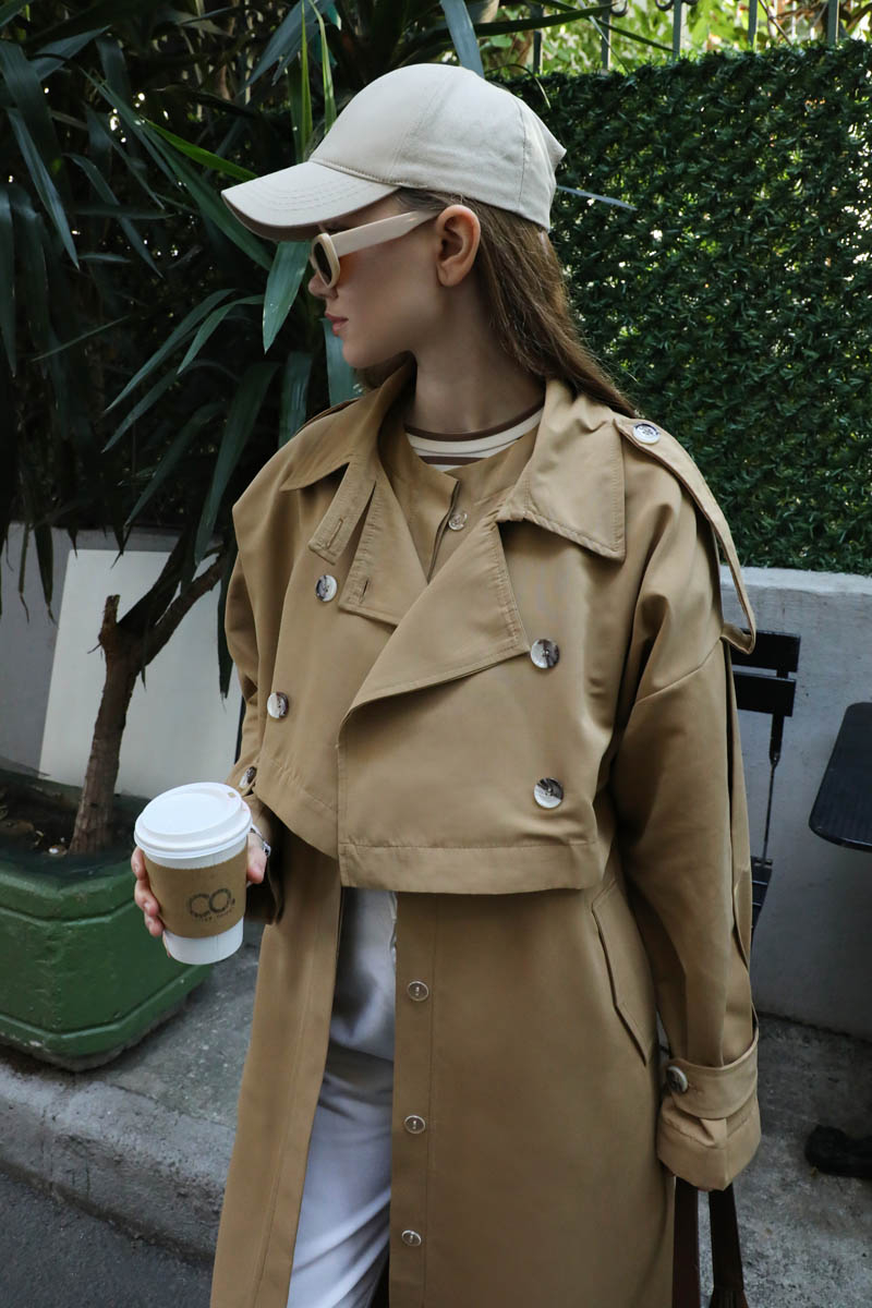 İkili Trençkot Camel. Ürün iki parça şeklindendir. Üst kısa trenç içi uzun yelek olarak kullanılabilirsiniz. Birlikte uzun trençkot olarakta kullanılabilir. Kısa trenç: Yakadan düğmeli kemer detaylıdır, önden kruvaze kapamadır. Omuzdan apolet detaylıdır, kolları pilikaşe olup manşeti ayaralanabilir apolet detaylıdır. Astarsızdır.