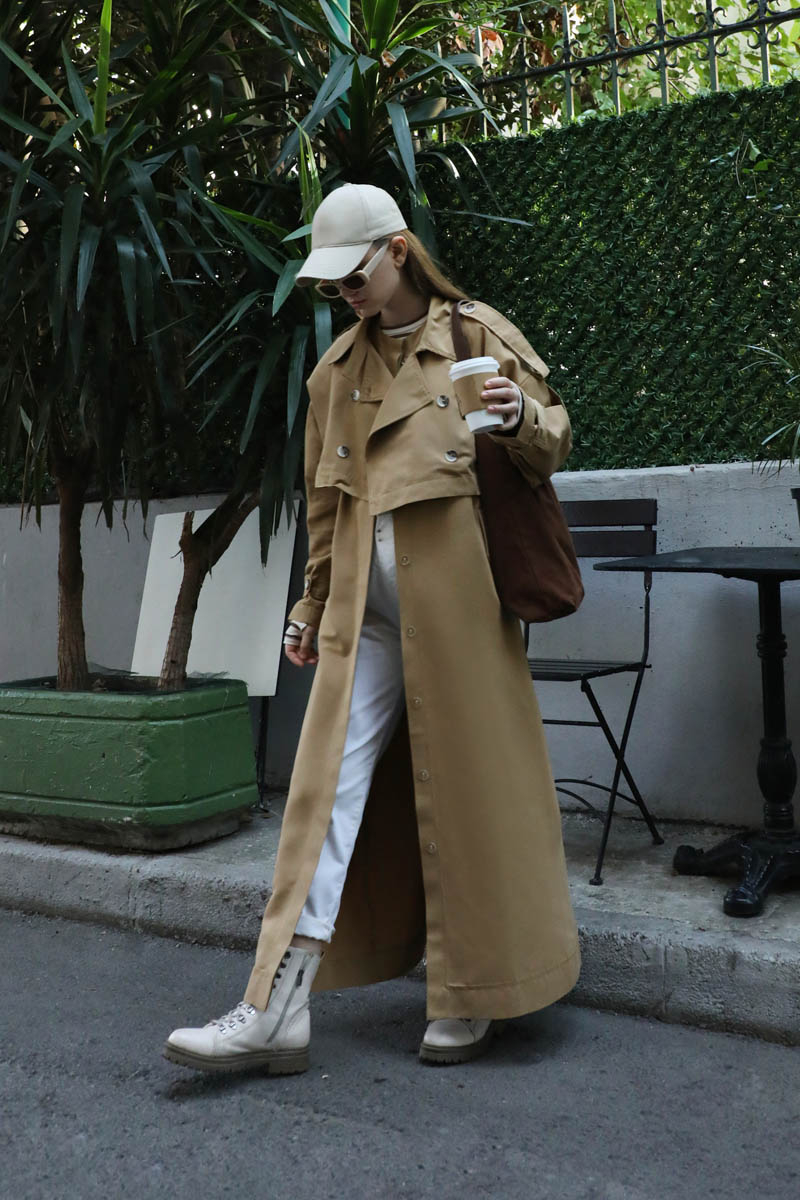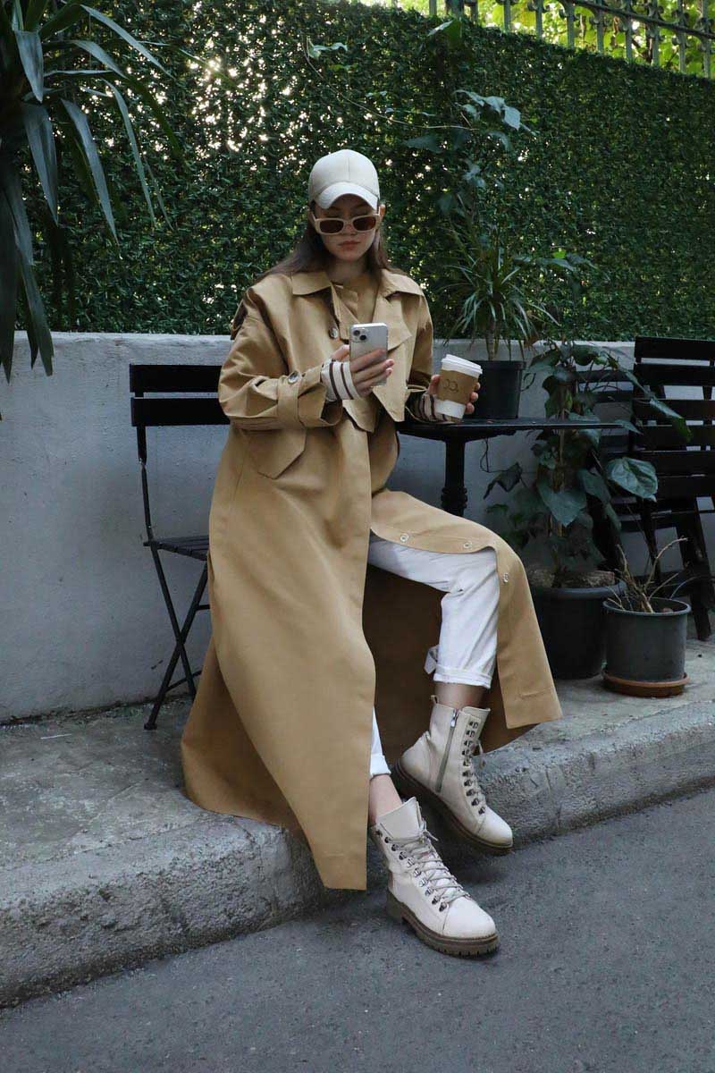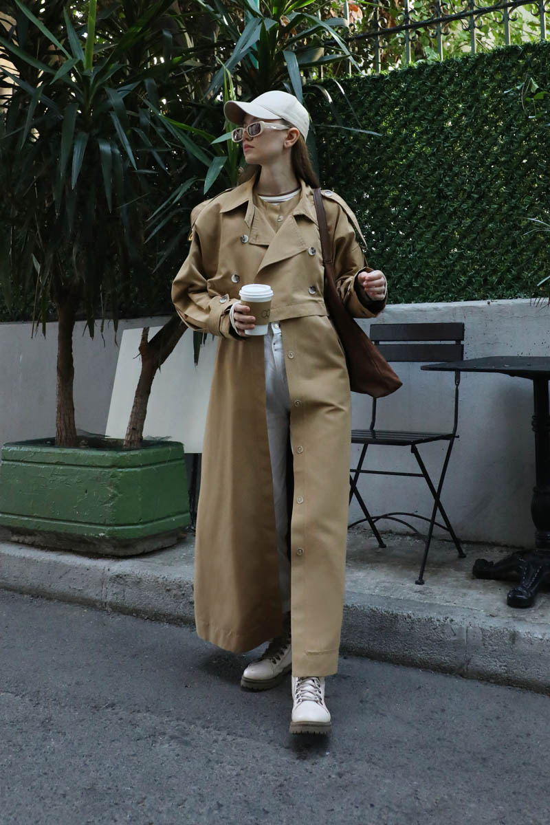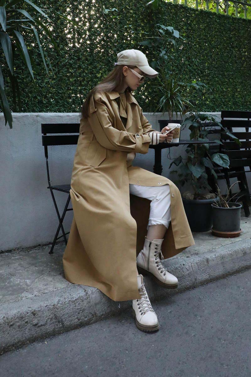 İkili Trençkot Camel. Ürün iki parça şeklindendir. Üst kısa trenç içi uzun yelek olarak kullanılabilirsiniz. Birlikte uzun trençkot olarakta kullanılabilir. Kısa trenç: Yakadan düğmeli kemer detaylıdır, önden kruvaze kapamadır. Omuzdan apolet detaylıdır, kolları pilikaşe olup manşeti ayaralanabilir apolet detaylıdır. Astarsızdır.