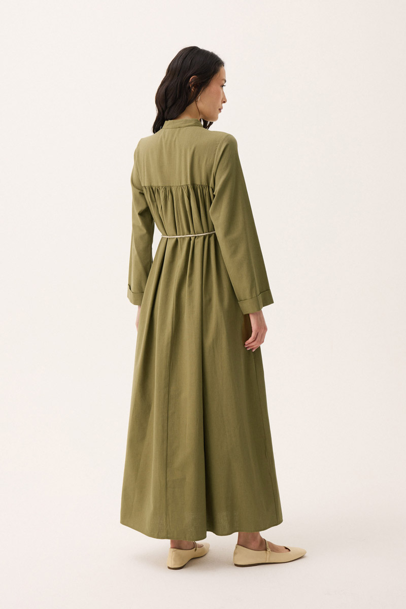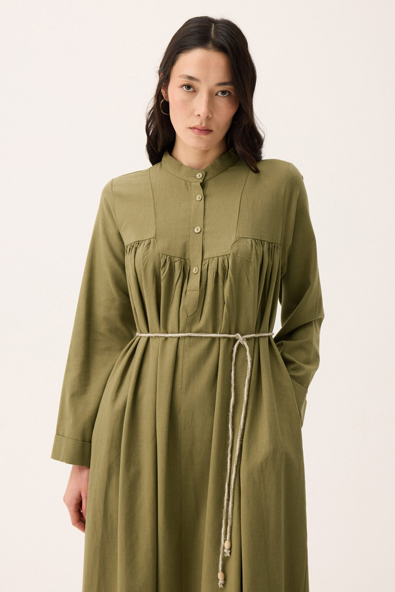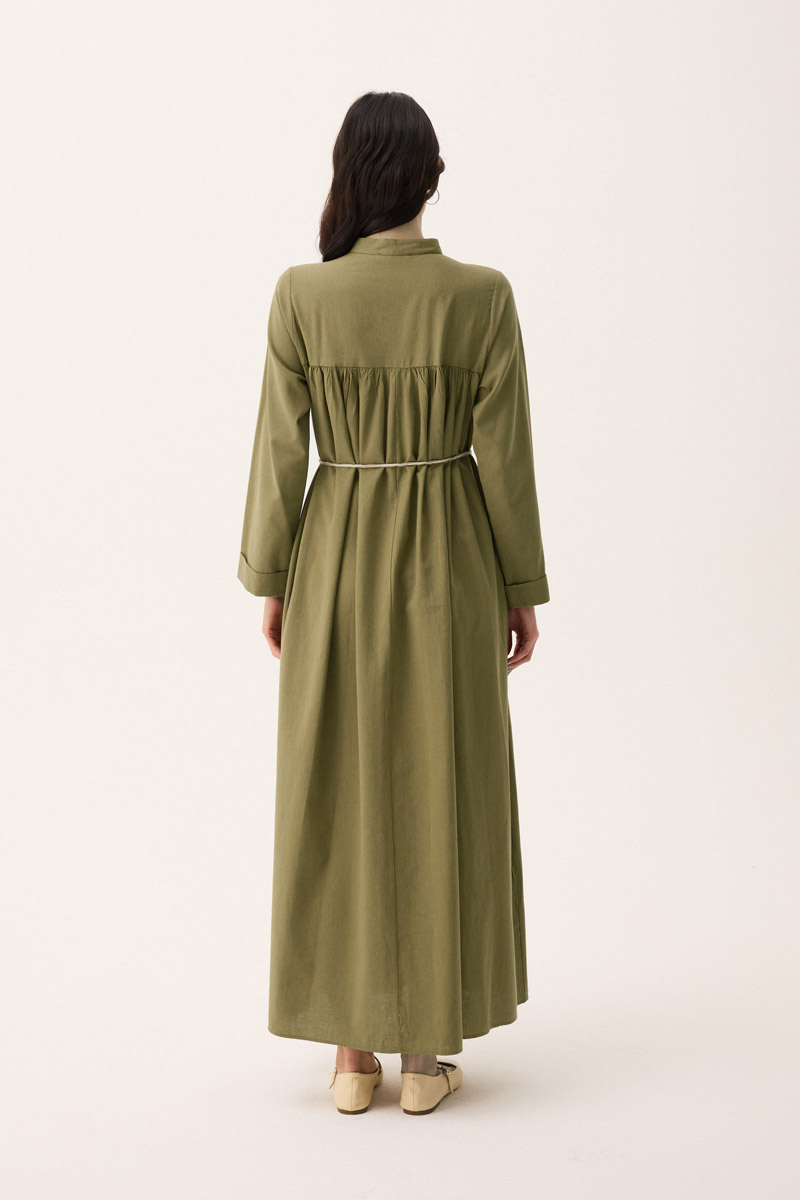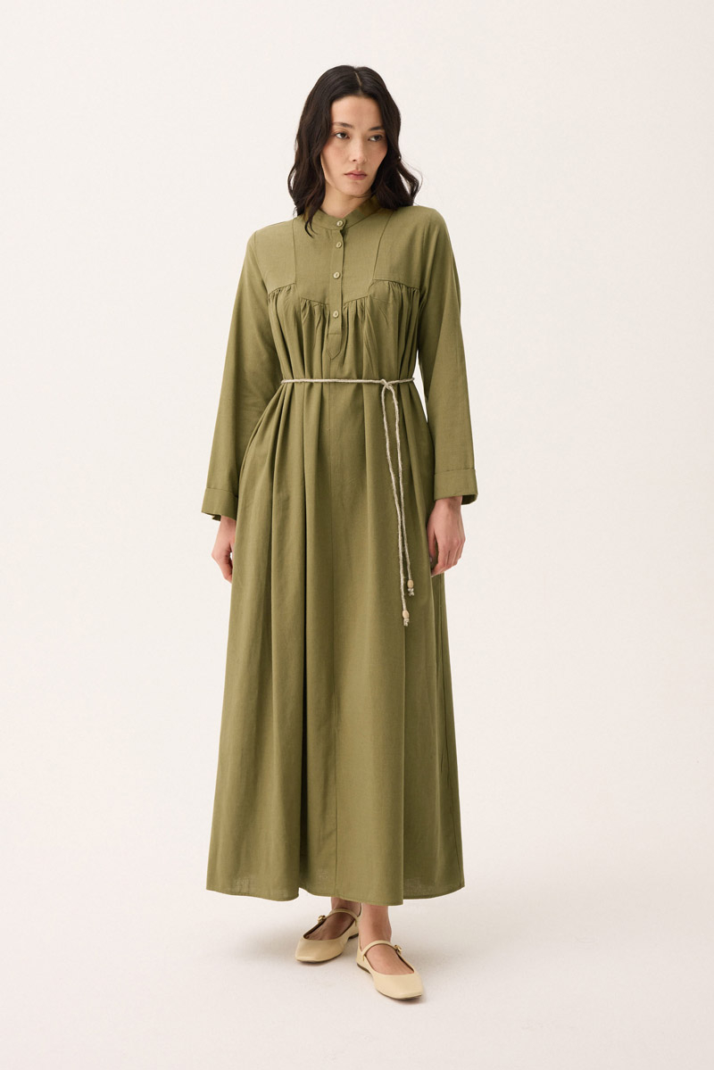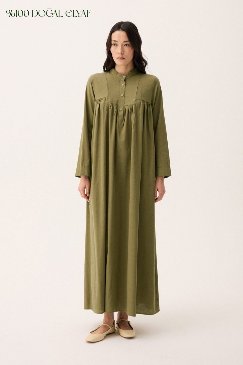 İmge Keten Elbise Haki. Hakim yakadır, Önden büzgü ve roba detaylı olup düğmelidir. yandan ceplidir, double kolludur, bol kalıp, geniş kalıptır, belinde tahta boncuk detaylı hazır ip kordonludur, astarsızdır. Günlük kullanım ve özel günlerinizde tercih edebilirsiniz.