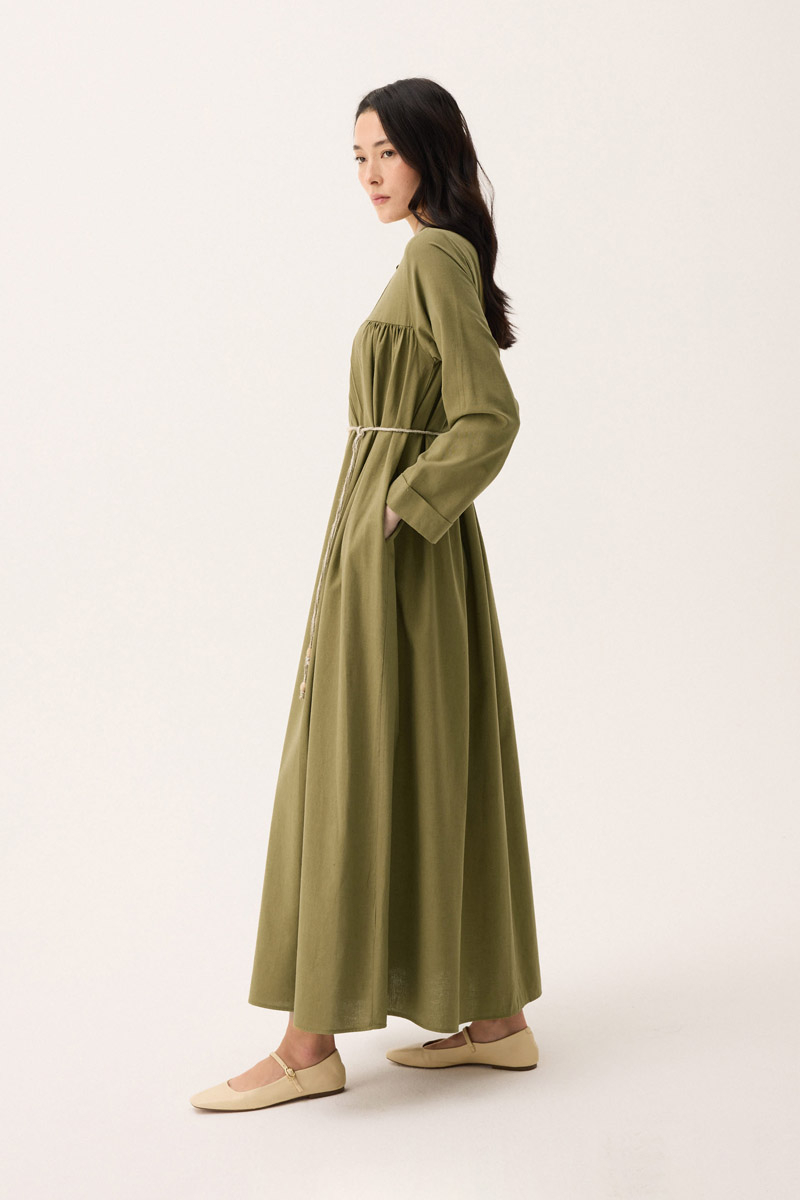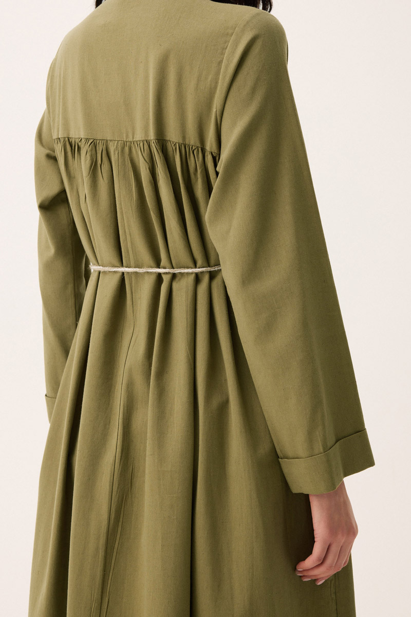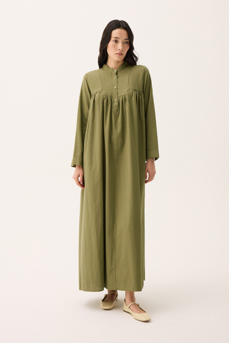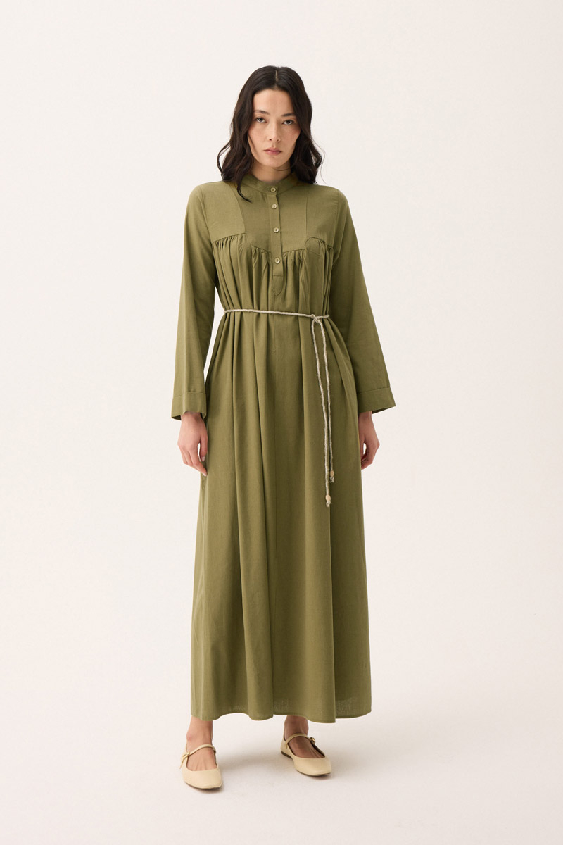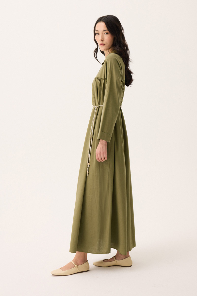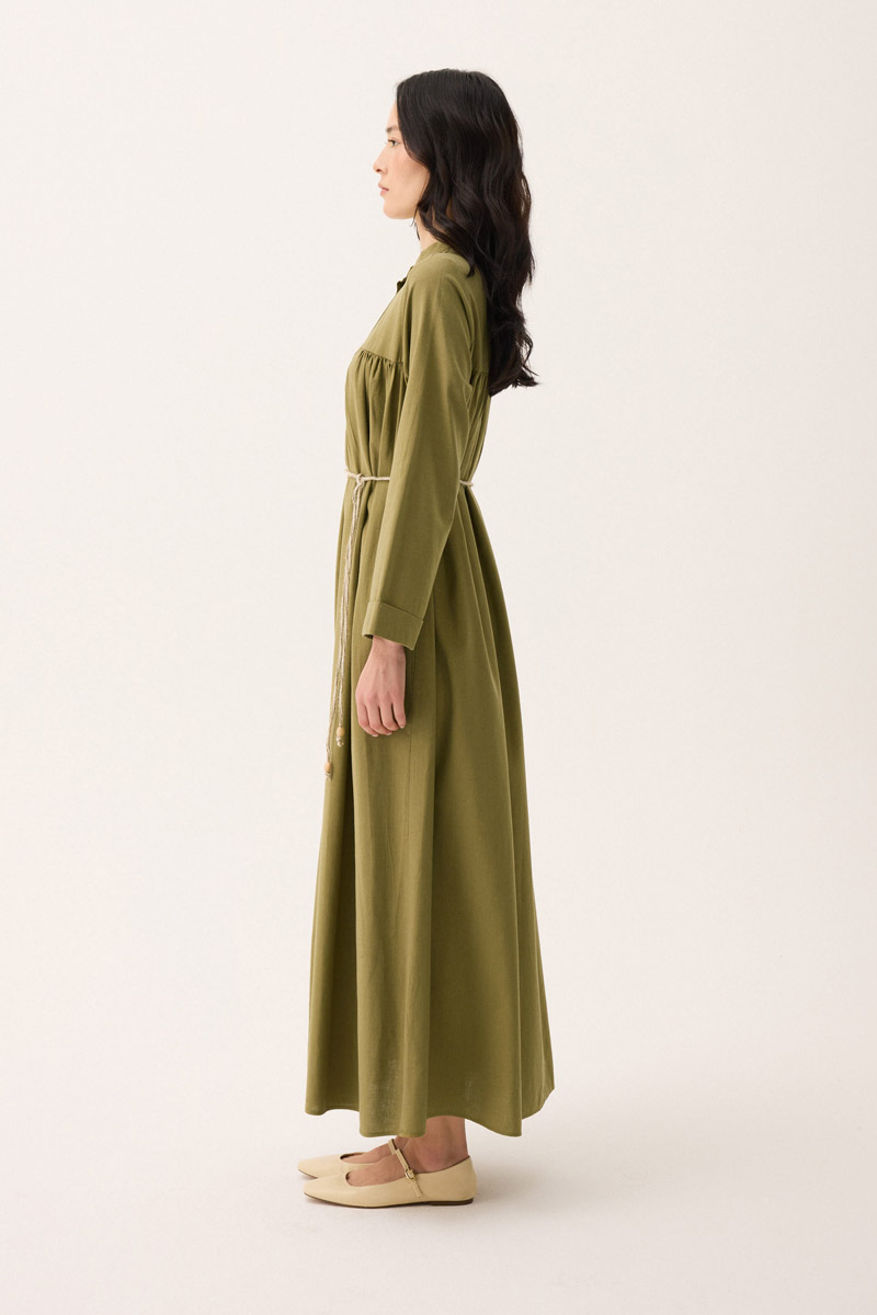 İmge Keten Elbise Haki. Hakim yakadır, Önden büzgü ve roba detaylı olup düğmelidir. yandan ceplidir, double kolludur, bol kalıp, geniş kalıptır, belinde tahta boncuk detaylı hazır ip kordonludur, astarsızdır. Günlük kullanım ve özel günlerinizde tercih edebilirsiniz.