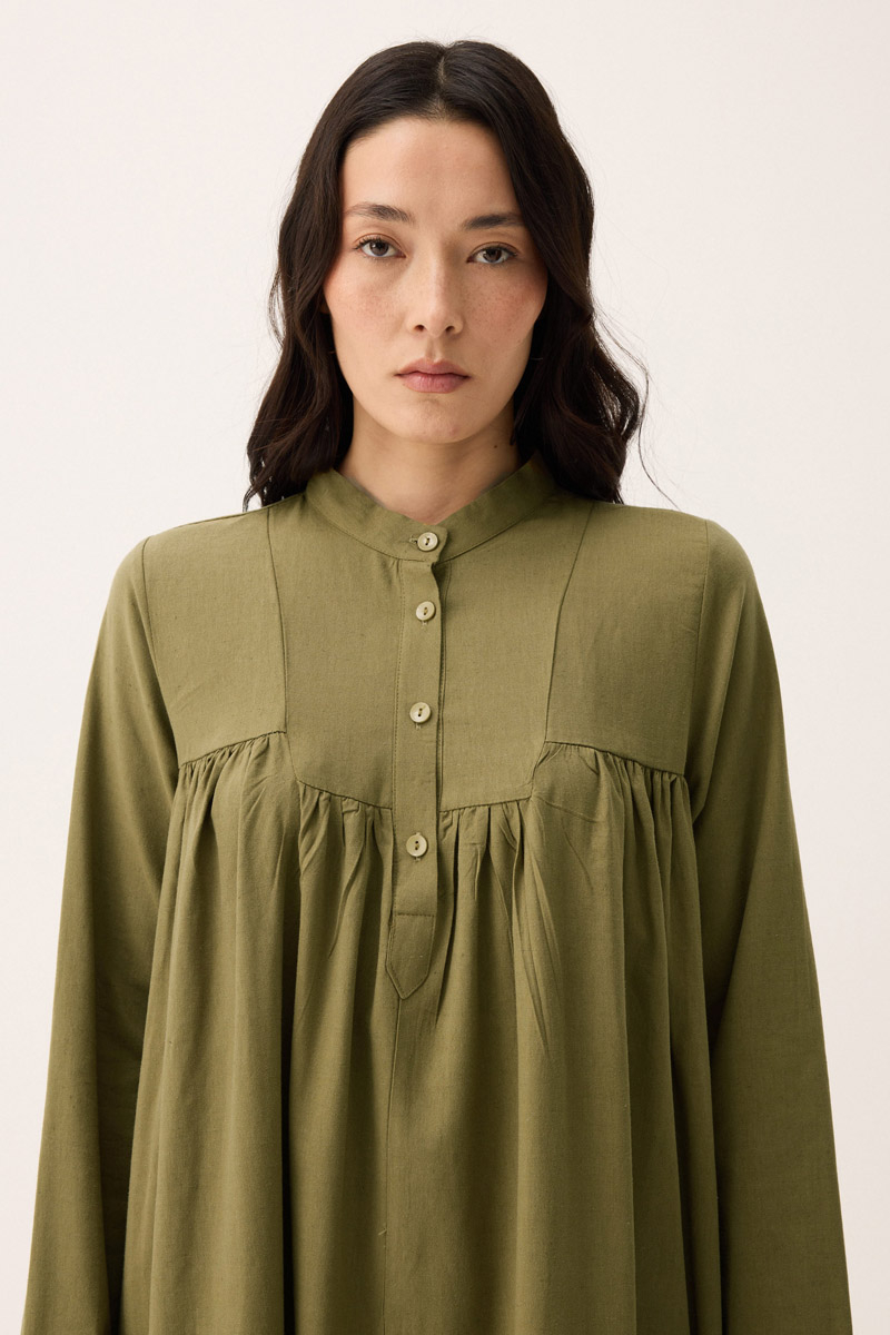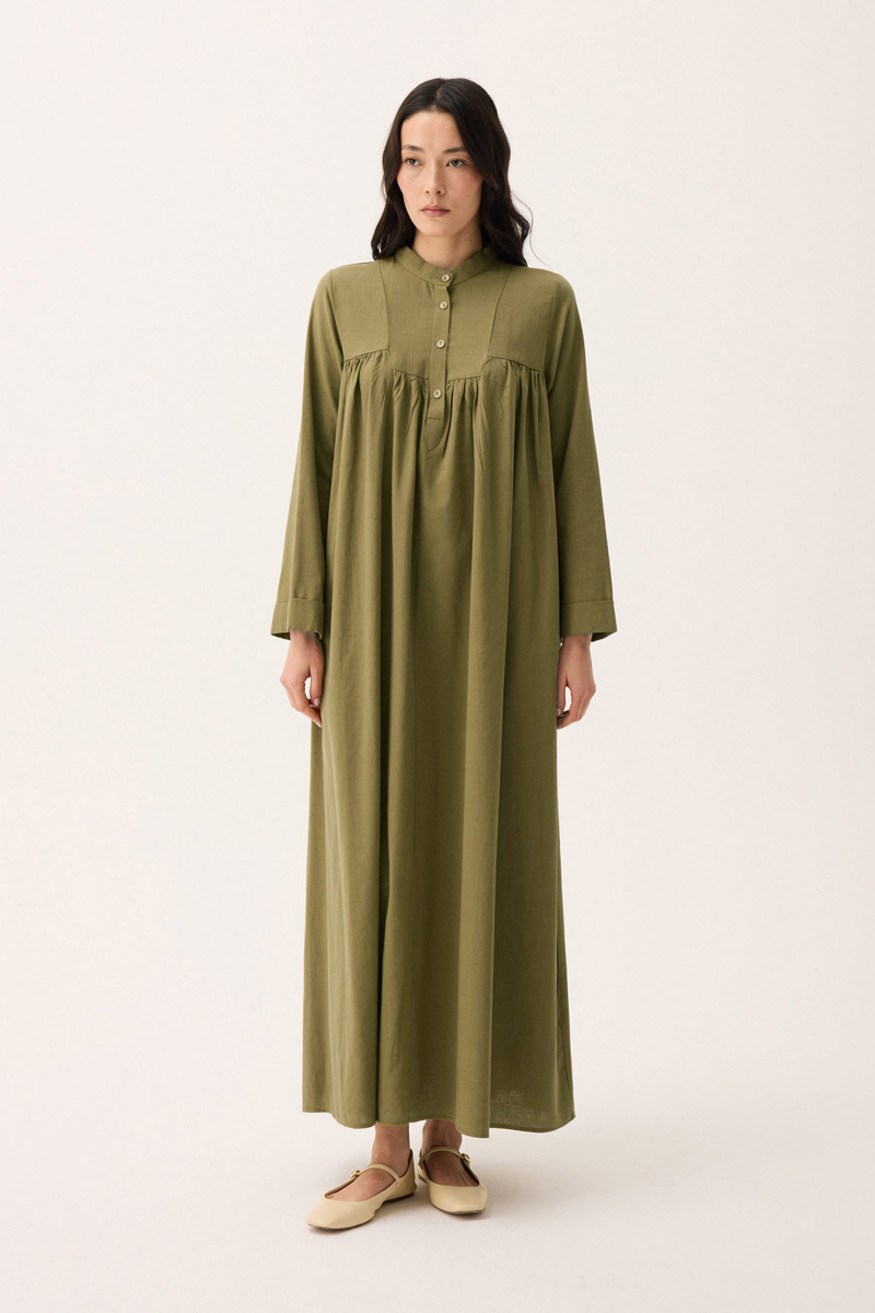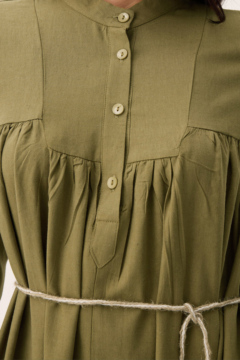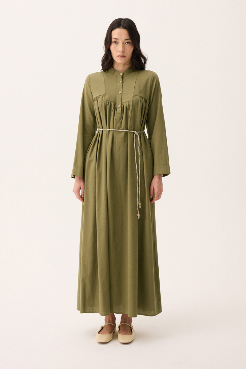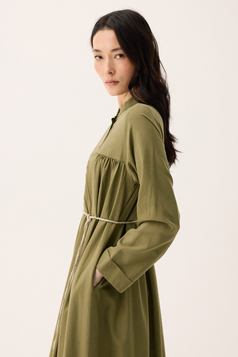 İmge Keten Elbise Haki. Hakim yakadır, Önden büzgü ve roba detaylı olup düğmelidir. yandan ceplidir, double kolludur, bol kalıp, geniş kalıptır, belinde tahta boncuk detaylı hazır ip kordonludur, astarsızdır. Günlük kullanım ve özel günlerinizde tercih edebilirsiniz.