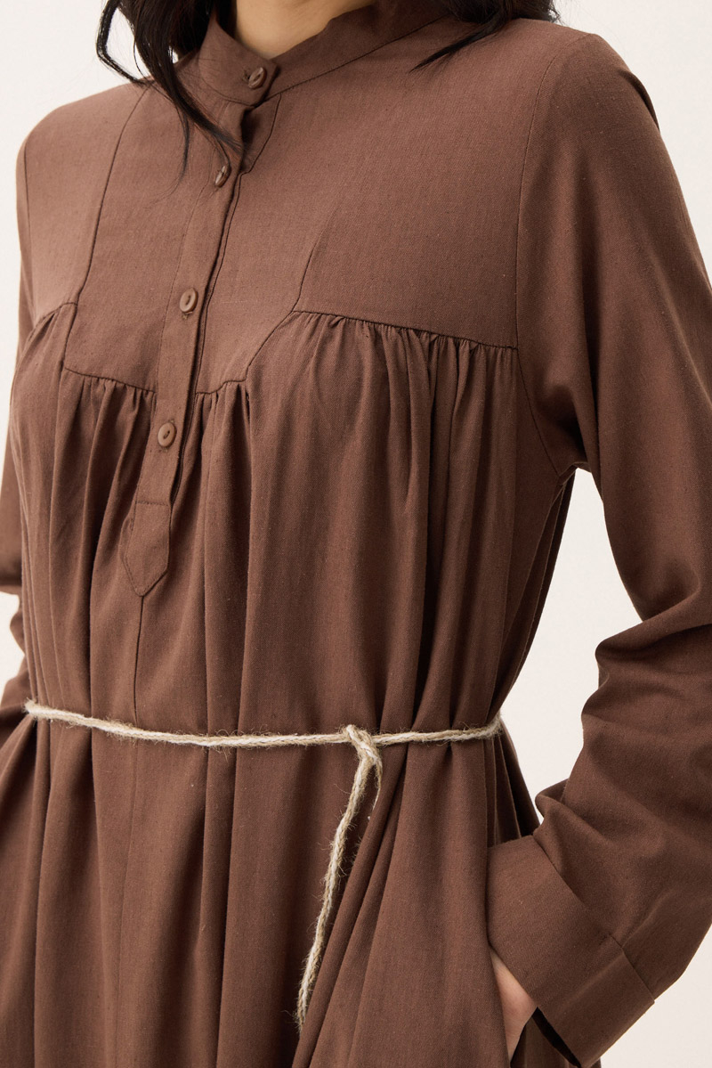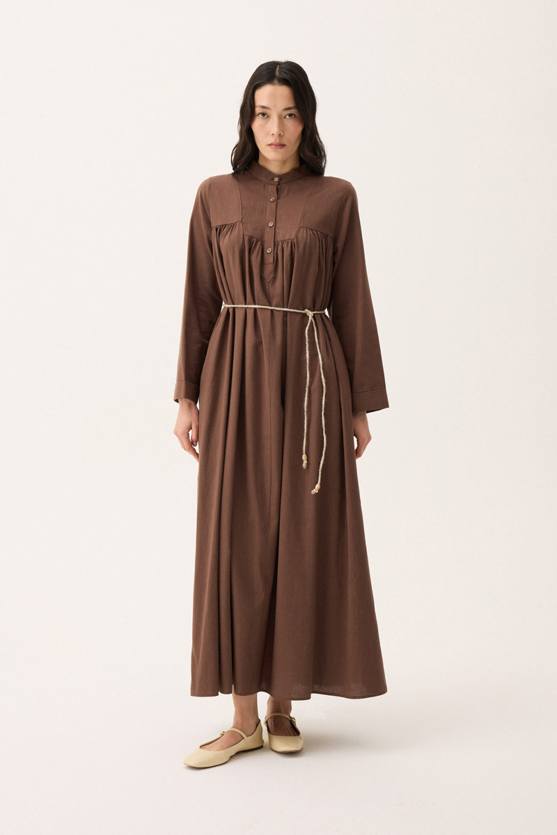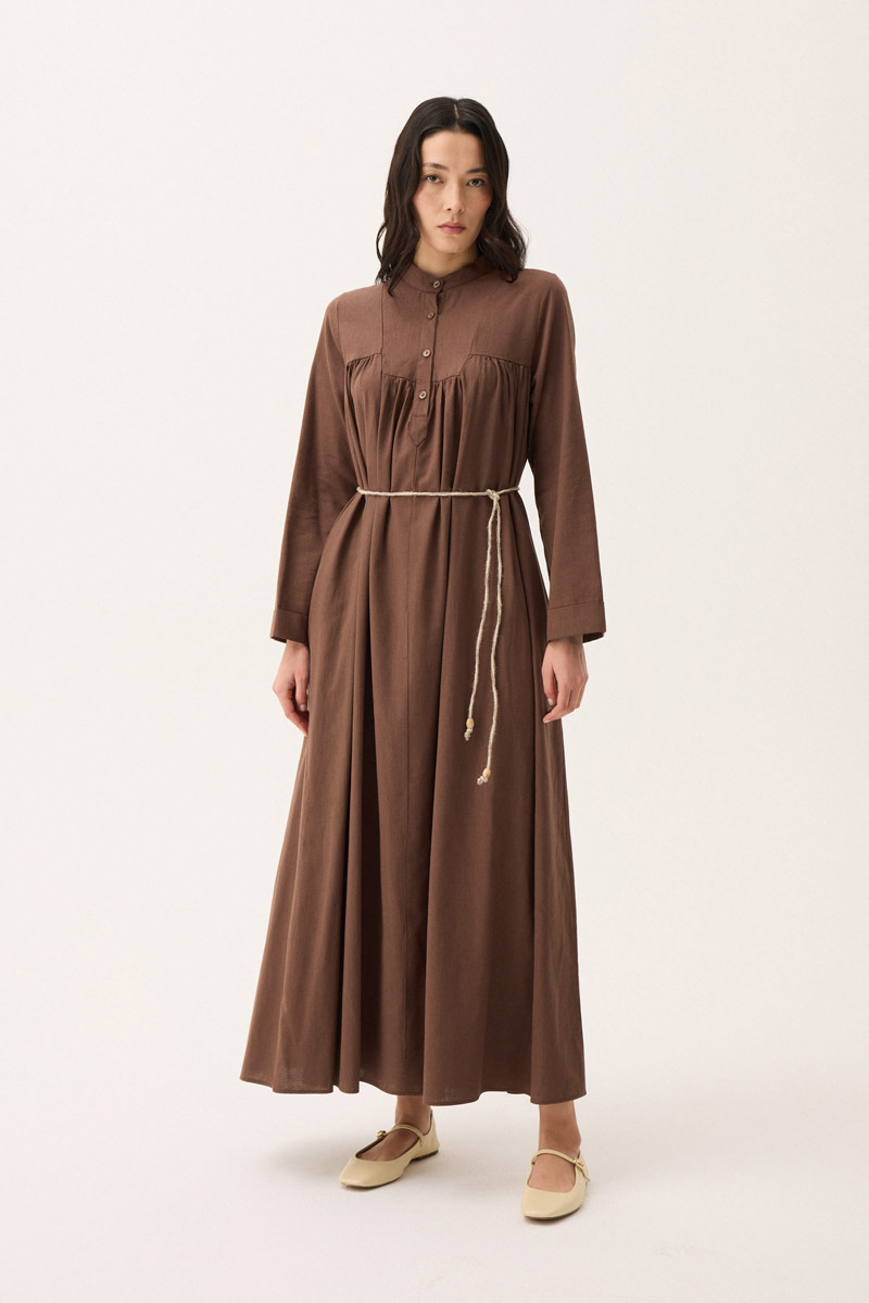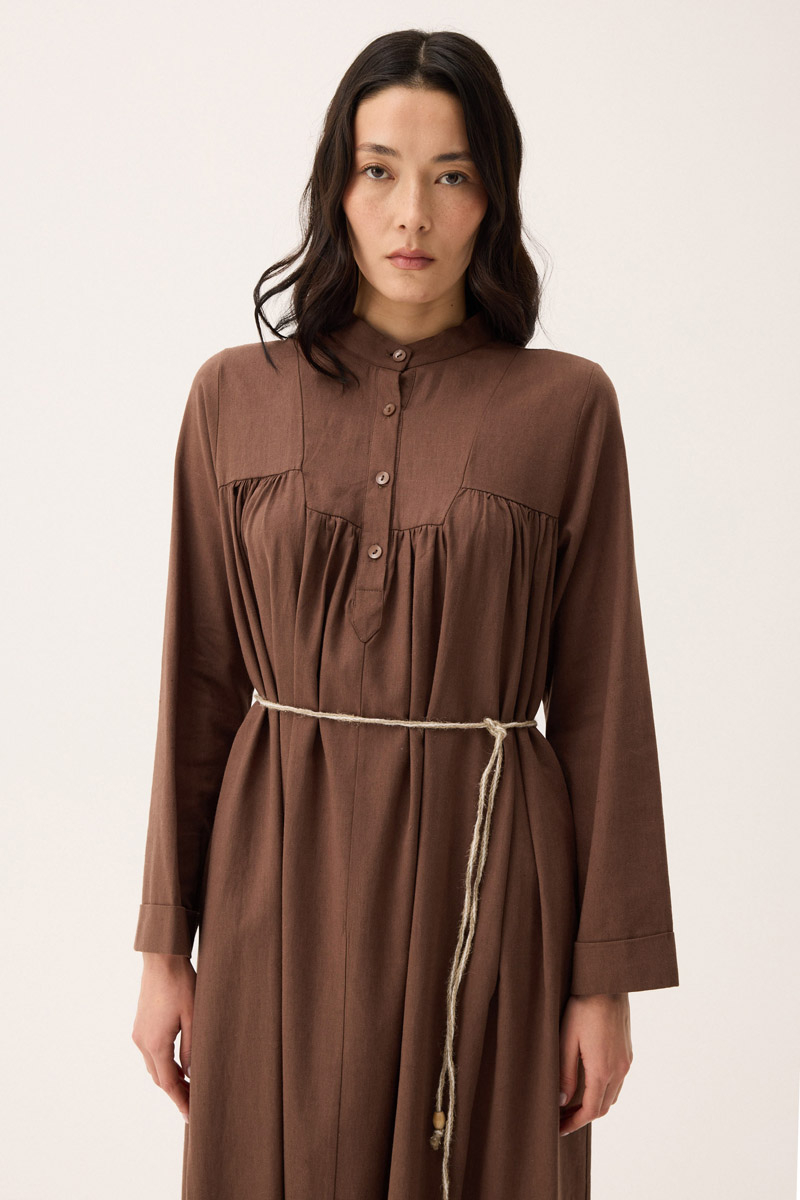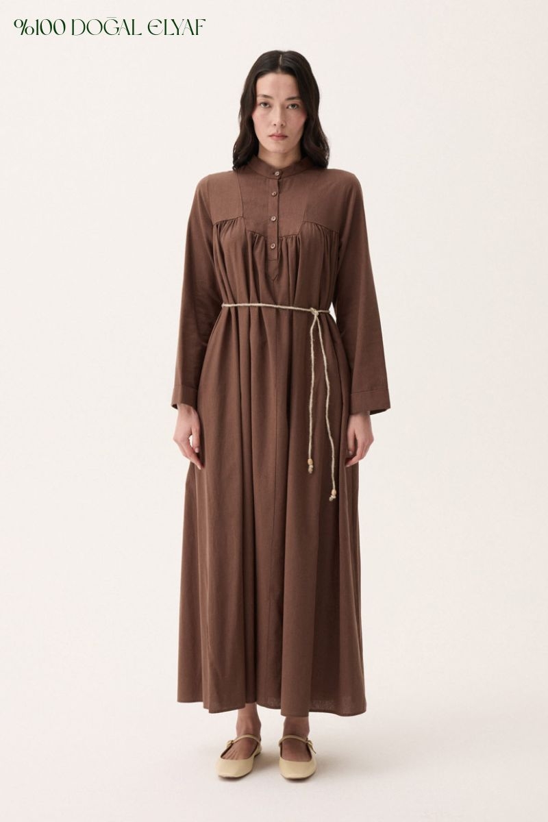 İmge Keten Elbise Kahverengi. Hakim yakadır, Önden büzgü ve roba detaylı olup düğmelidir. yandan ceplidir, double kolludur, bol kalıp, geniş kalıptır, belinde tahta boncuk detaylı hazır ip kordonludur, astarsızdır. Günlük kullanım ve özel günlerinizde tercih edebilirsiniz.