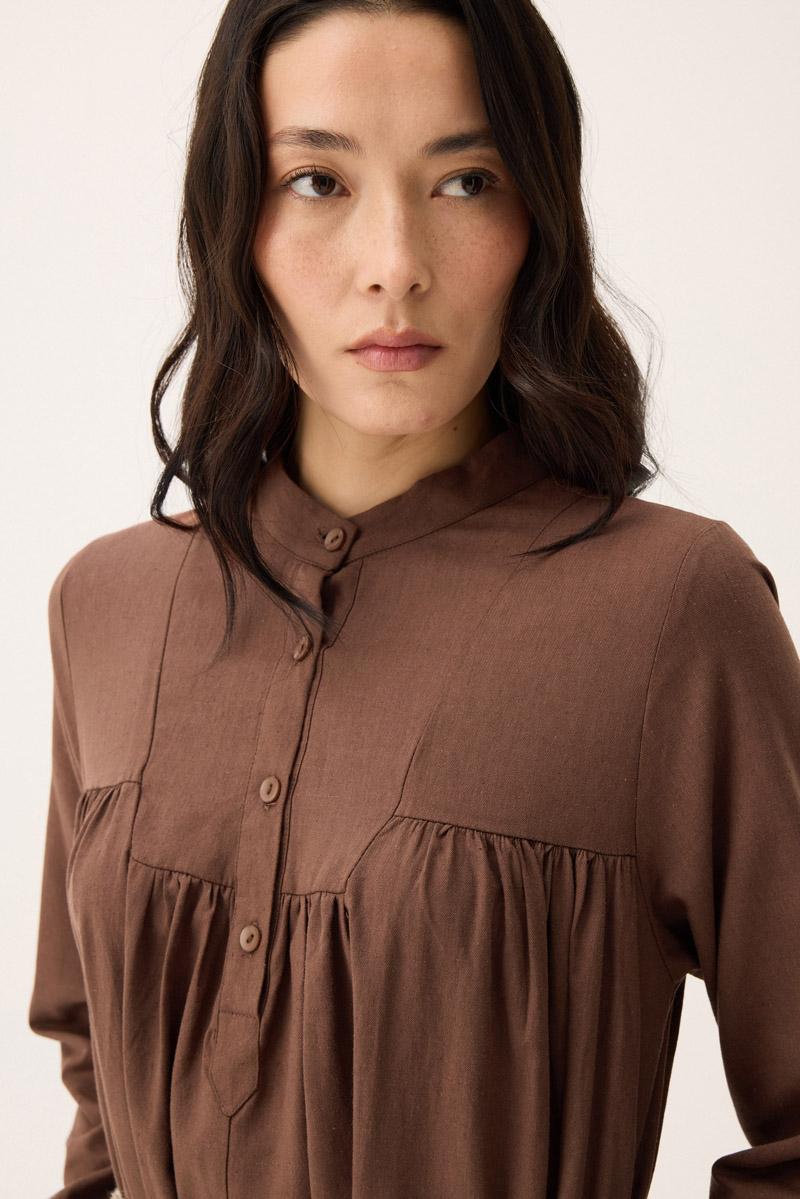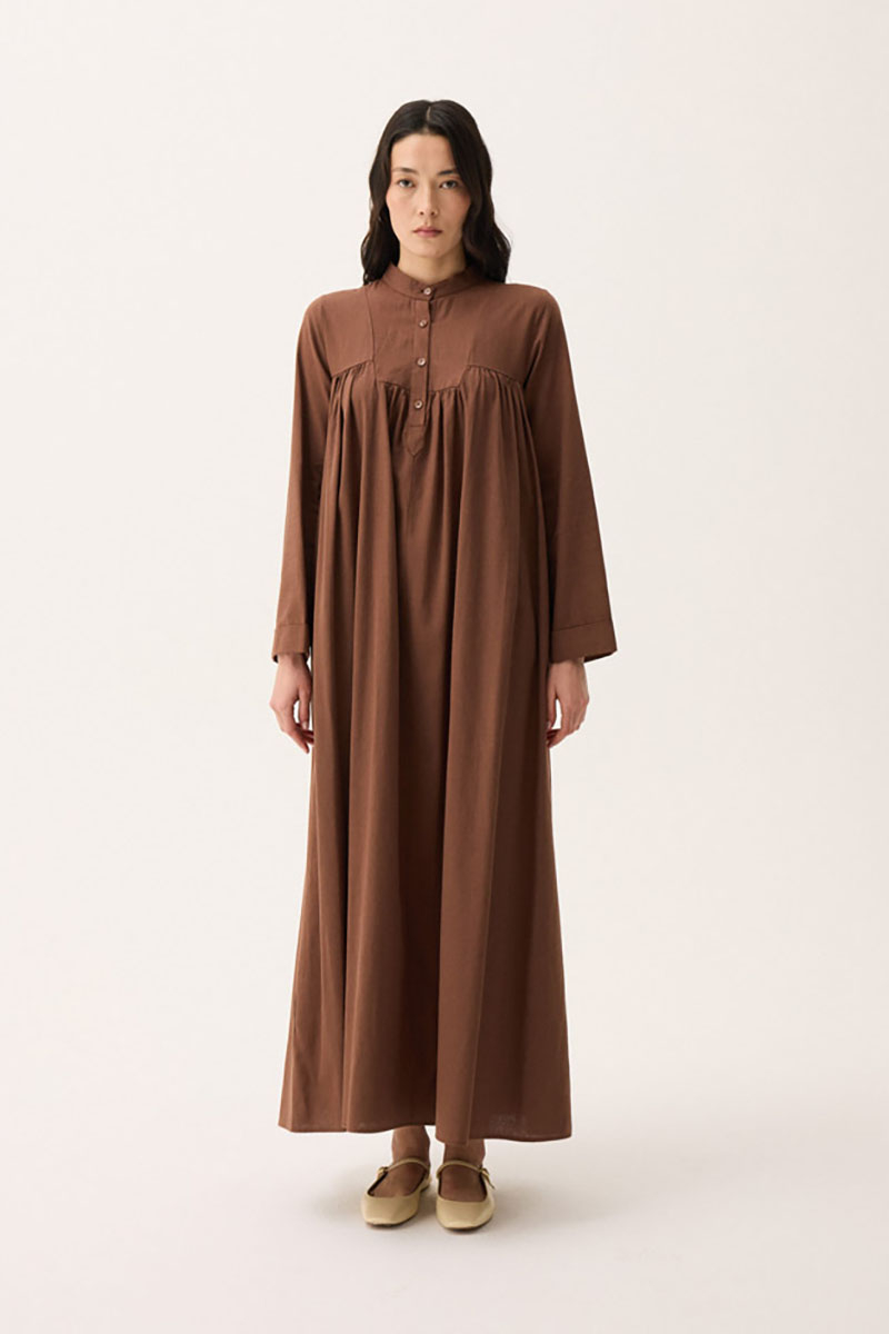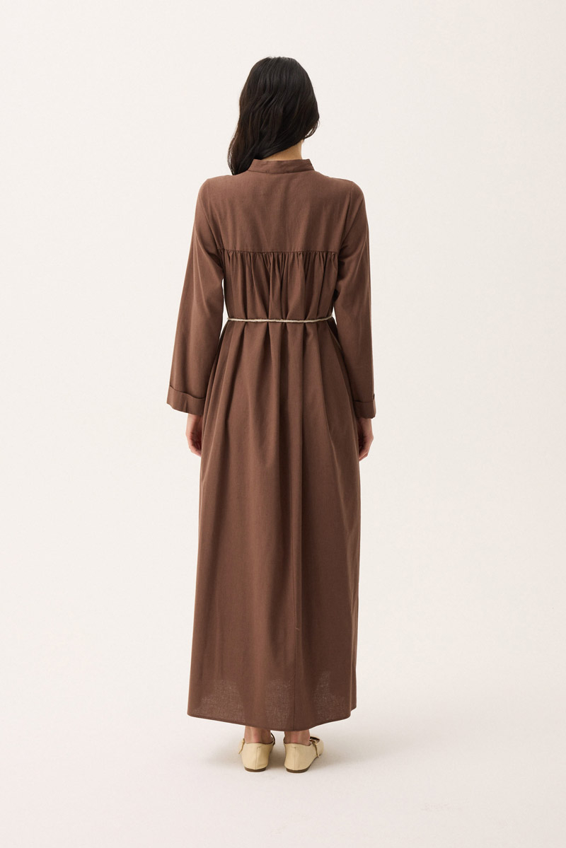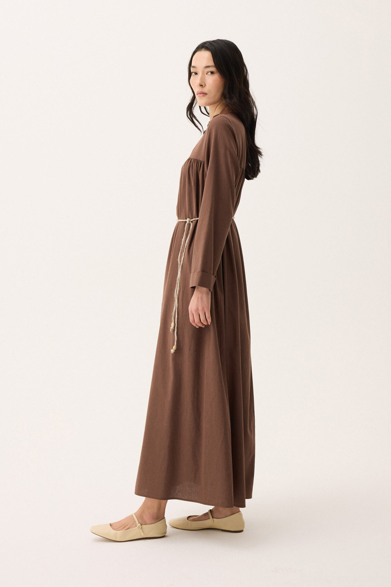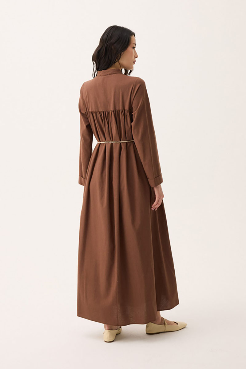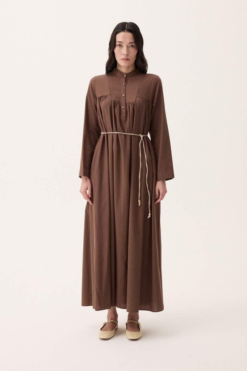 İmge Keten Elbise Kahverengi. Hakim yakadır, Önden büzgü ve roba detaylı olup düğmelidir. yandan ceplidir, double kolludur, bol kalıp, geniş kalıptır, belinde tahta boncuk detaylı hazır ip kordonludur, astarsızdır. Günlük kullanım ve özel günlerinizde tercih edebilirsiniz.