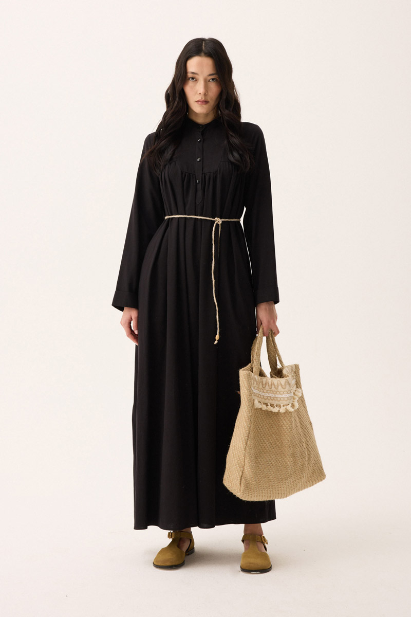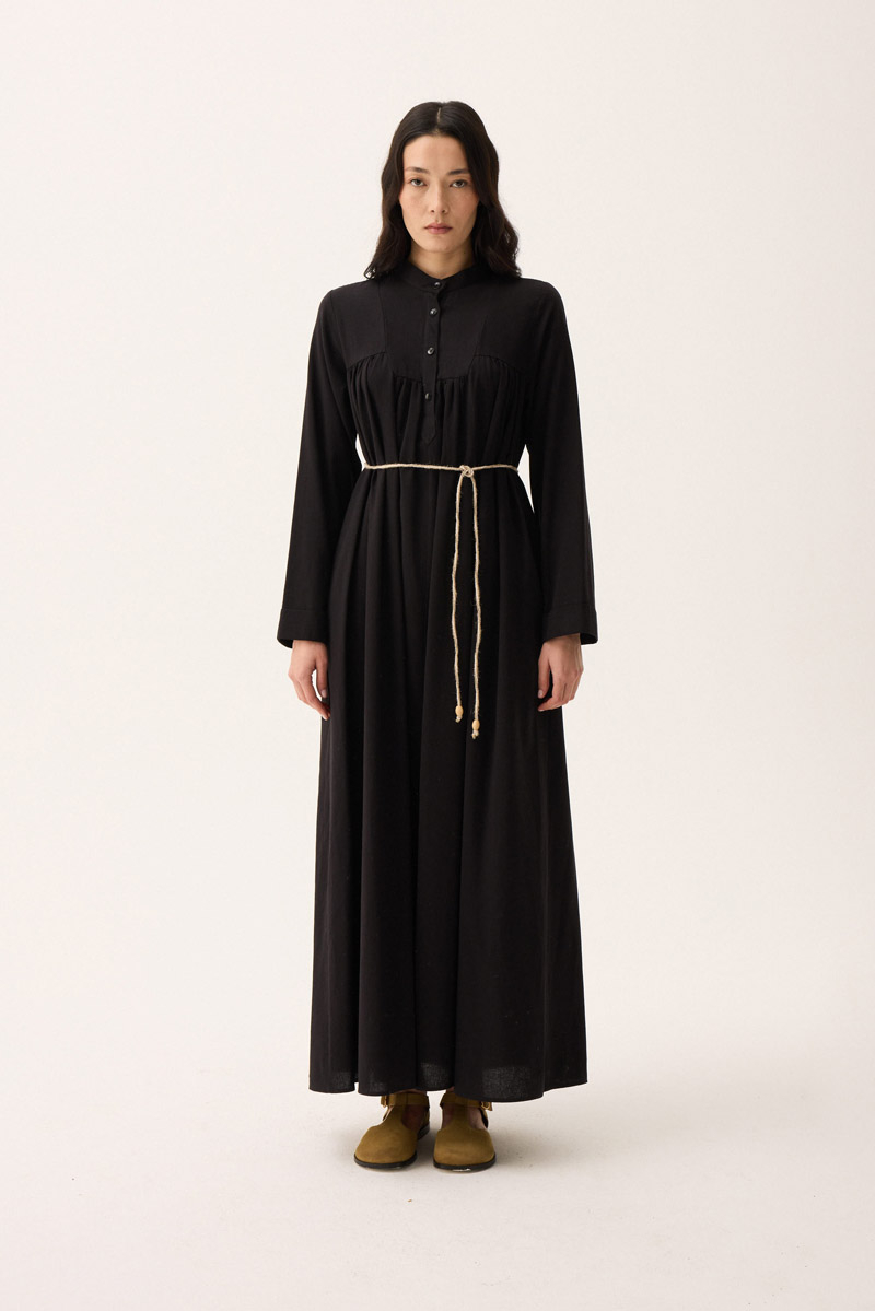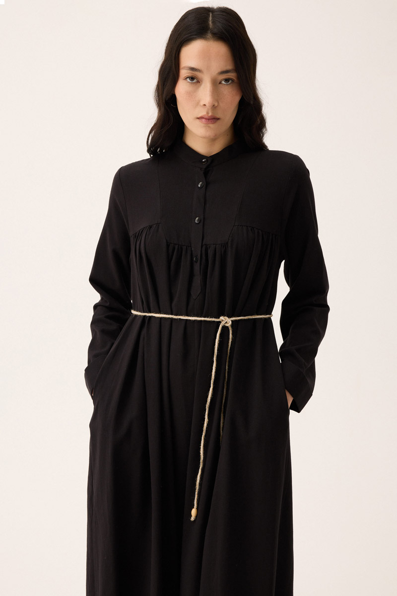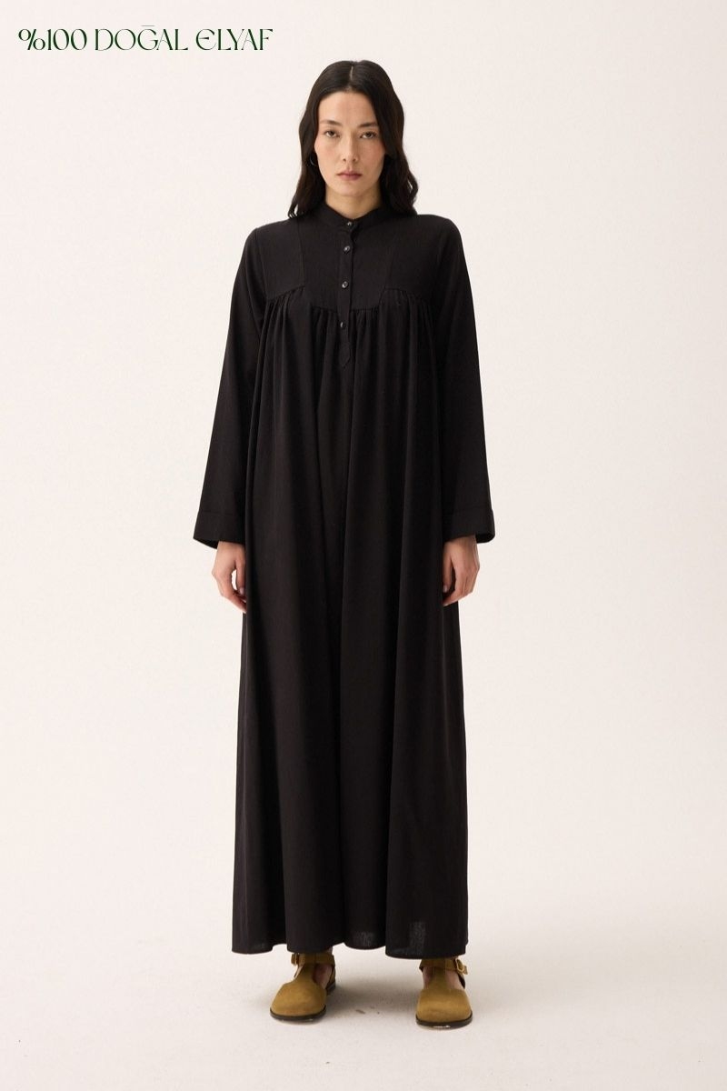 İmge Keten Elbise Siyah. Hakim yakadır, Önden büzgü ve roba detaylı olup düğmelidir. yandan ceplidir, double kolludur, bol kalıp, geniş kalıptır, belinde tahta boncuk detaylı hazır ip kordonludur, astarsızdır. Günlük kullanım ve özel günlerinizde tercih edebilirsiniz.