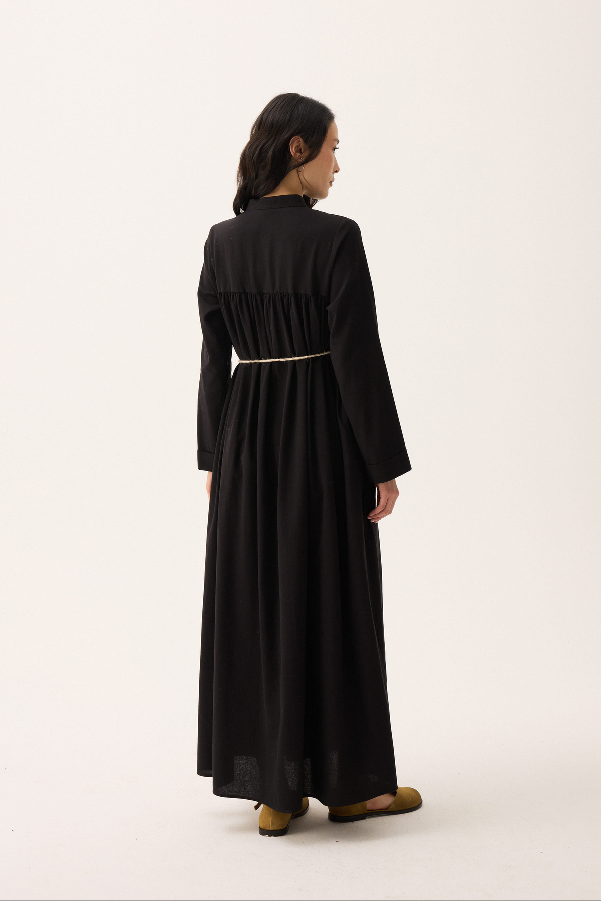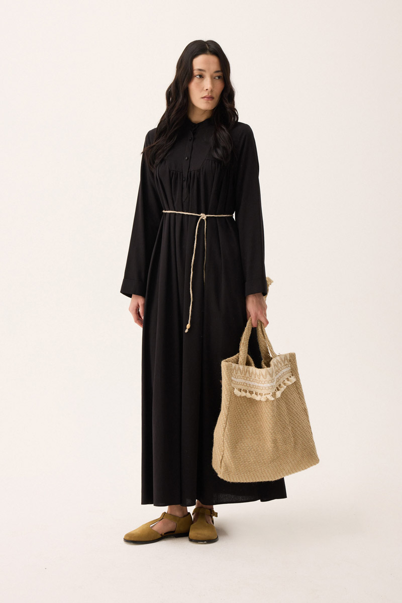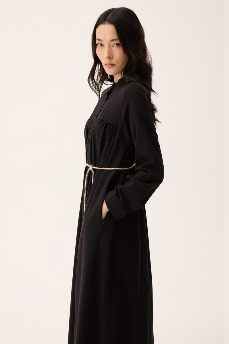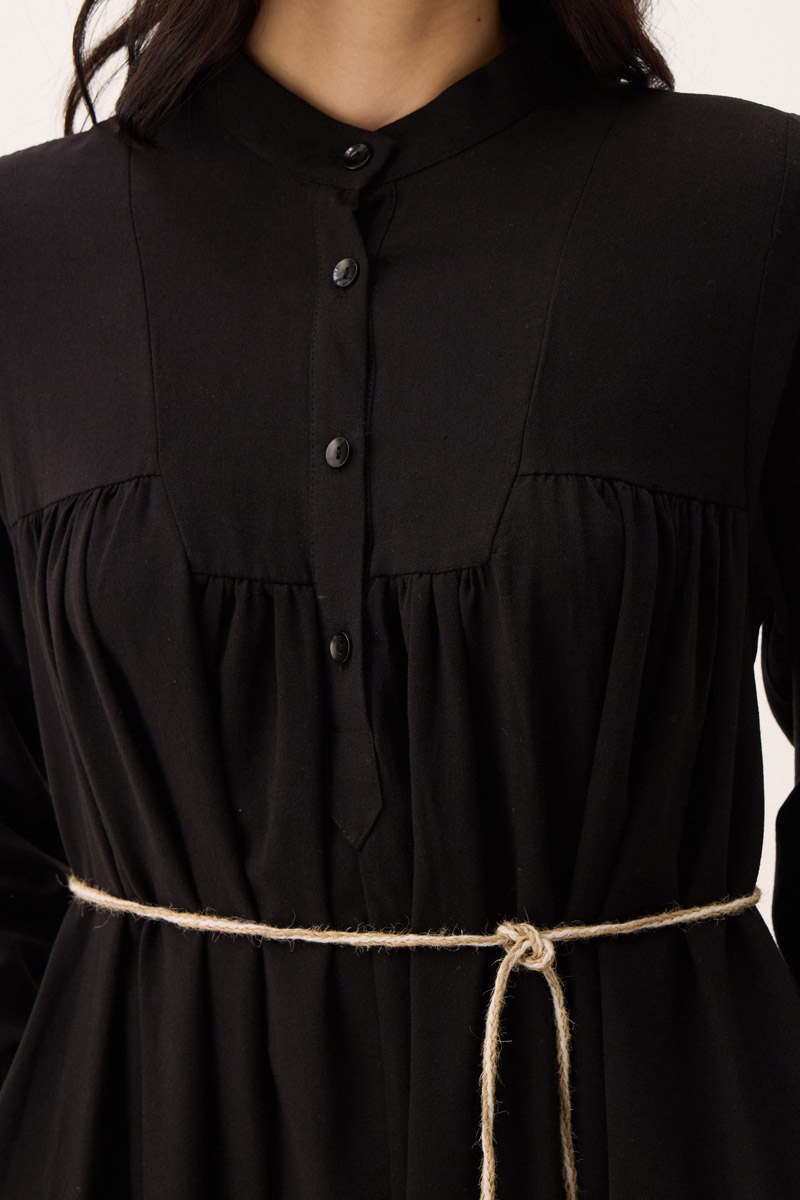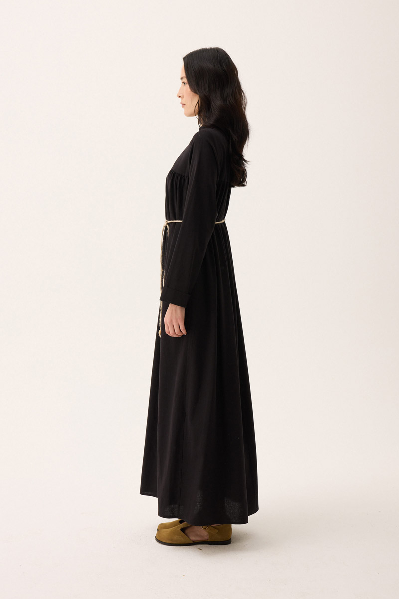 İmge Keten Elbise Siyah. Hakim yakadır, Önden büzgü ve roba detaylı olup düğmelidir. yandan ceplidir, double kolludur, bol kalıp, geniş kalıptır, belinde tahta boncuk detaylı hazır ip kordonludur, astarsızdır. Günlük kullanım ve özel günlerinizde tercih edebilirsiniz.