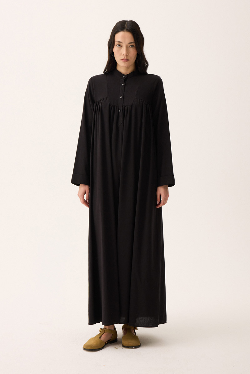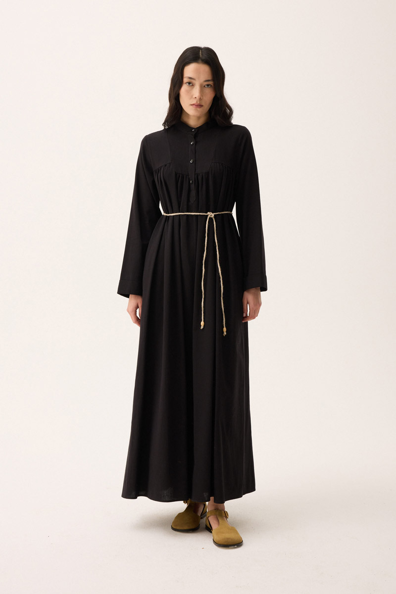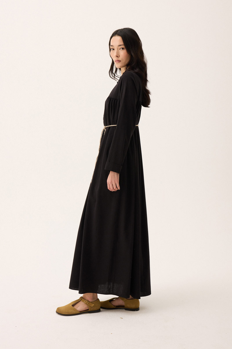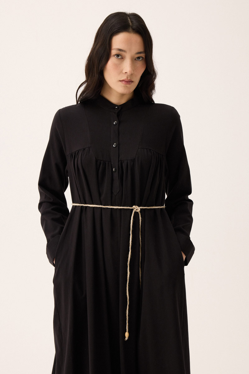İmge Keten Elbise Siyah. Hakim yakadır, Önden büzgü ve roba detaylı olup düğmelidir. yandan ceplidir, double kolludur, bol kalıp, geniş kalıptır, belinde tahta boncuk detaylı hazır ip kordonludur, astarsızdır. Günlük kullanım ve özel günlerinizde tercih edebilirsiniz.
