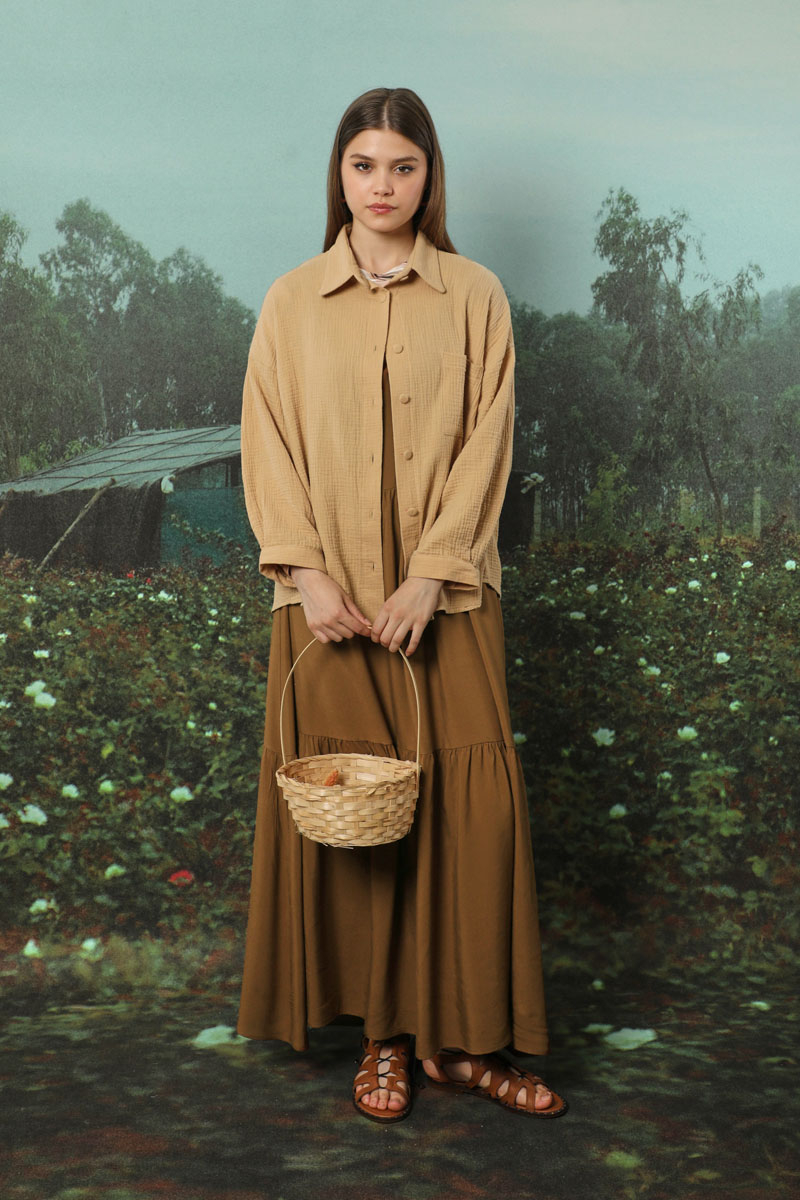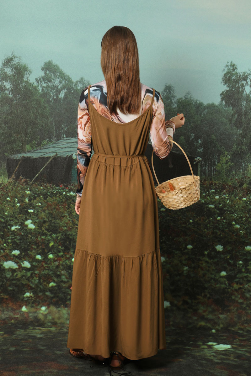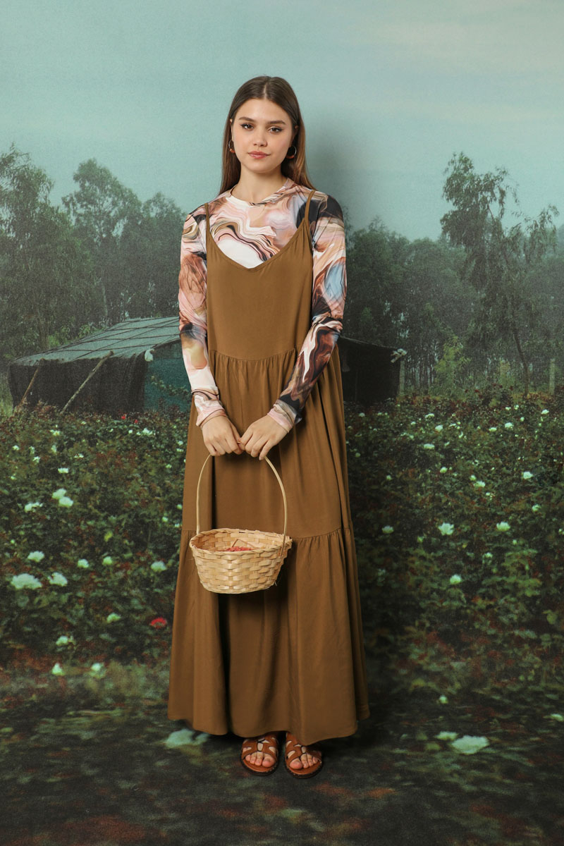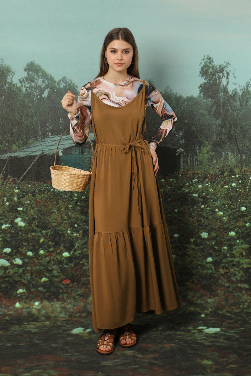 İnce Askılı Elbise Kahverengi.İnce kuşaklıdır. Büzgülü ve kesik detaylıdır. İnce askılıdır. V yakalıdır. Astarsızdır.