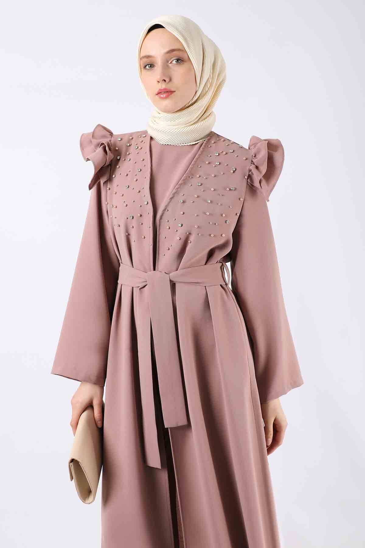 İnci İşlemeli Abaya Takım Gül Kurusu