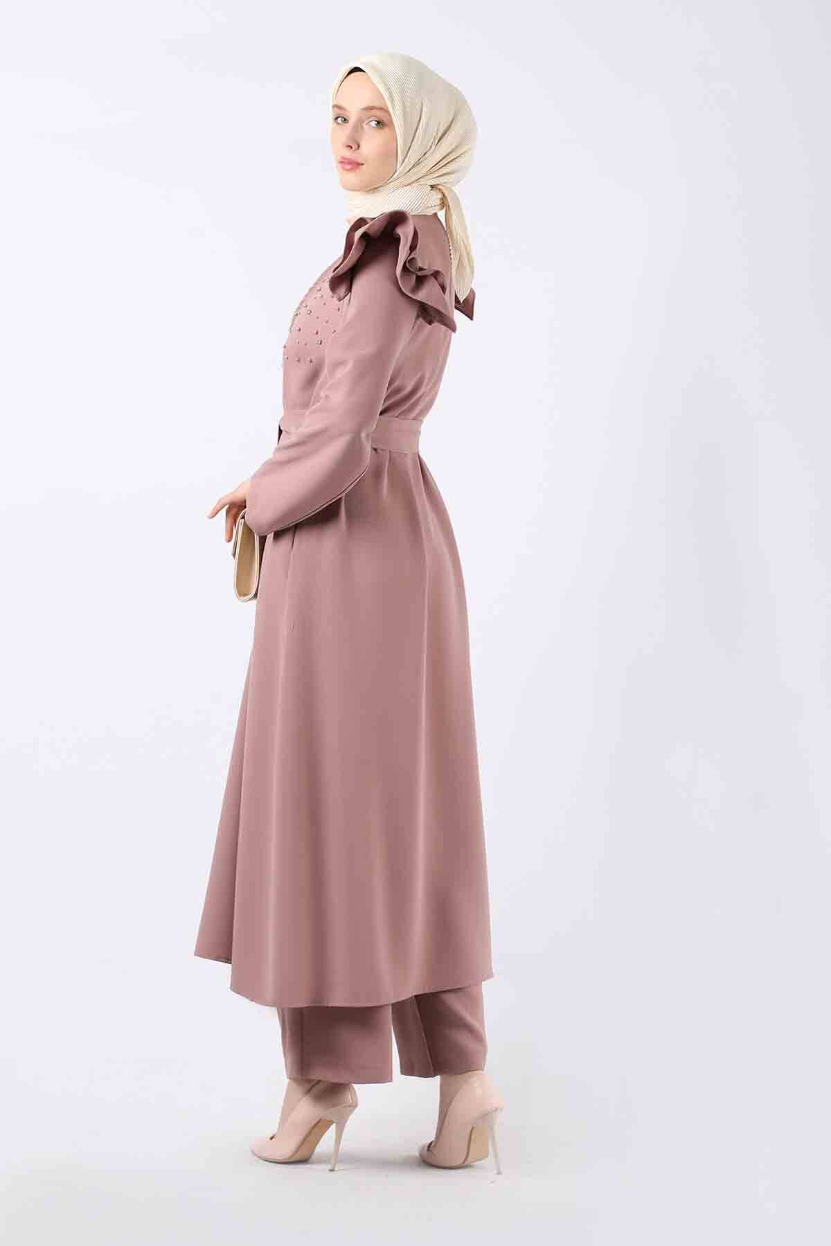 İnci İşlemeli Abaya Takım Gül Kurusu. Ceplidir. Kuşaklıdır. Omuzlarında fırfır detaylar mevcuttur. İnci detaylıdır. Pantolon Yüksek beldir ve lastiksizdir. Yeni sezonun favori ürünlerindendir.