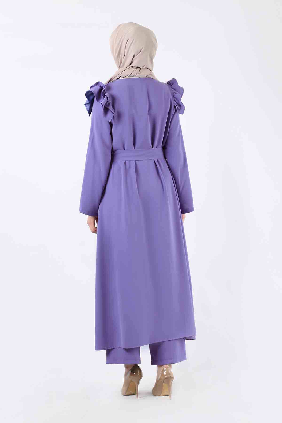 Pearl Embroidered Abaya Suit Blue. It has pockets. It is belted. It has ruffle details on the shoulders. Pearl detail. Trousers are high waisted and elastic. It is one of the favorite products of the new season.