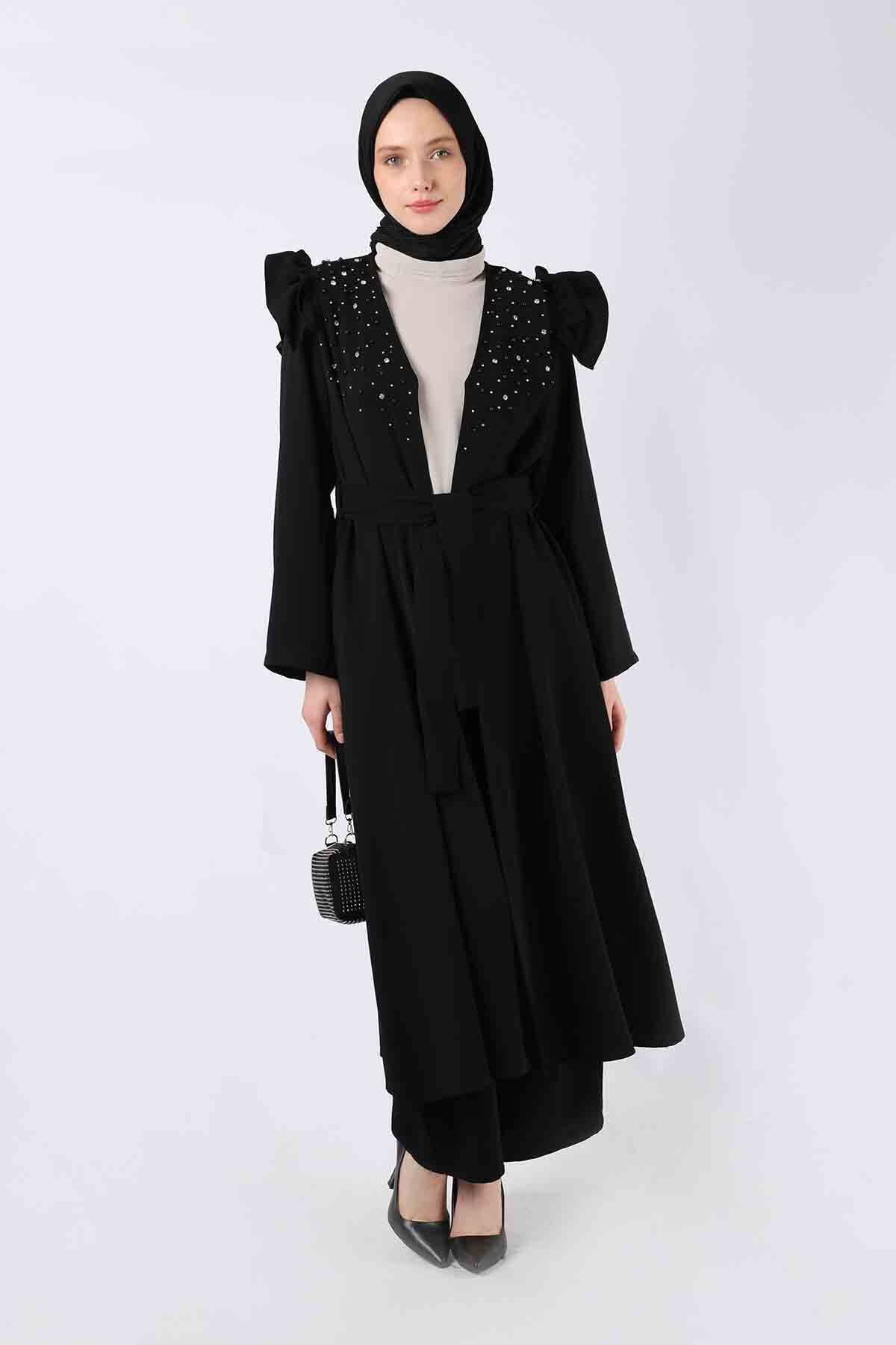 İnci İşlemeli Abaya Takım Siyah