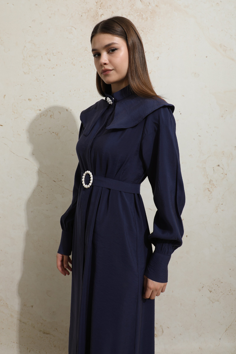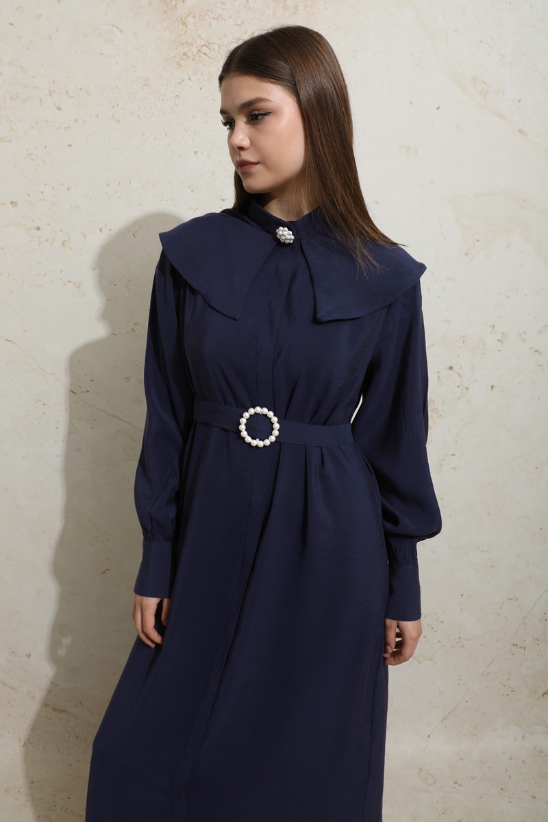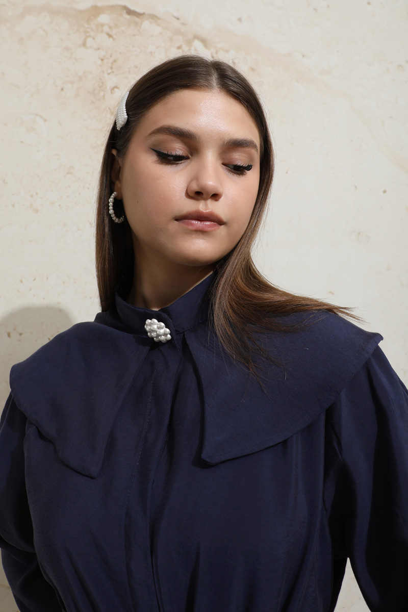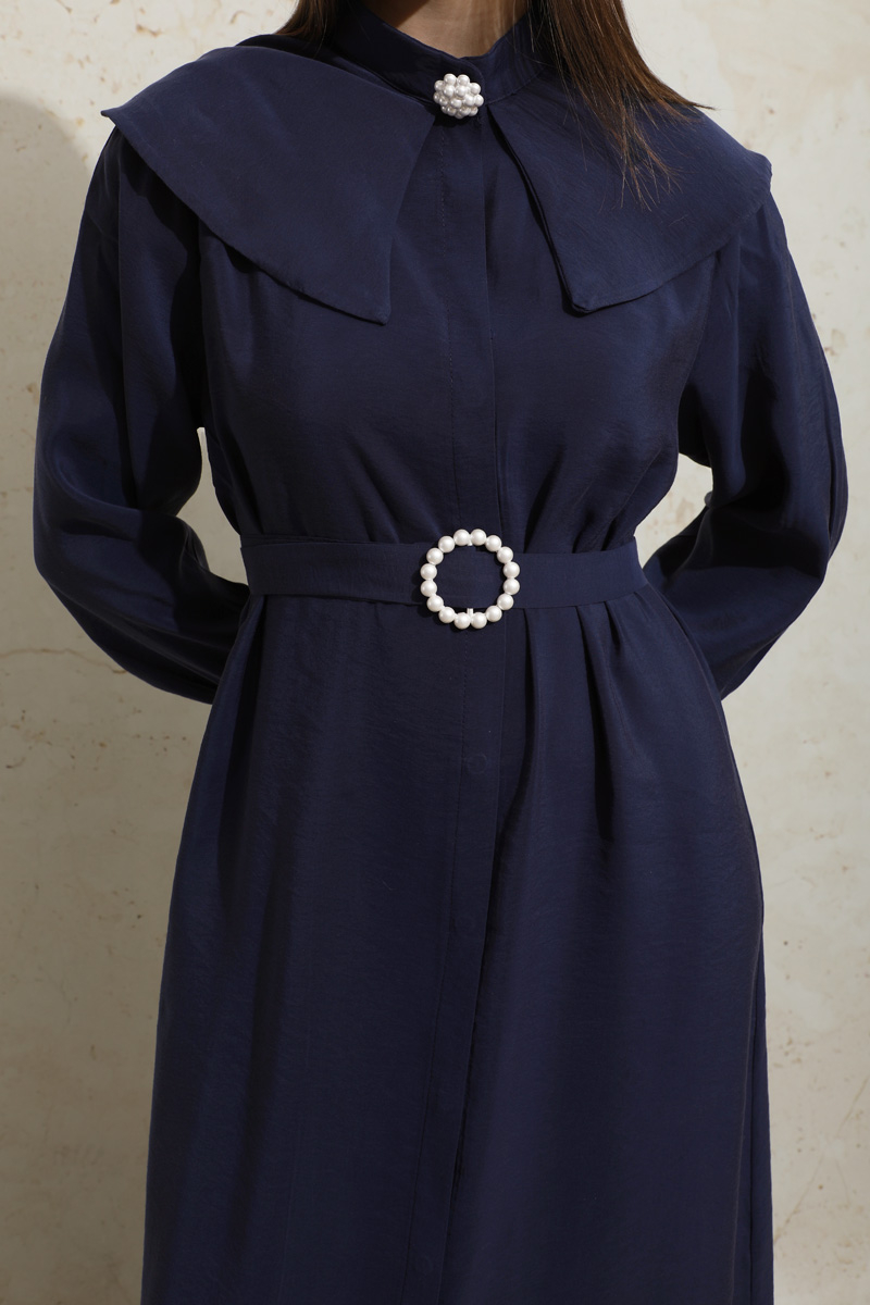 İncili Elbise Lacivert.Kollarında ve yakasında inci düğmesi mevcuttur, önden gizli düğmelidir, hakim yakalıdır, yakasında takma kısa pelerin parçası vardır, inci tokalı kuşağı mevcuttur, astarsızdır, cepsizdir.