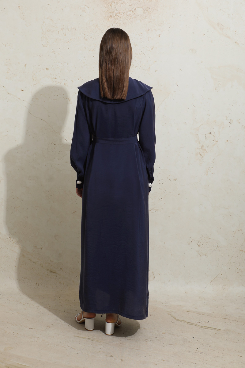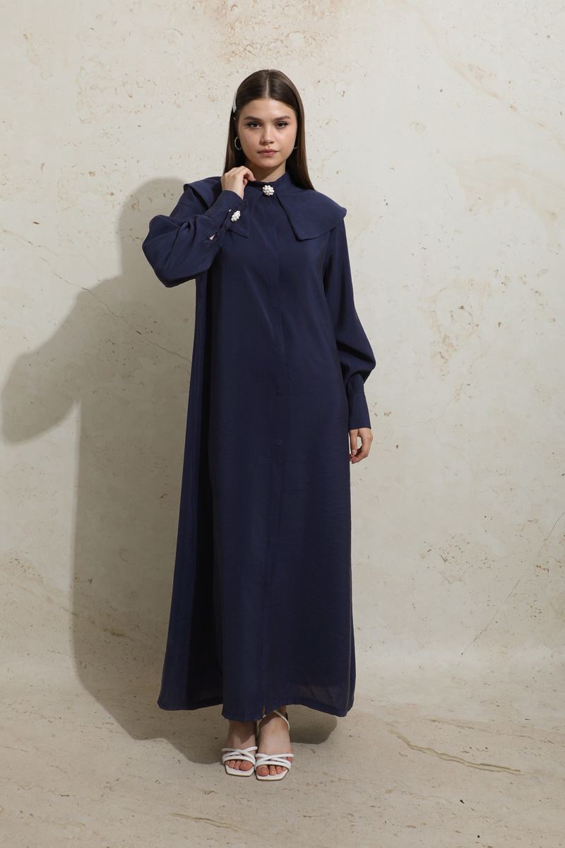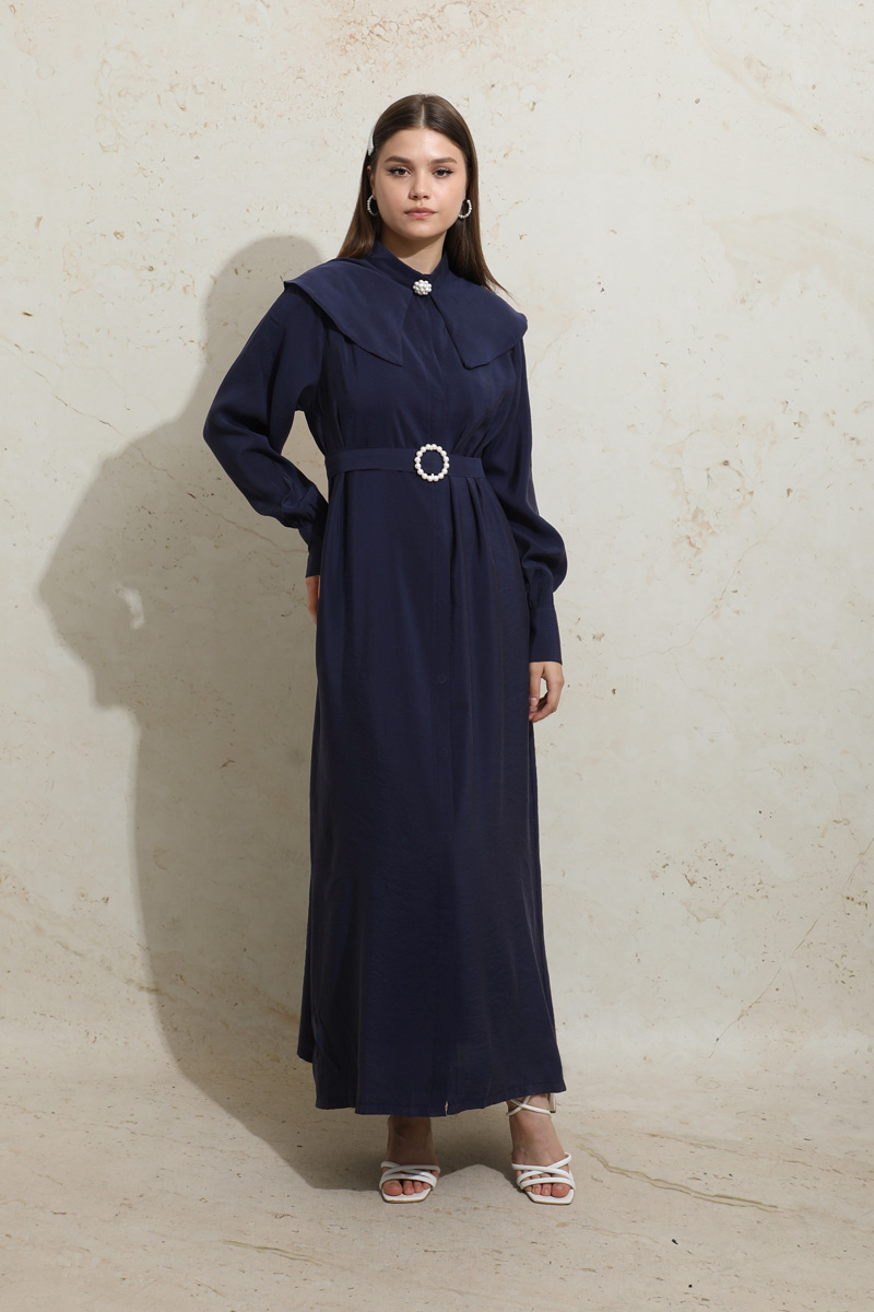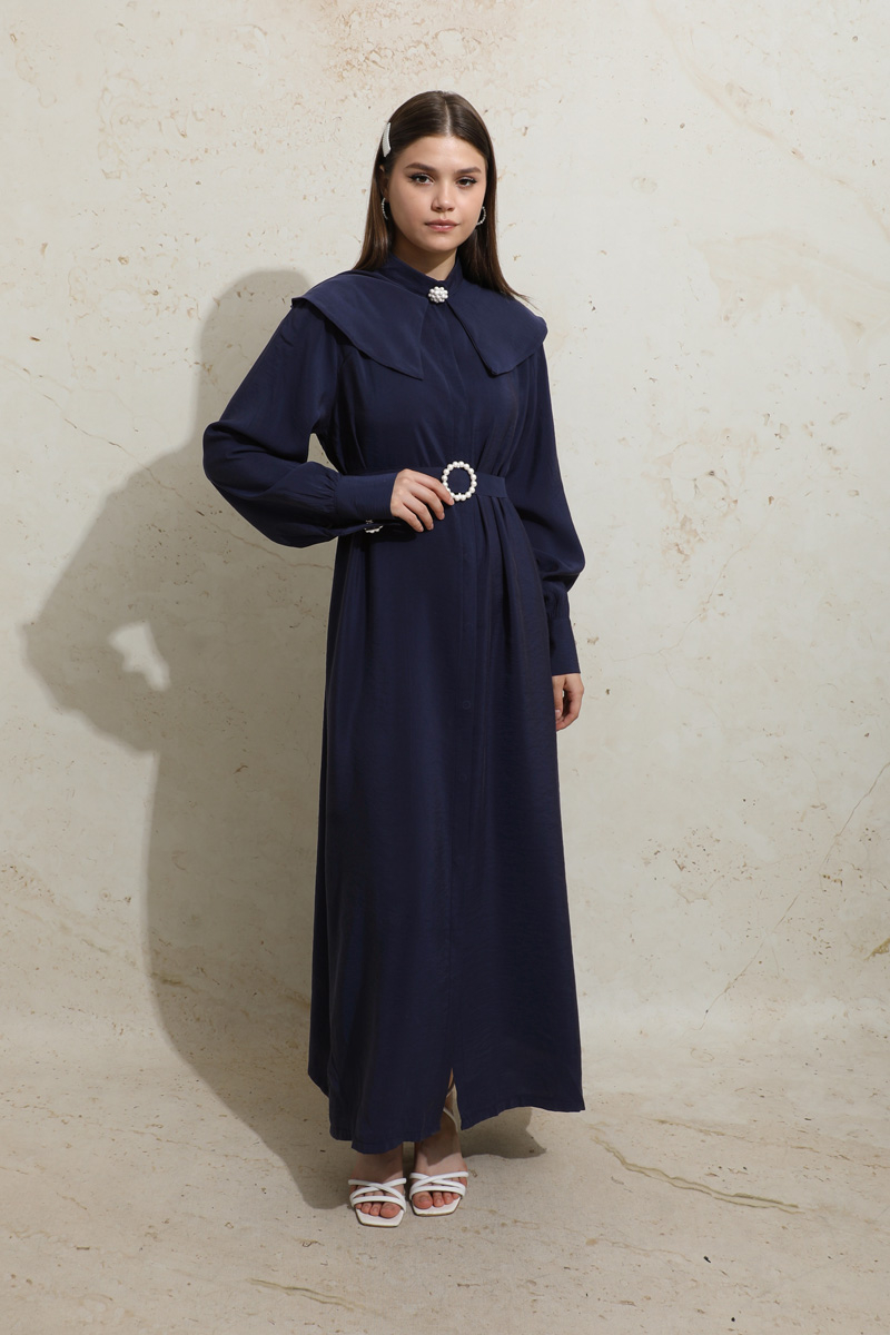 İncili Elbise Lacivert.Kollarında ve yakasında inci düğmesi mevcuttur, önden gizli düğmelidir, hakim yakalıdır, yakasında takma kısa pelerin parçası vardır, inci tokalı kuşağı mevcuttur, astarsızdır, cepsizdir.