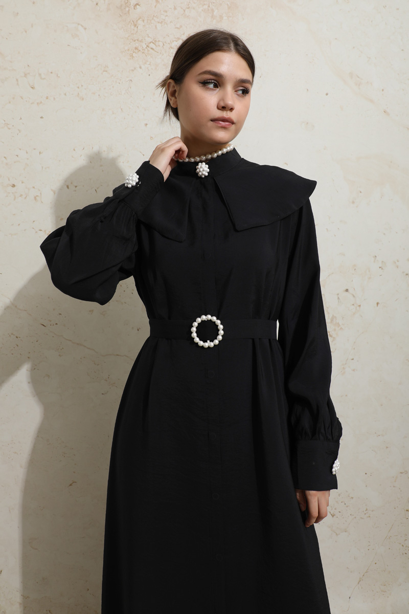 İncili Elbise Siyah.Kollarında ve yakasında inci düğmesi mevcuttur, önden gizli düğmelidir, hakim yakalıdır, yakasında takma kısa pelerin parçası vardır, inci tokalı kuşağı mevcuttur, astarsızdır, cepsizdir.
