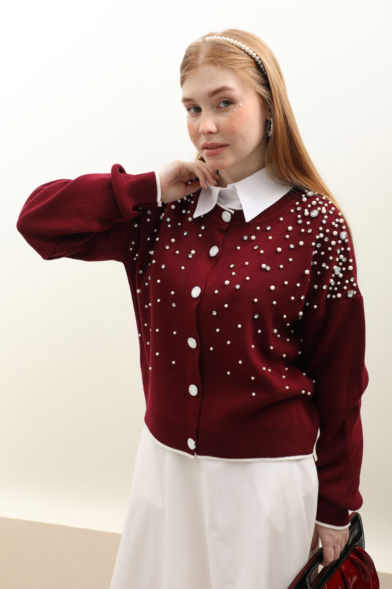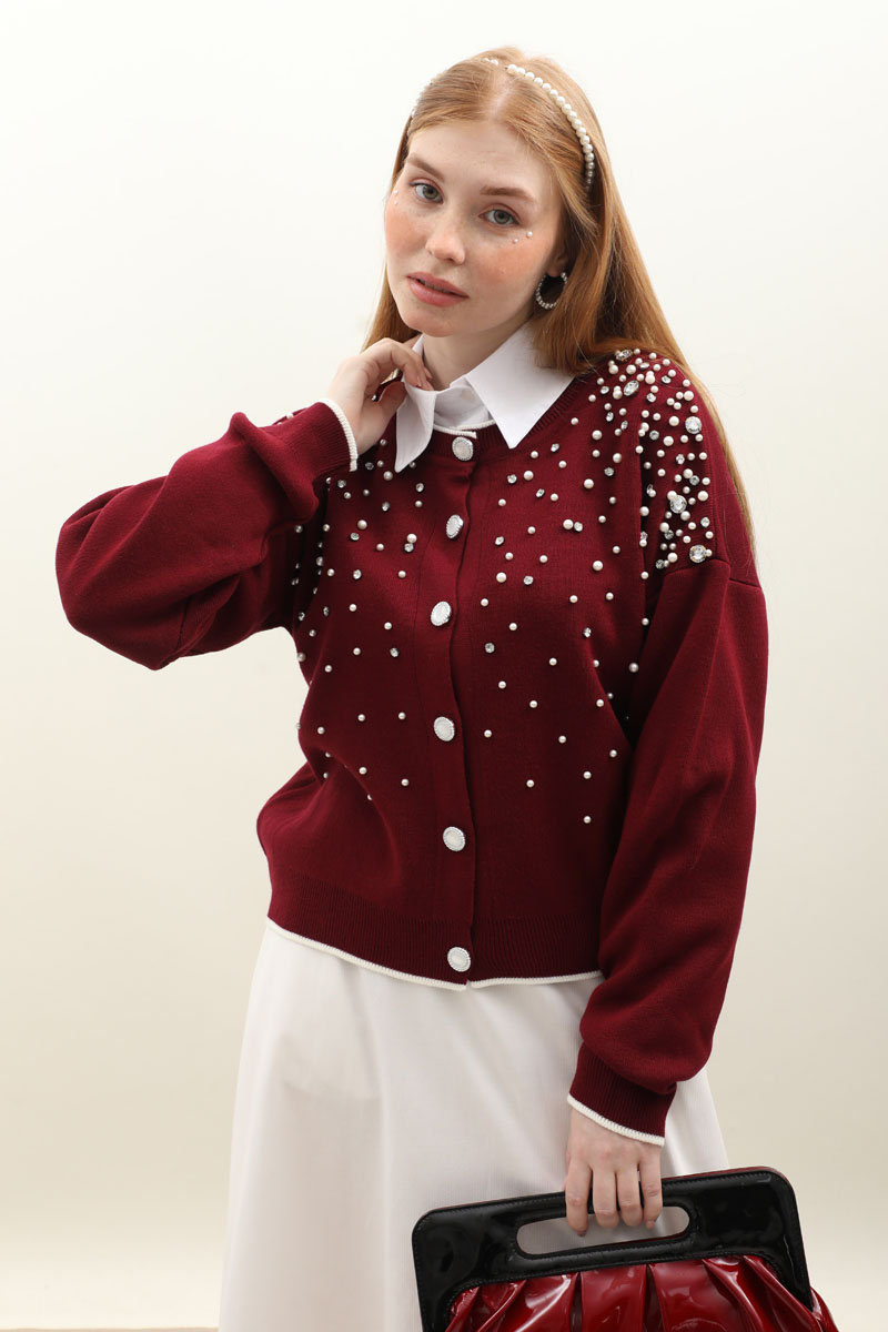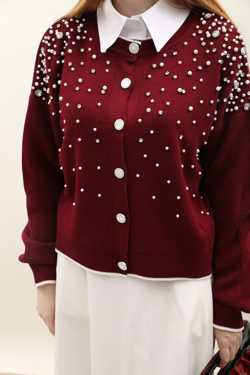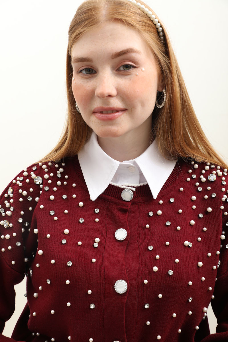 İncili Triko Hırka Bordo. Bisiklet yaka, düşük omuzlu, yakası manşeti etek ucu ribanalıdır, önden taşlı düğmeleri mevcut, ön kısmında taş ve inci detayları vardır. Etek, elbise ve pantolon üzerine tercih edilebilir. Kış aylarında tercih edebilirsiniz.