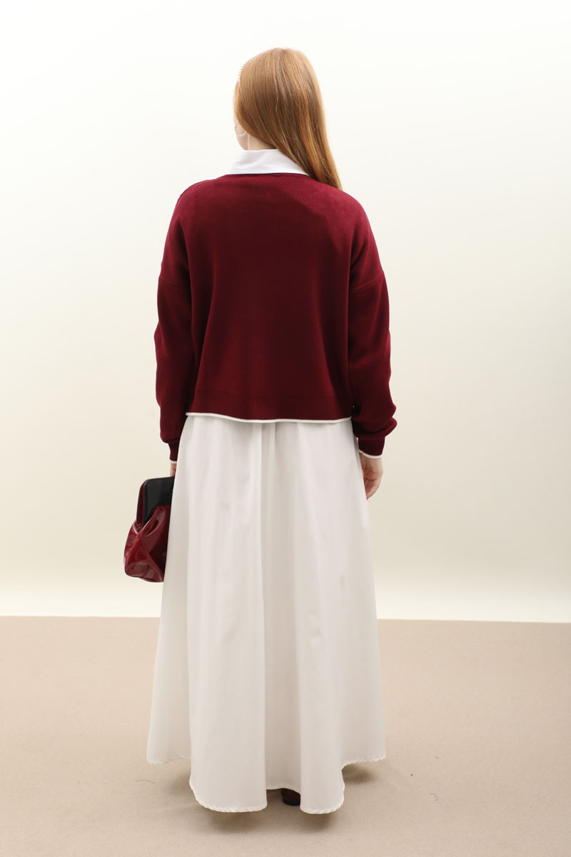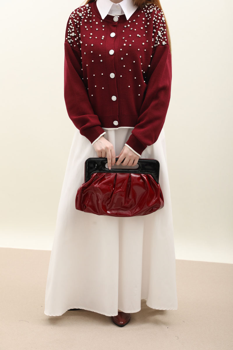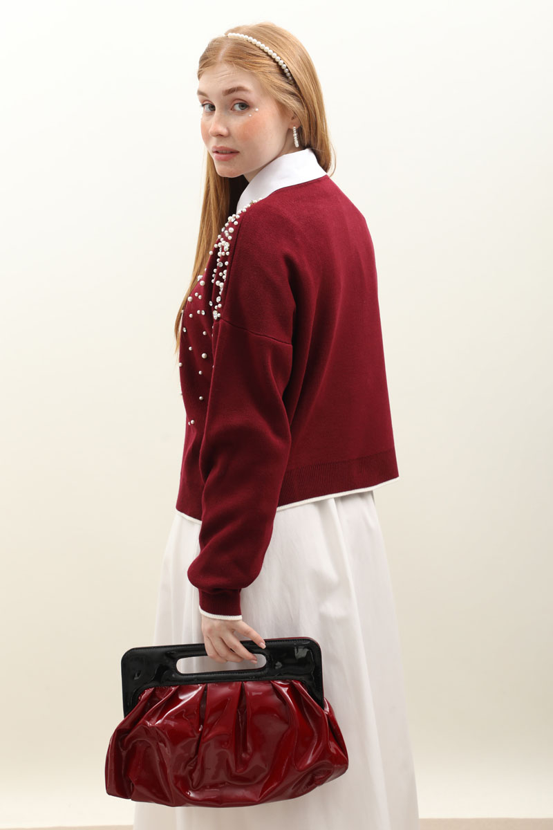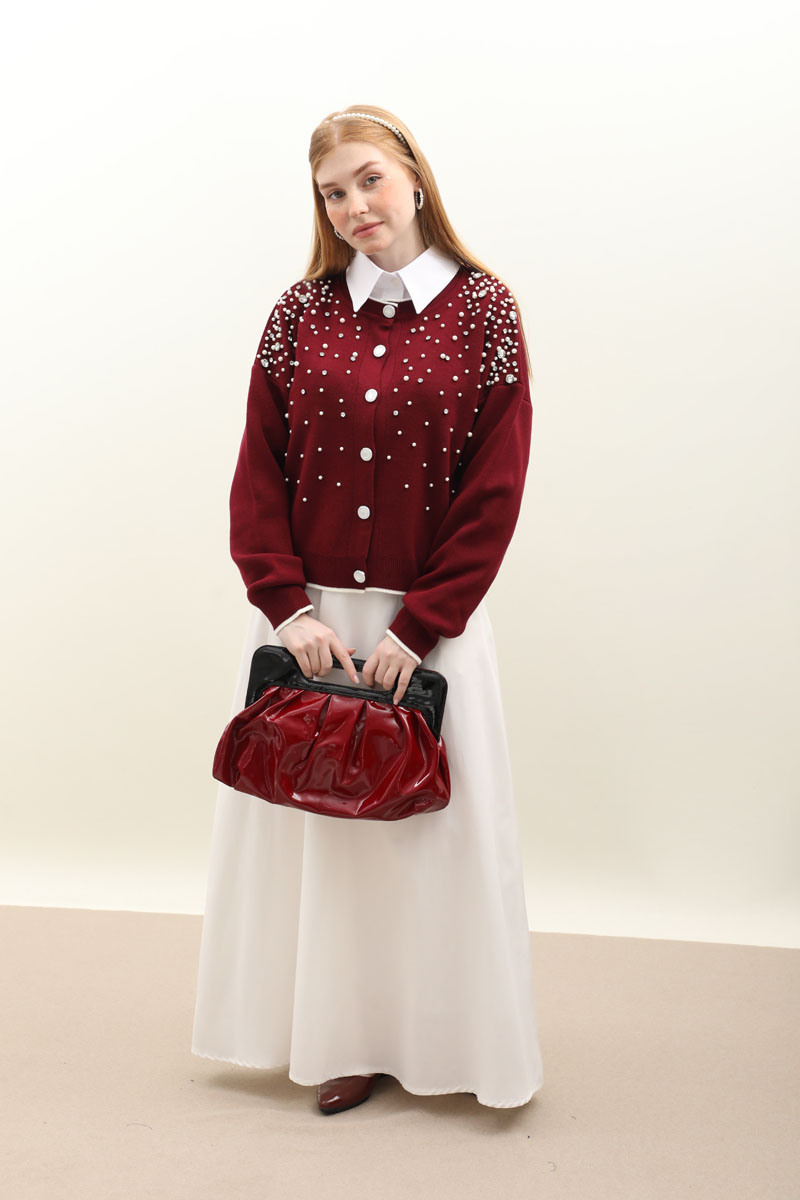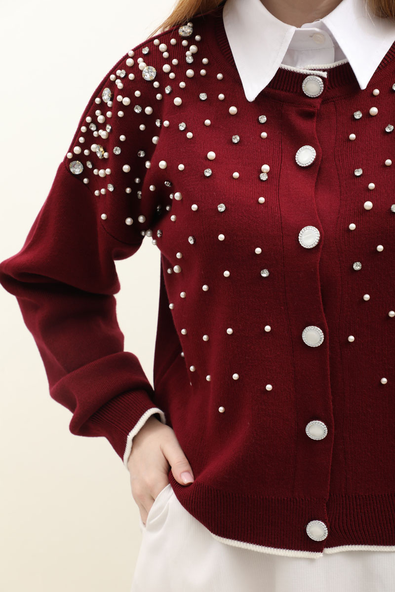 İncili Triko Hırka Bordo. Bisiklet yaka, düşük omuzlu, yakası manşeti etek ucu ribanalıdır, önden taşlı düğmeleri mevcut, ön kısmında taş ve inci detayları vardır. Etek, elbise ve pantolon üzerine tercih edilebilir. Kış aylarında tercih edebilirsiniz.
