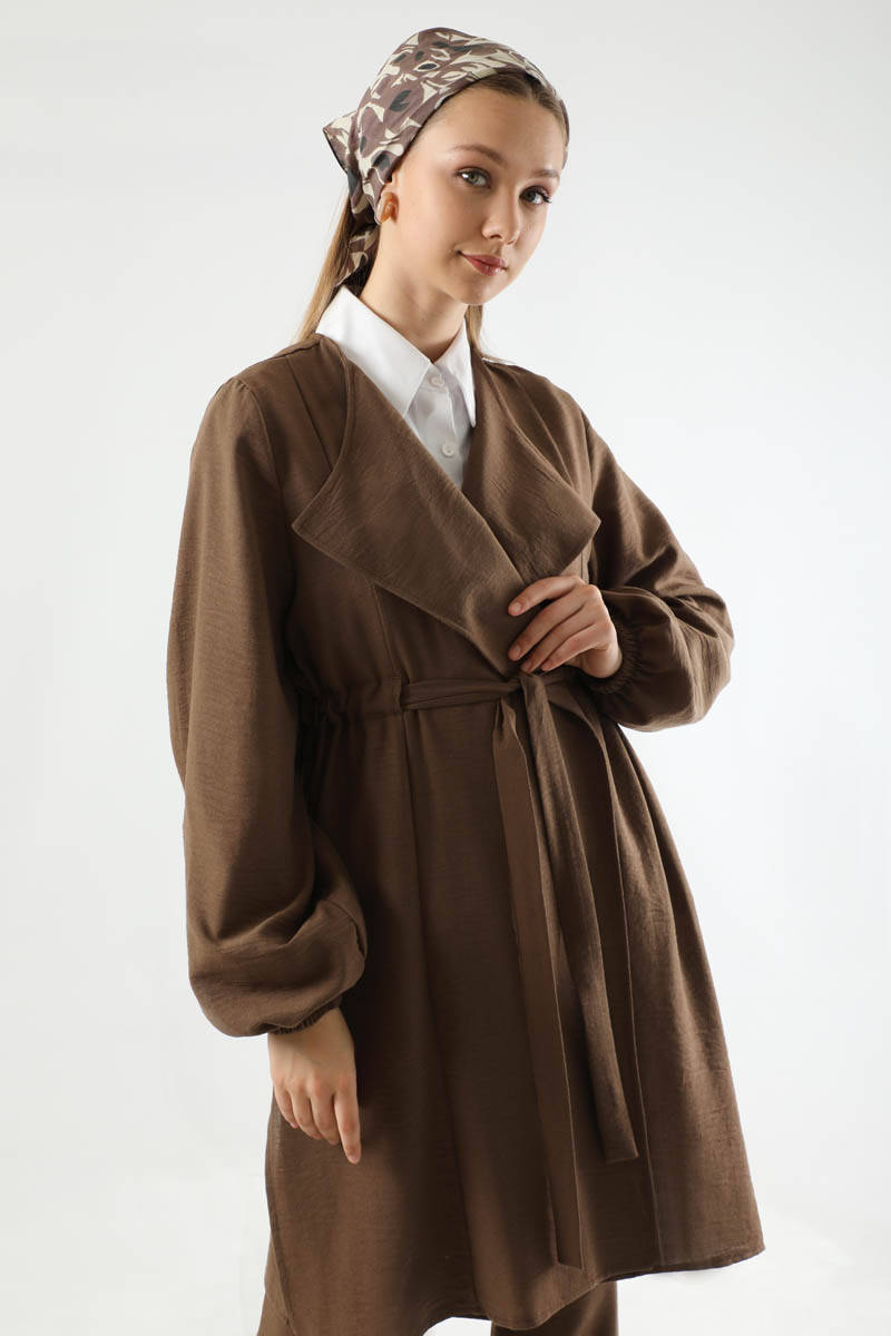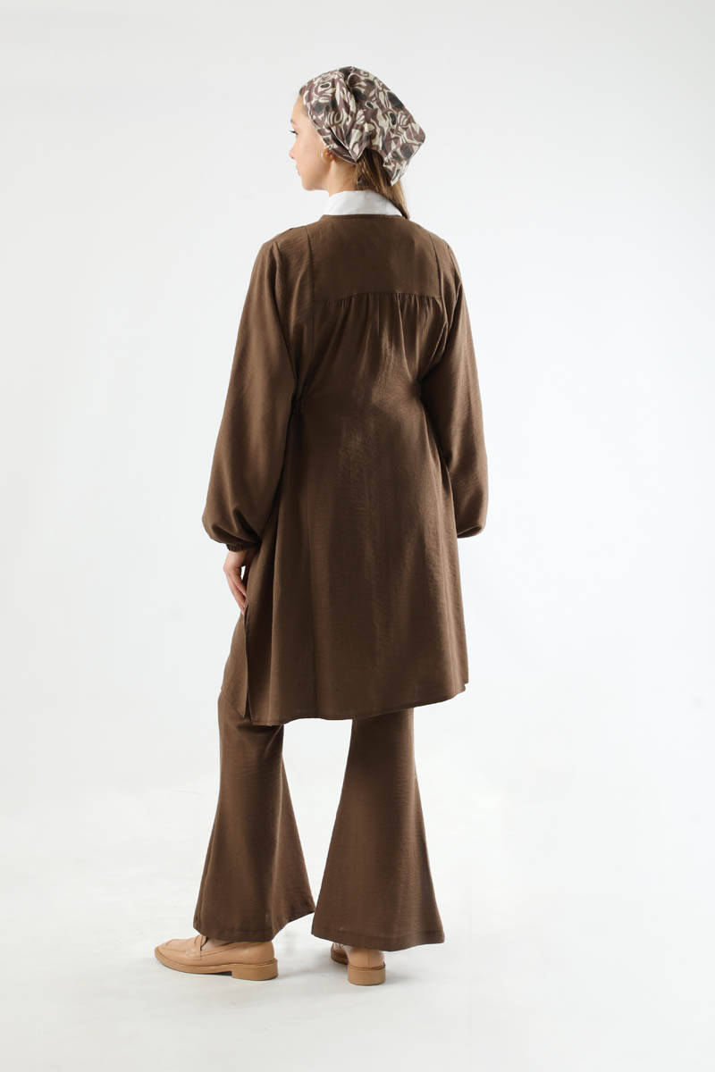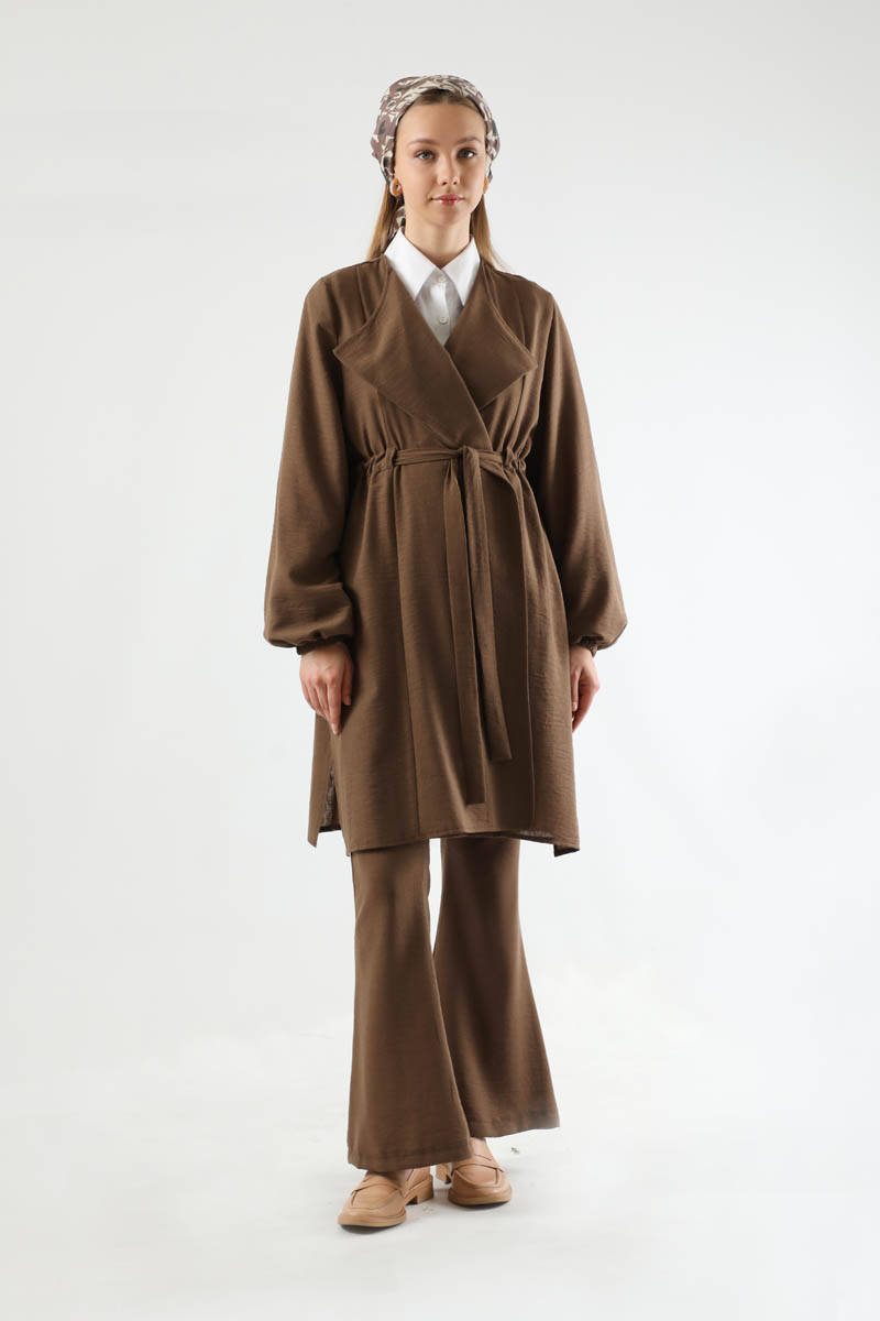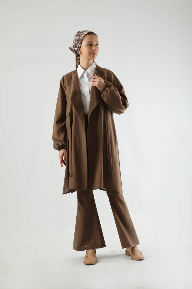 İspanyol Paça Kimono Takım Kahve. Yelek yırtmaç detaylıdır ve Arkadan robalıdır. Yelek şal yakalıdır, bel köprü detaylıdır. Pantolon beli lastiklidir ve İspanyol paçadır. Günlük kullanım ve özel günlerinizde tercih edebilirsiniz.