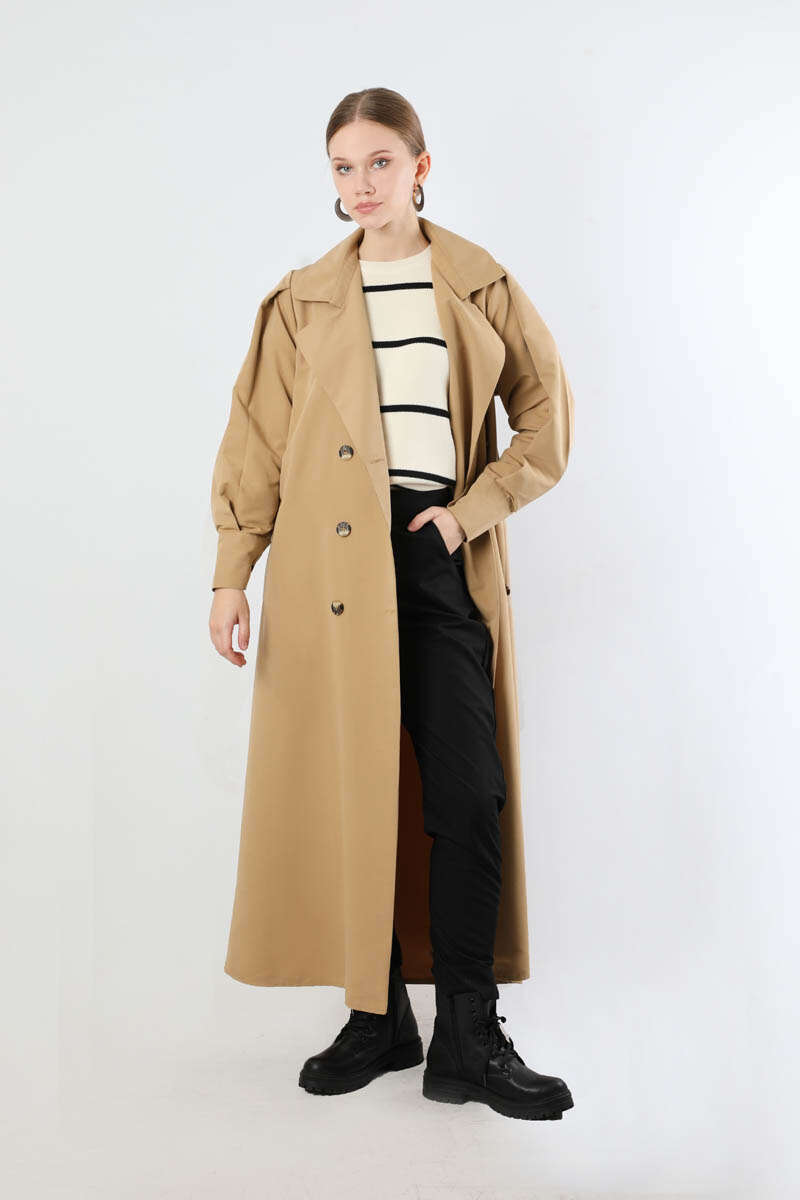 Jamin Trench Coat Camel. It is an English collar and double-breasted closure. The trench coat is belted at the waist and has pocket details. The product is unlined.