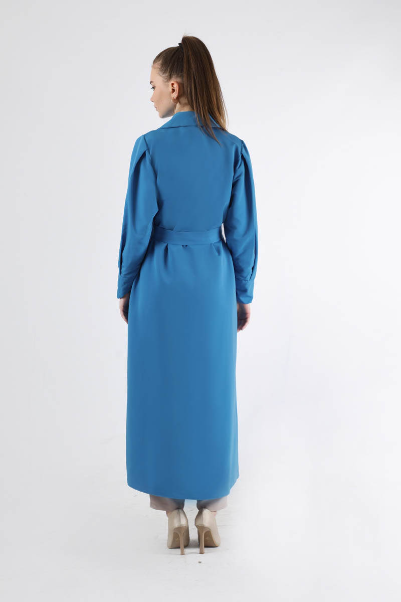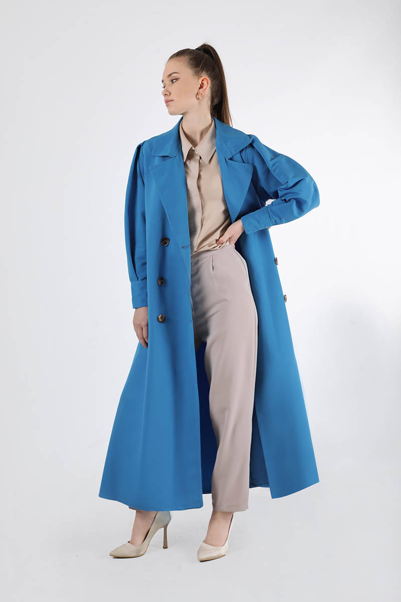 Jamin Trench Coat Blue. It is an English collar and double-breasted closure. The trench coat is belted at the waist and has pocket details. The product is unlined.