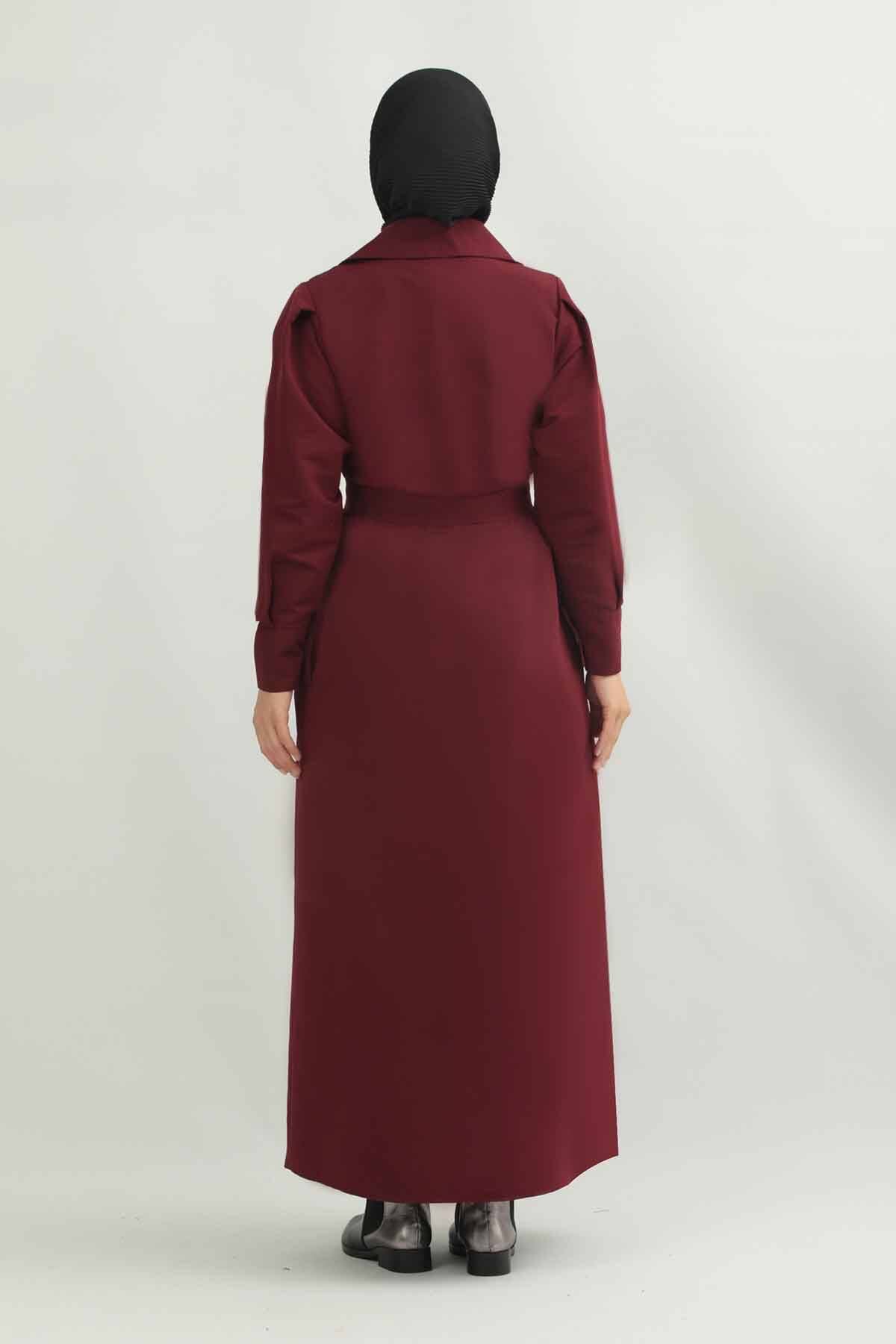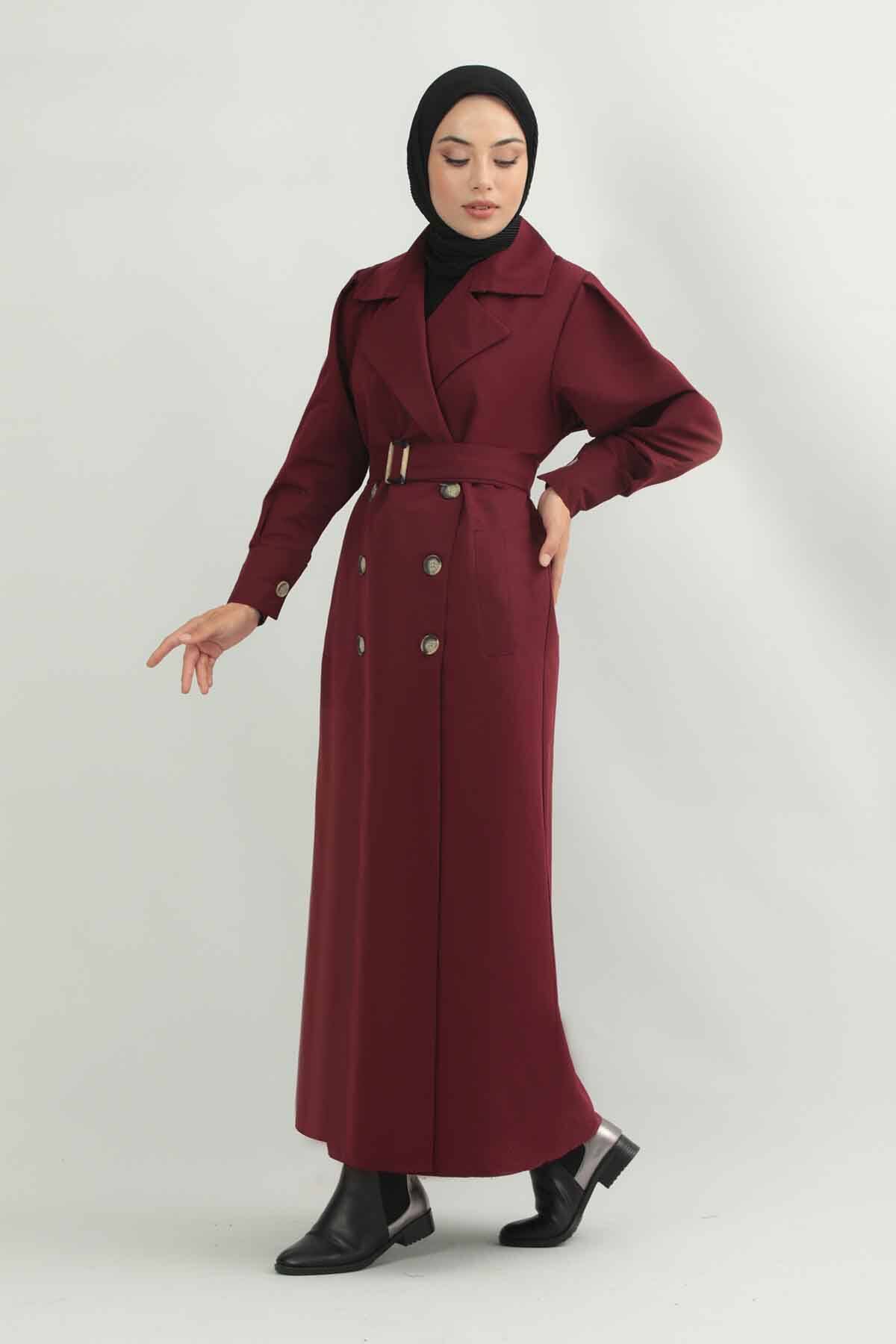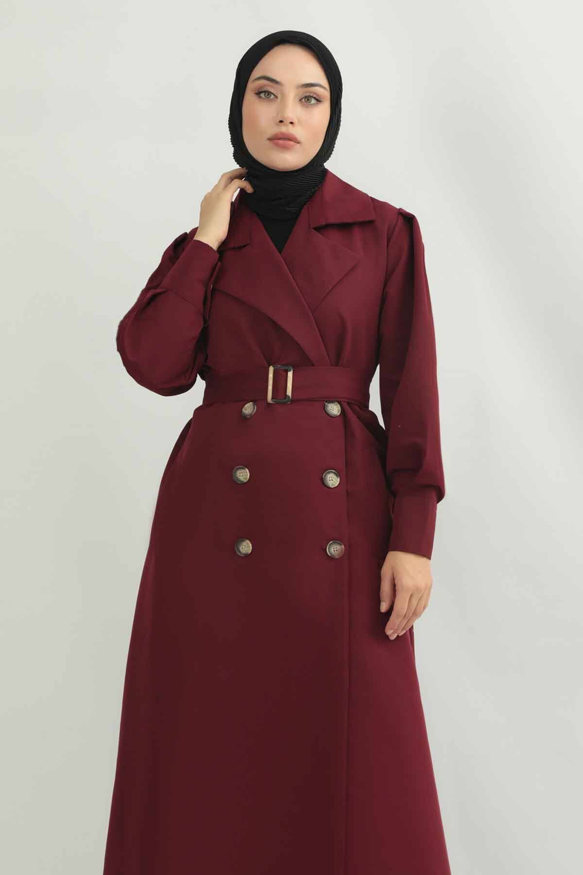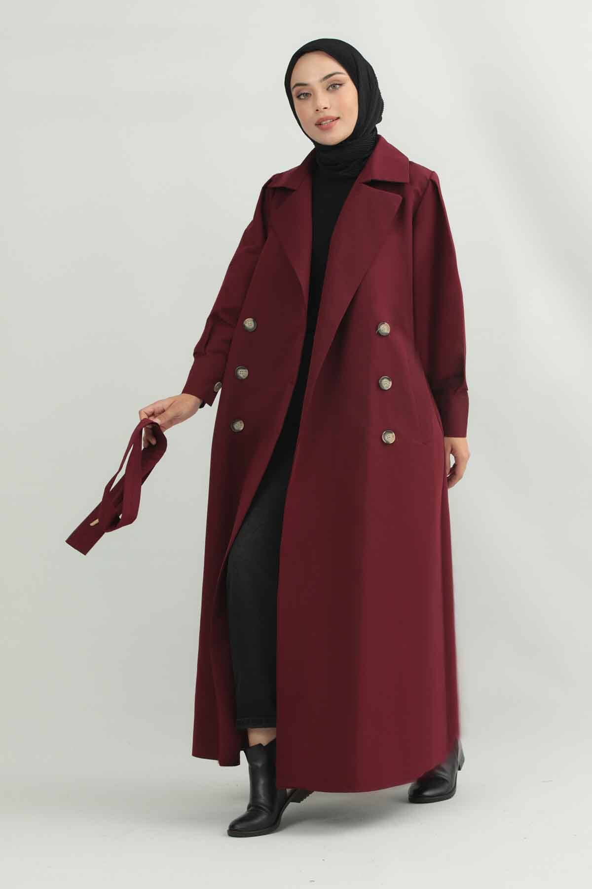 Jamin Trench Coat Burgundy. It is an English collar and double-breasted closure. The trench coat is belted at the waist and has pocket details. The product is unlined.