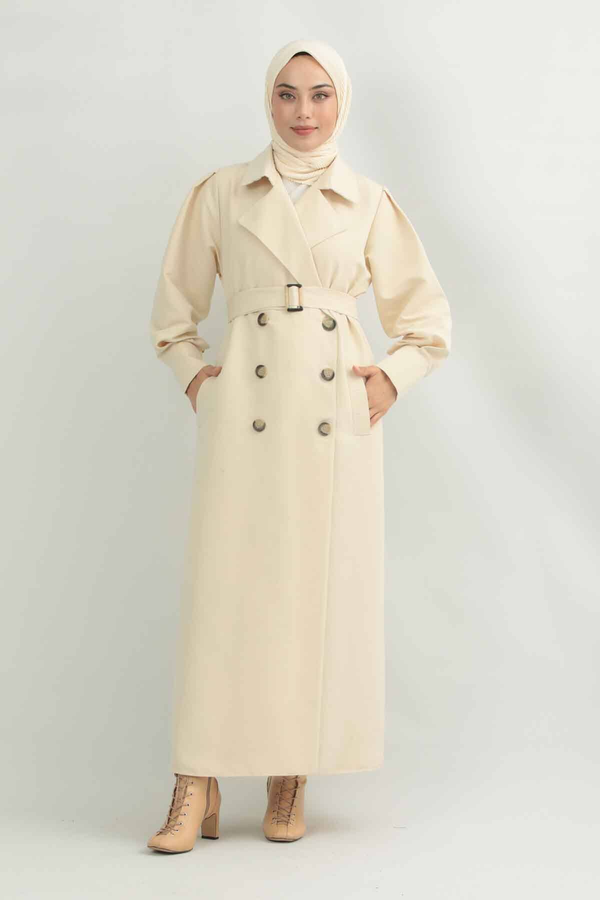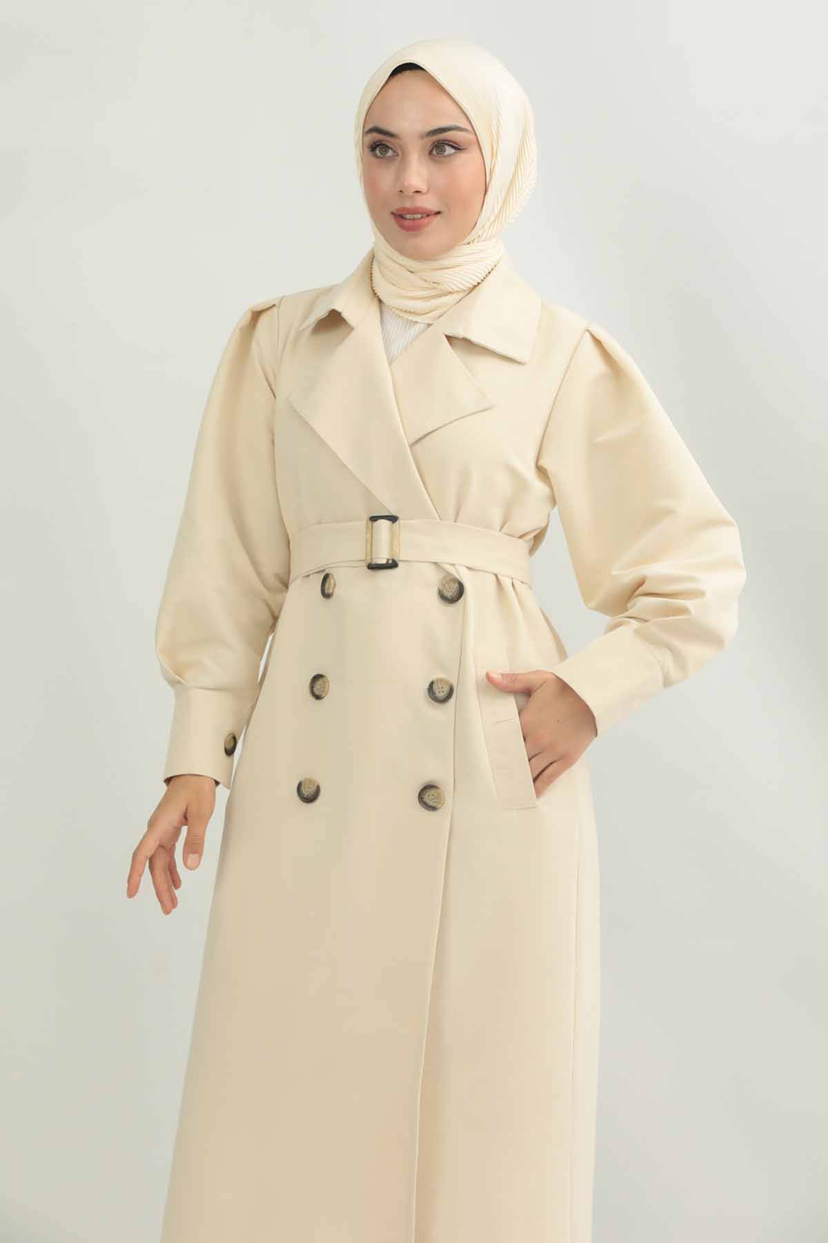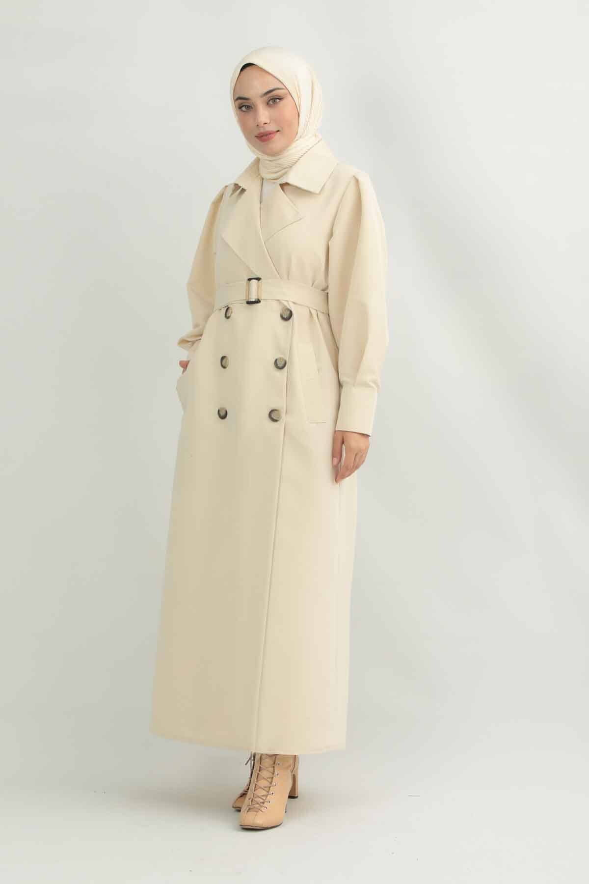 Jamin Trench Coat Cream. It is an English collar and double-breasted closure. The trench coat is belted at the waist and has pocket details. The product is unlined.