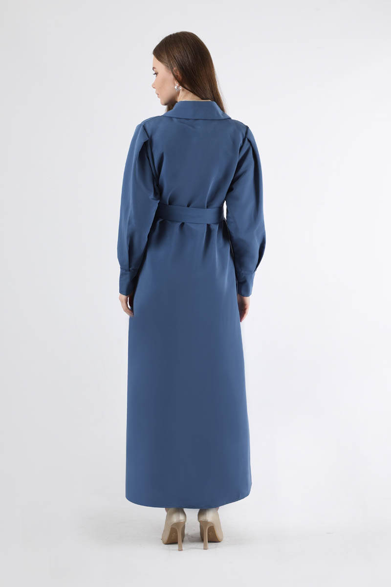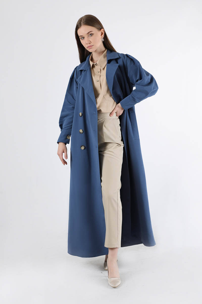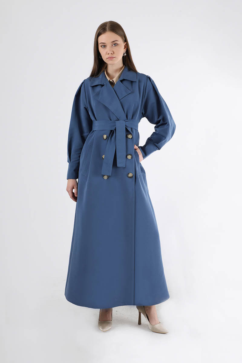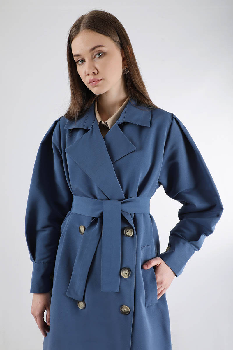 Jamin Trench Coat İndigo. It is an English collar and double-breasted closure. The trench coat is belted at the waist and has pocket details. The product is unlined.