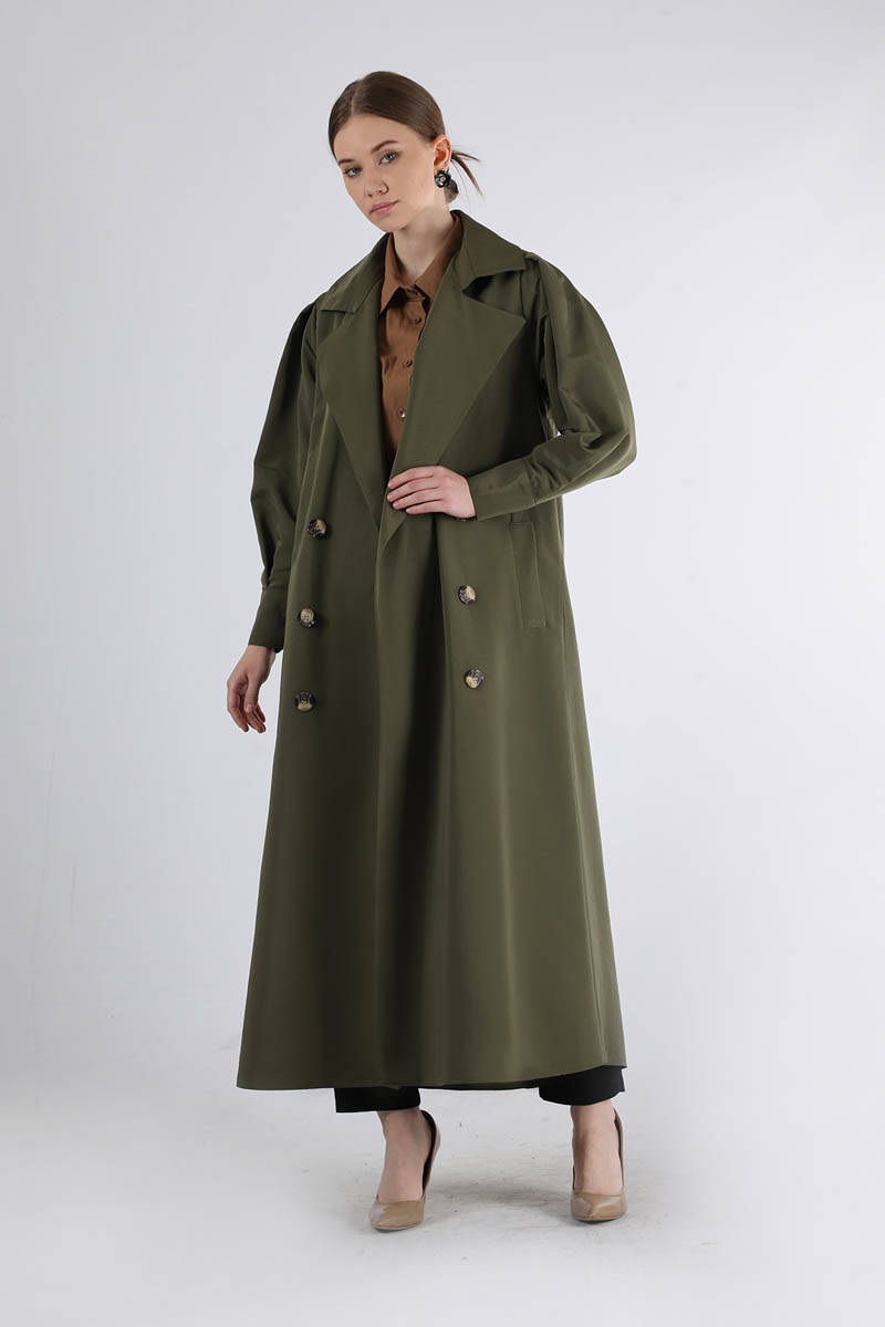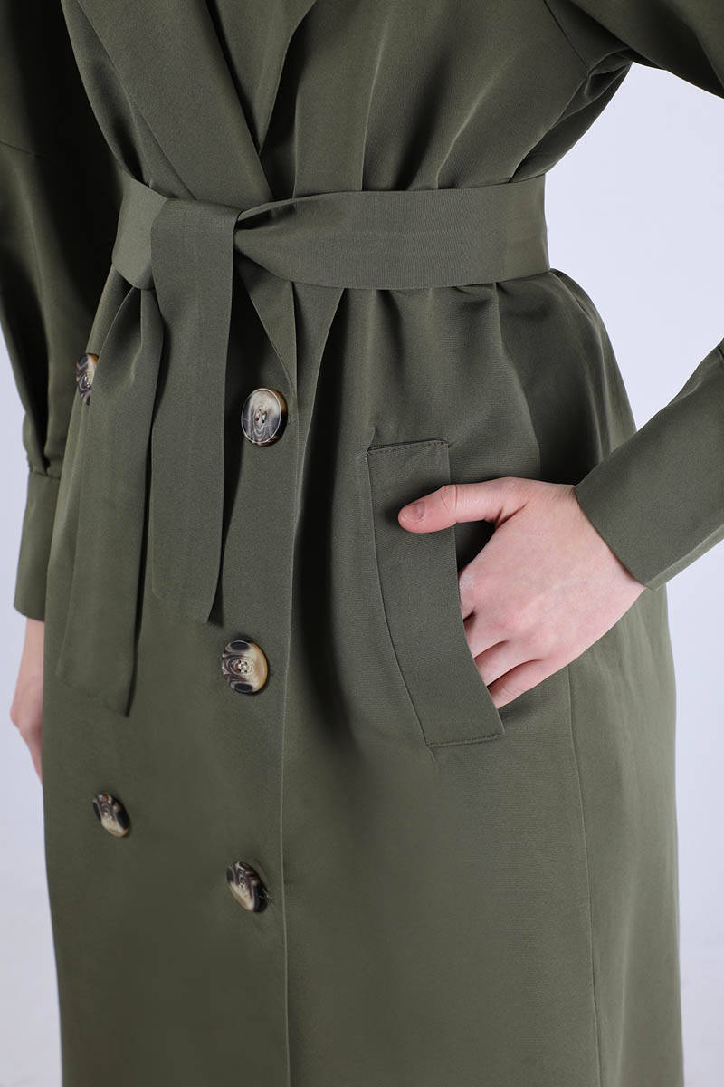 Jamin Trench Coat Khaki. It is an English collar and double-breasted closure. The trench coat is belted at the waist and has pocket details. The product is unlined.