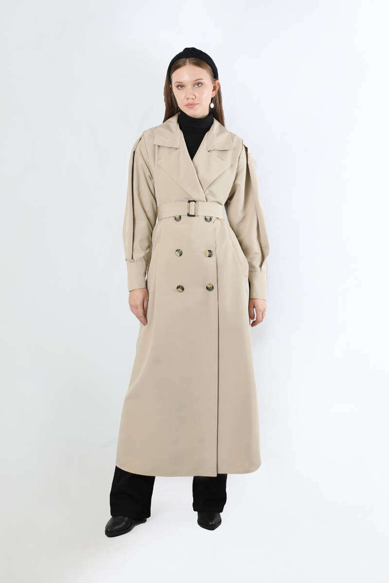 Jamin Trench Coat Stone. It is an English collar and double-breasted closure. The trench coat is belted at the waist and has pocket details. The product is unlined.