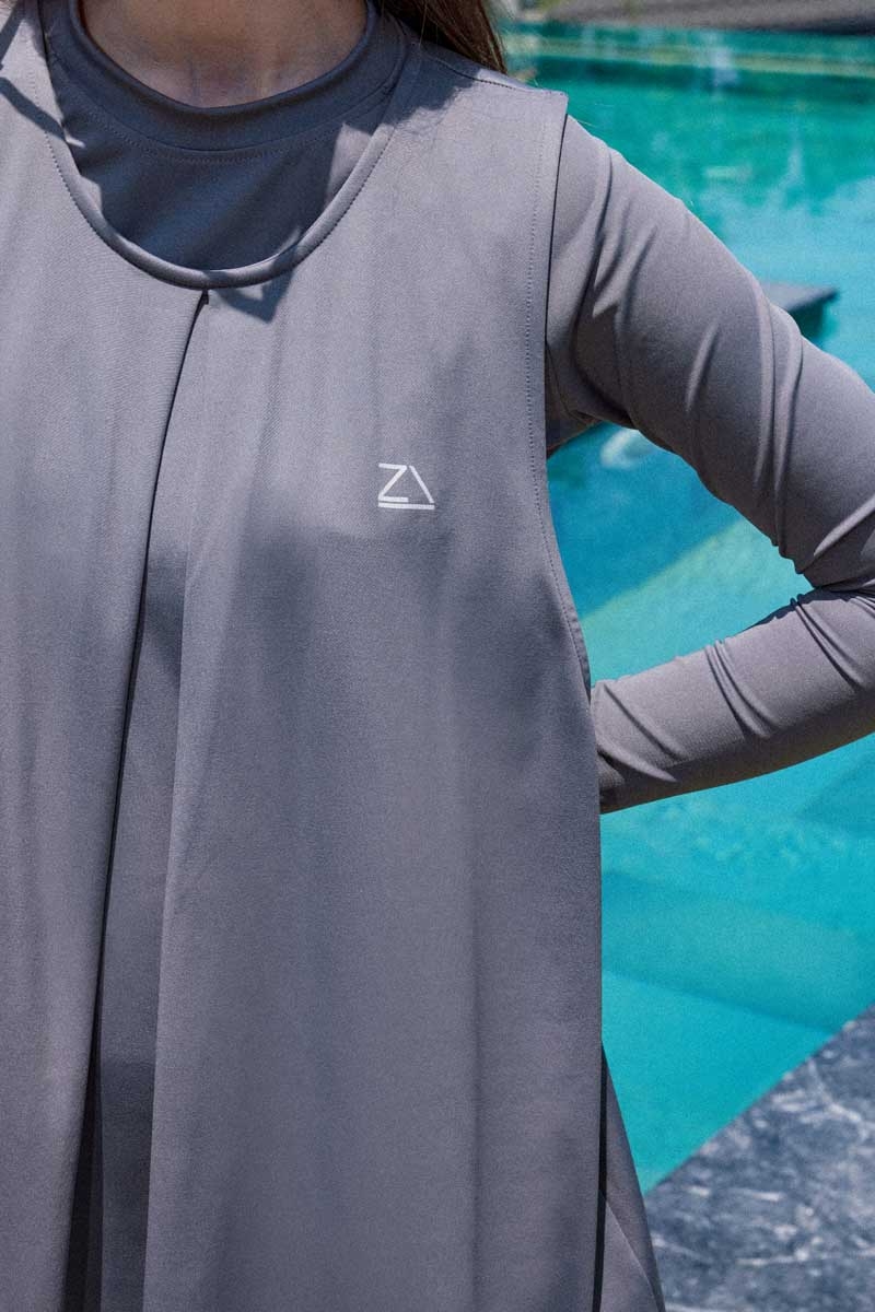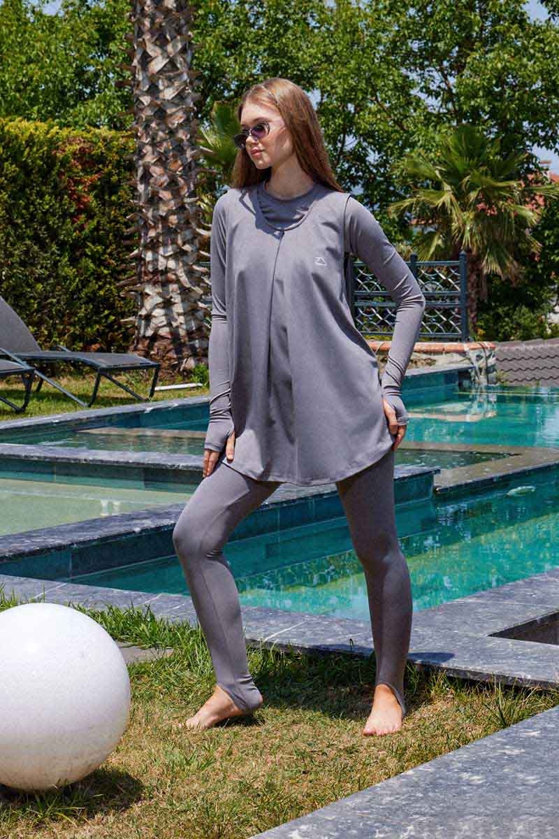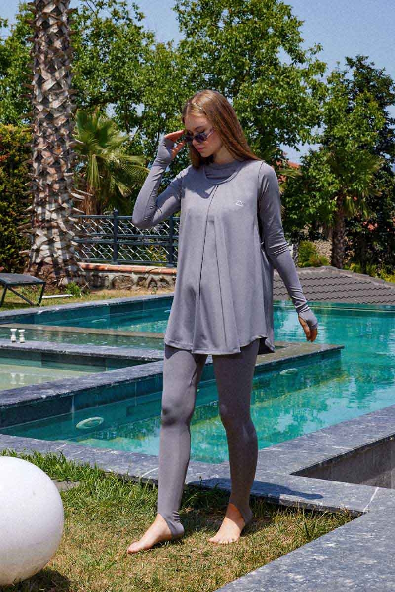 Jile Mayo Gri. Atlet bisiklet yakalıdır, kol kısmı sıfır koldur, A pilelidir, esnek kumaştır, deniz ve havuz kullanımında uygundur. (Şapka dahil değildir.)