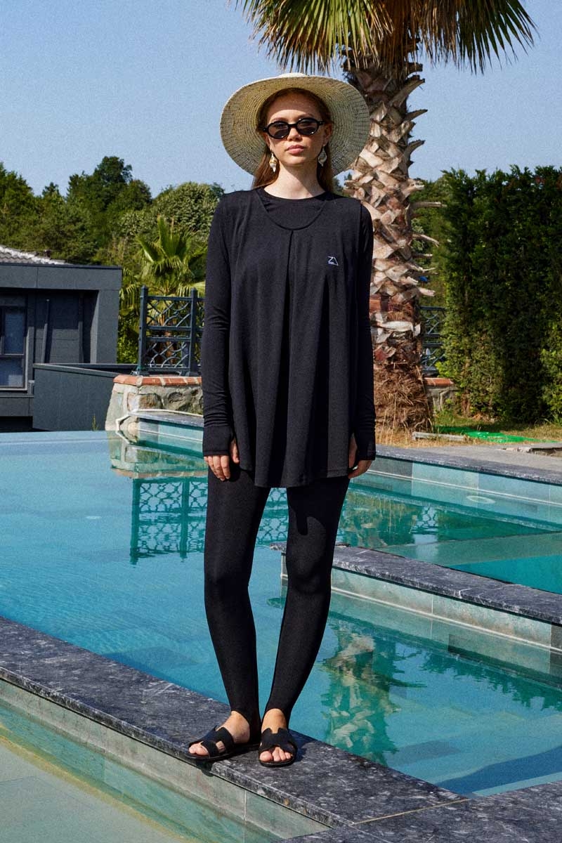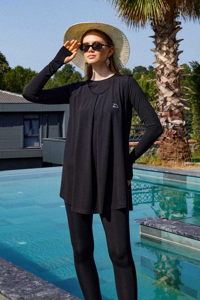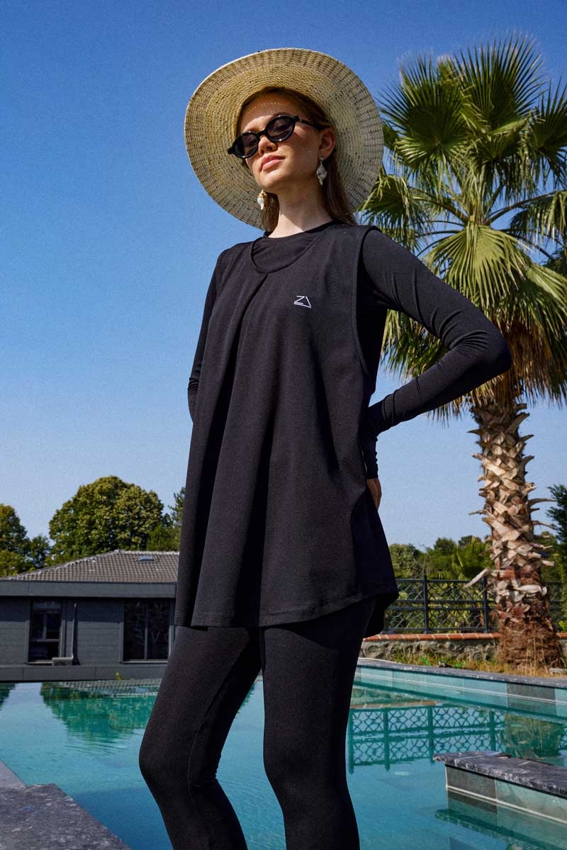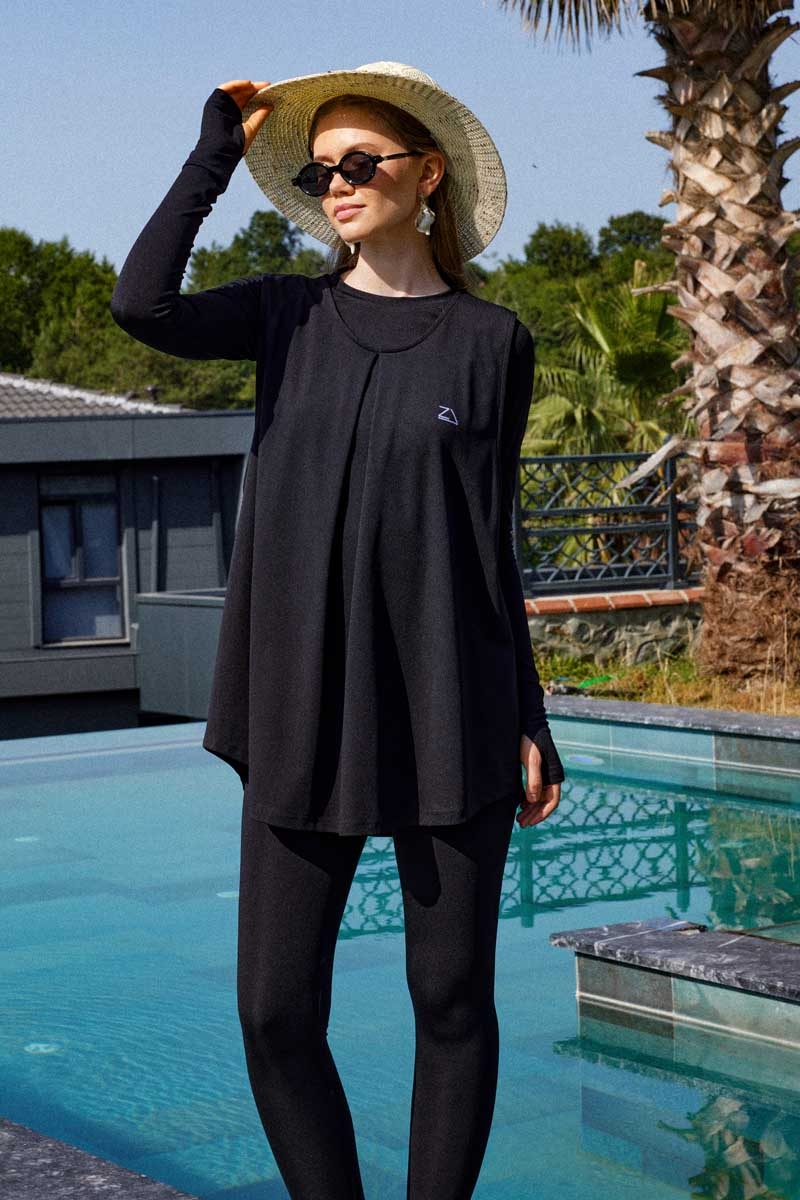 Jile Mayo Siyah. Atlet bisiklet yakalıdır, kol kısmı sıfır koldur, A pilelidir, esnek kumaştır, deniz ve havuz kullanımında uygundur. (Şapka dahil değildir.)
