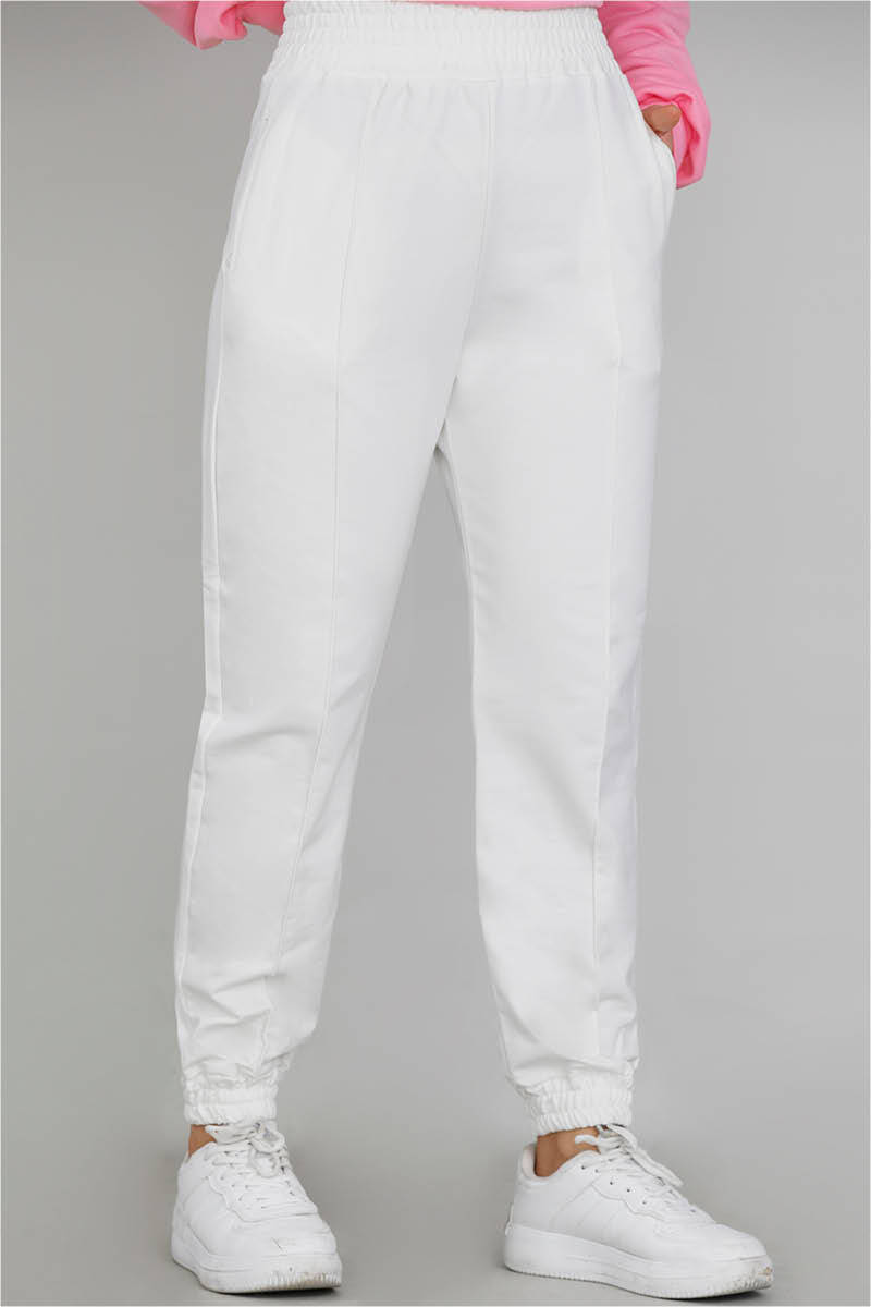 Thick elastication at the waist and hems, and front seam details.
