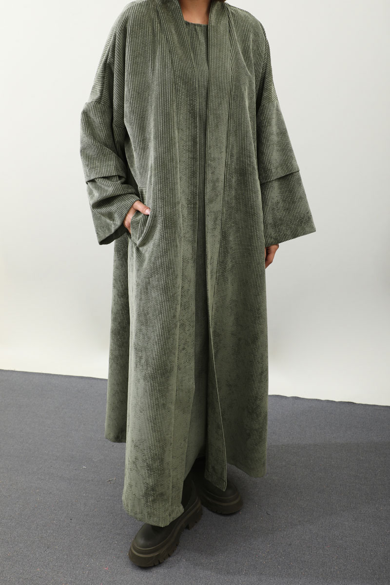 Kadife Abaya Takım Haki. Abaya arka beden çift tünel detaylıdır, biyelidir, düşük kolludur bol kalıptır, yandan gizli ceplidir, Astarsızdır. İç jile sıfır kolludur. Günlük kullanım ve özel günlerinizde tercih edebilirsiniz.