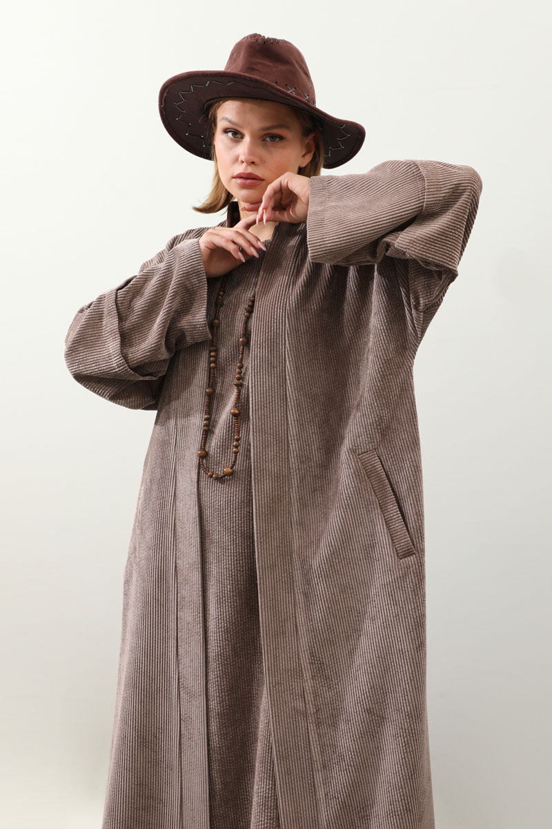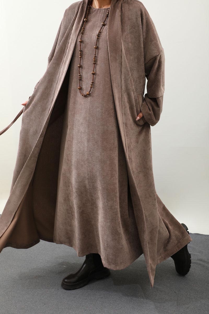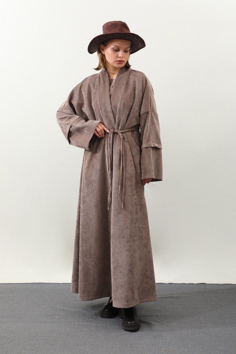 Kadife Abaya Takım Vizon. Abaya arka beden çift tünel detaylıdır, biyelidir, düşük kolludur bol kalıptır, yandan gizli ceplidir, Astarsızdır. İç jile sıfır kolludur. Günlük kullanım ve özel günlerinizde tercih edebilirsiniz.