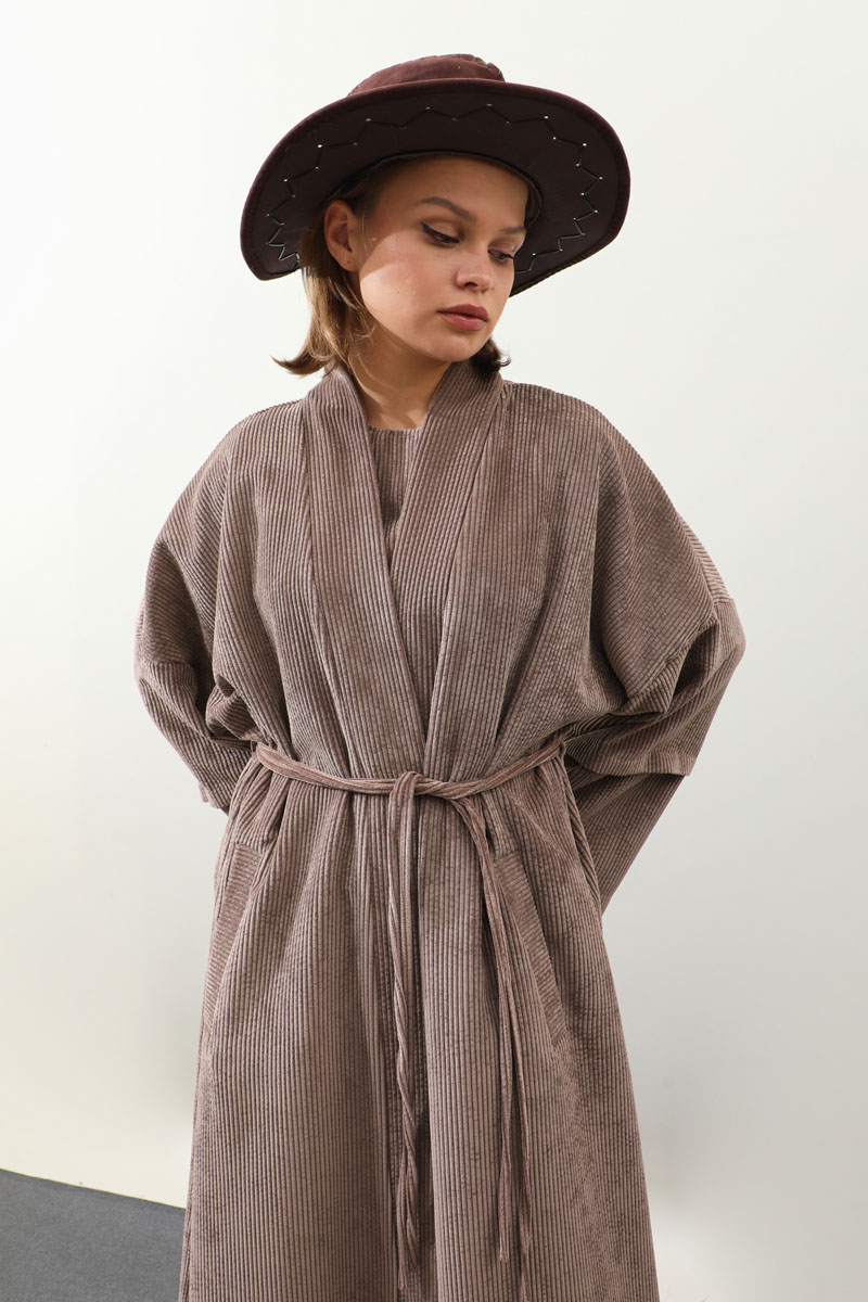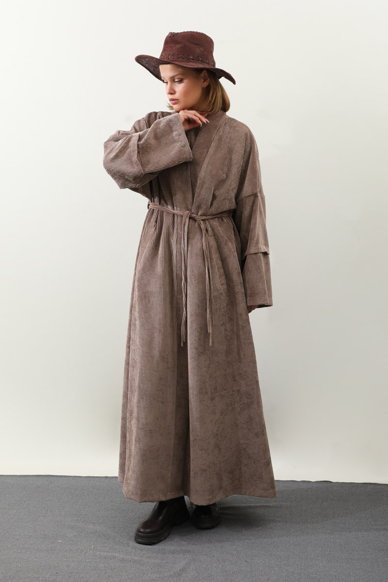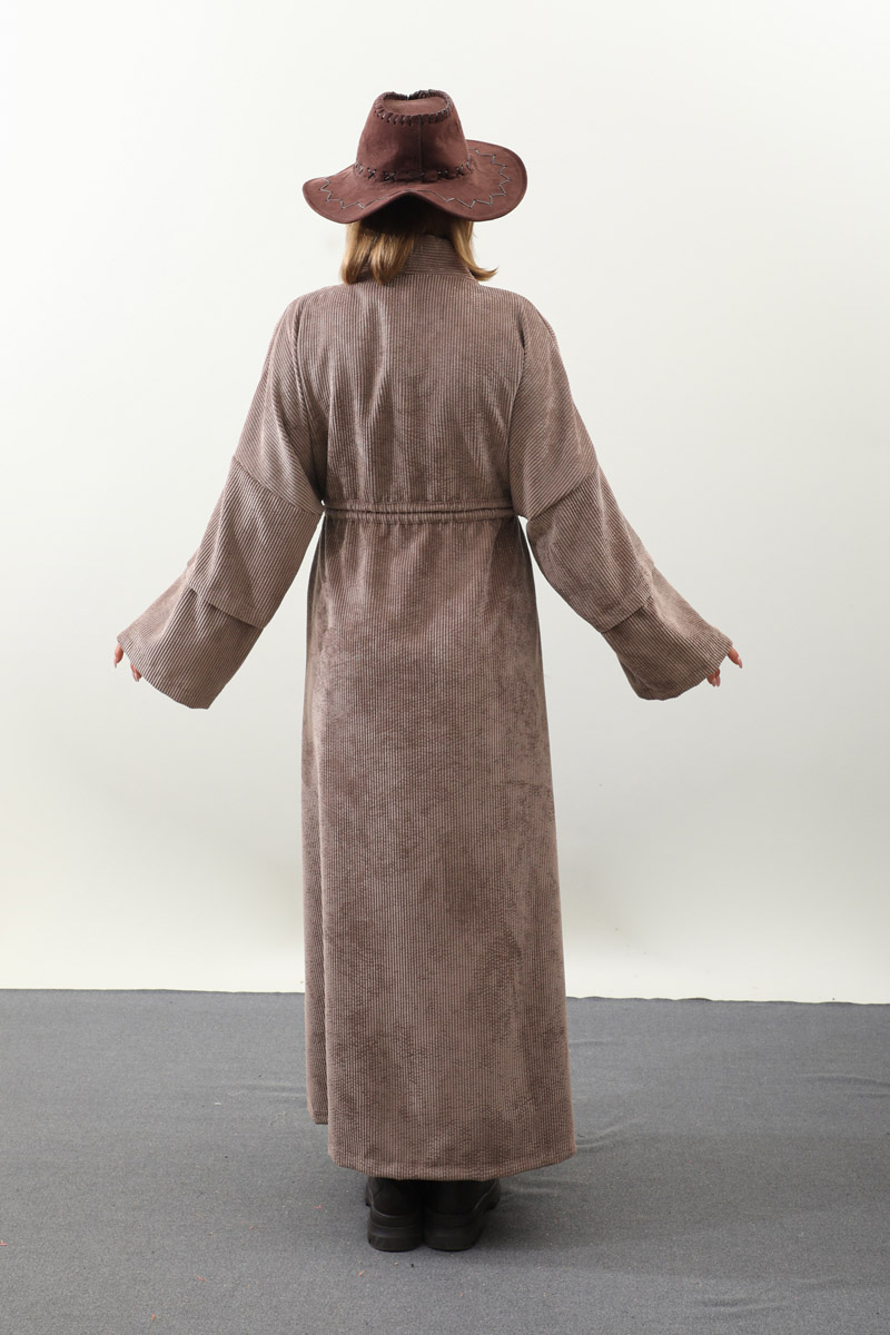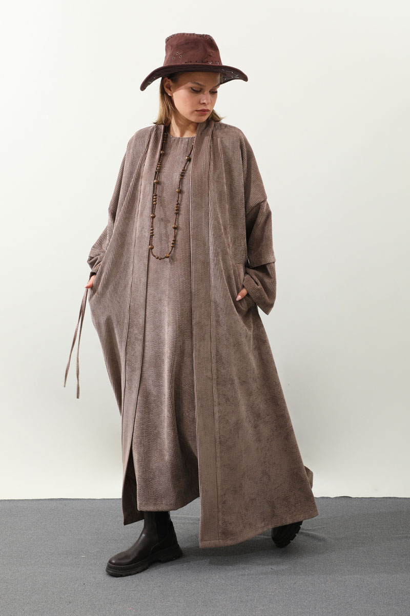 Kadife Abaya Takım Vizon. Abaya arka beden çift tünel detaylıdır, biyelidir, düşük kolludur bol kalıptır, yandan gizli ceplidir, Astarsızdır. İç jile sıfır kolludur. Günlük kullanım ve özel günlerinizde tercih edebilirsiniz.