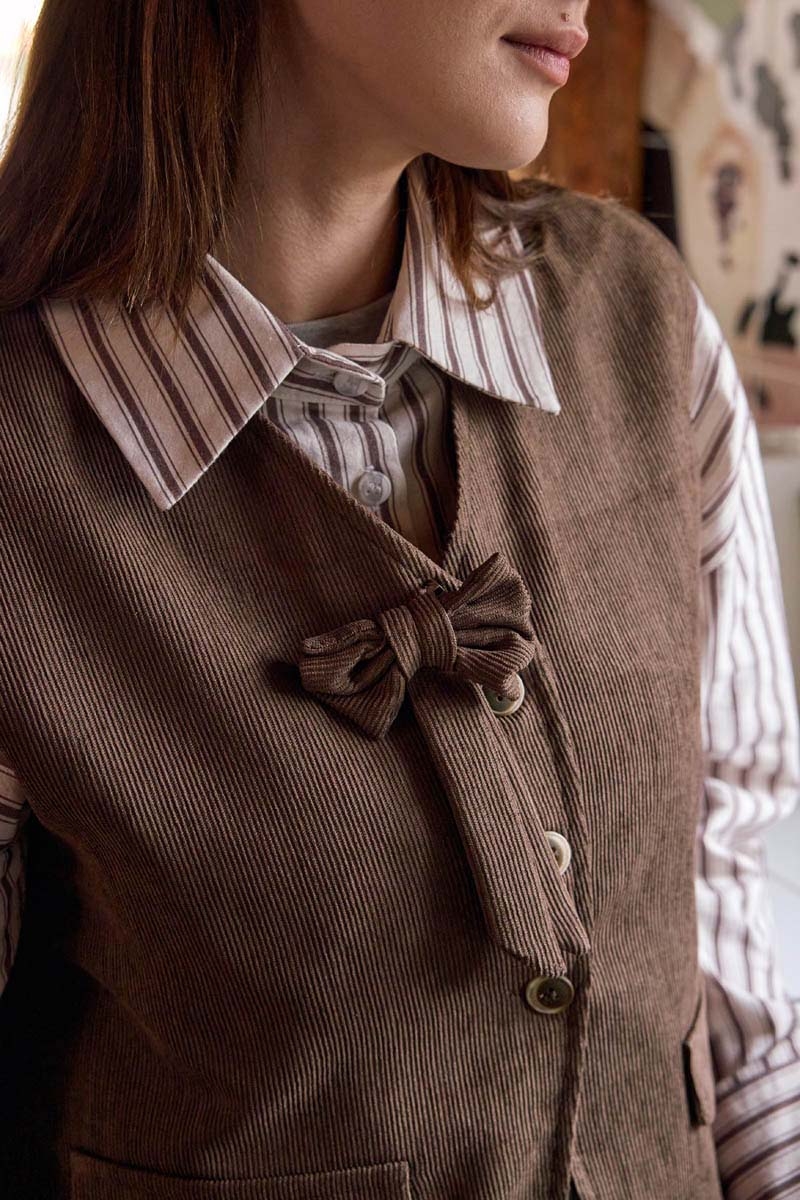 Kadife Etek Takım Kahverengi, nostaljik çizgilerden ilham alan tasarımıyla doğal ve sakin bir stil sunar. Fitilli kadife dokusu takıma derinlik ve karakter kazandırırken, yelek ve etek uyumu bütünlüklü bir görünüm oluşturur. Yeleğin ön yüzündeki bağcık detayı tasarıma özgün bir vurgu yaparken, etek formu rahat kesimiyle gün boyu konfor sağlar. Doğayla uyumlu renk tonu ve sade silueti sayesinde hem günlük kombinlerde hem de daha özenli şehir görünümlerinde tercih edilebilir. Triko üstler, basic gömlekler ve botlarla kolayca tamamlanabilen çok yönlü bir takımdır.