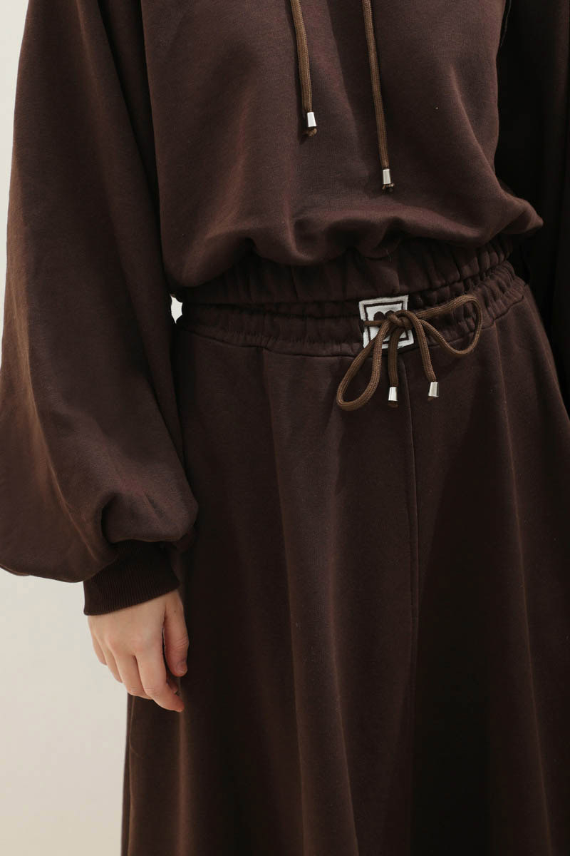 Kapişonlu Sweat Etek Takım Kahverengi. Kapişonludur bilekten ve belden lastiklidir. pis dikiş detaylıdır, reglan kolludur. Etek kloş olup belden lastikli ve bağcıklıdır. Ortadan dikiş detayldır, cepsizdir. üç iplik olduğundan iç göstermez Günlük kullanım ve özel günlerinizde tercih edebilirsiniz.