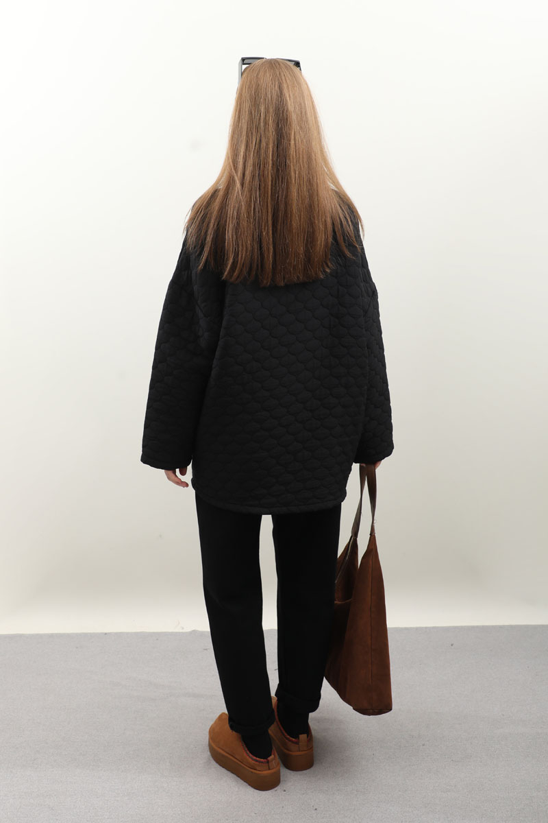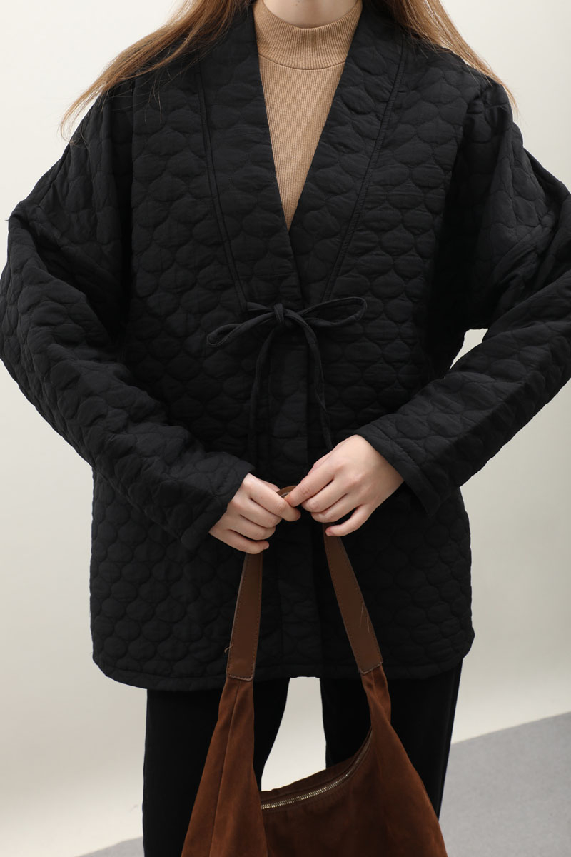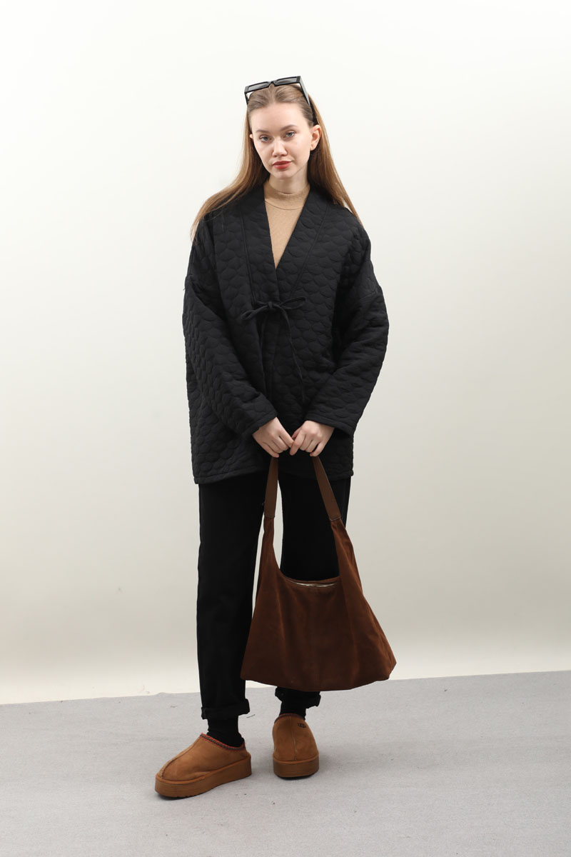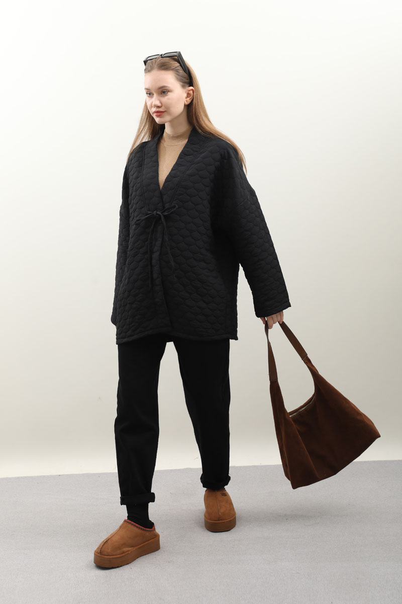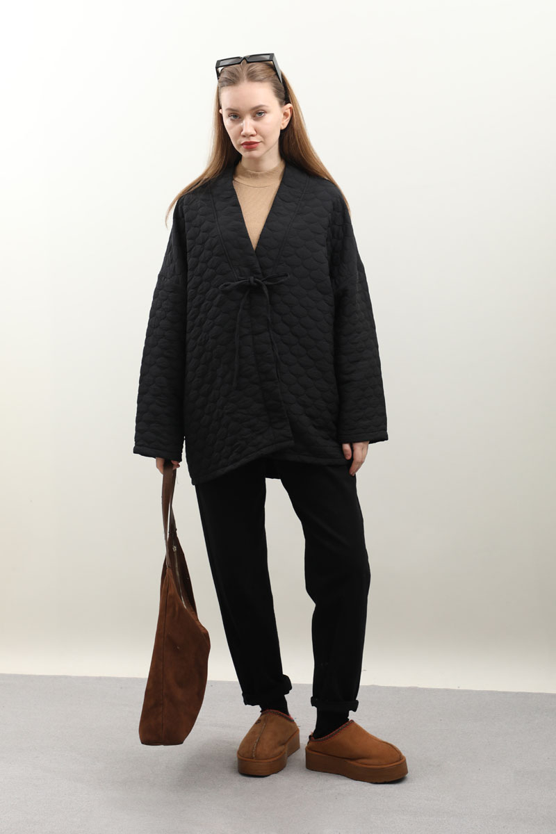 Kapitone Kimono Ceket Siyah. Düşük omuzlu, önden bağlamalı, astarsız, cepsiz, kimono yaka. Hafif bir dokuya sahiptir, bahar ve kış aylarında tercih edebilirsiniz.
